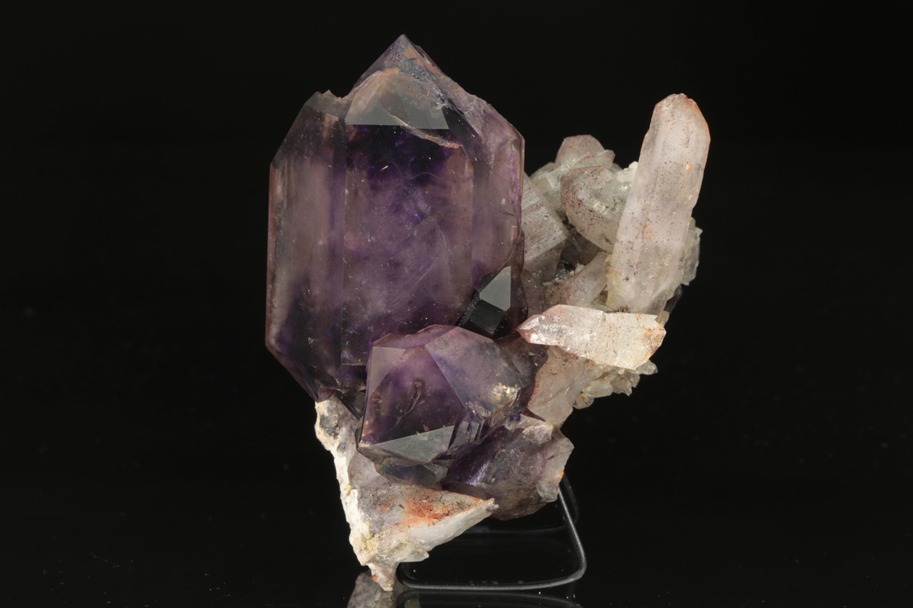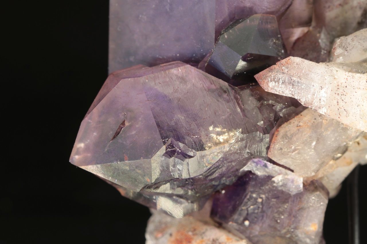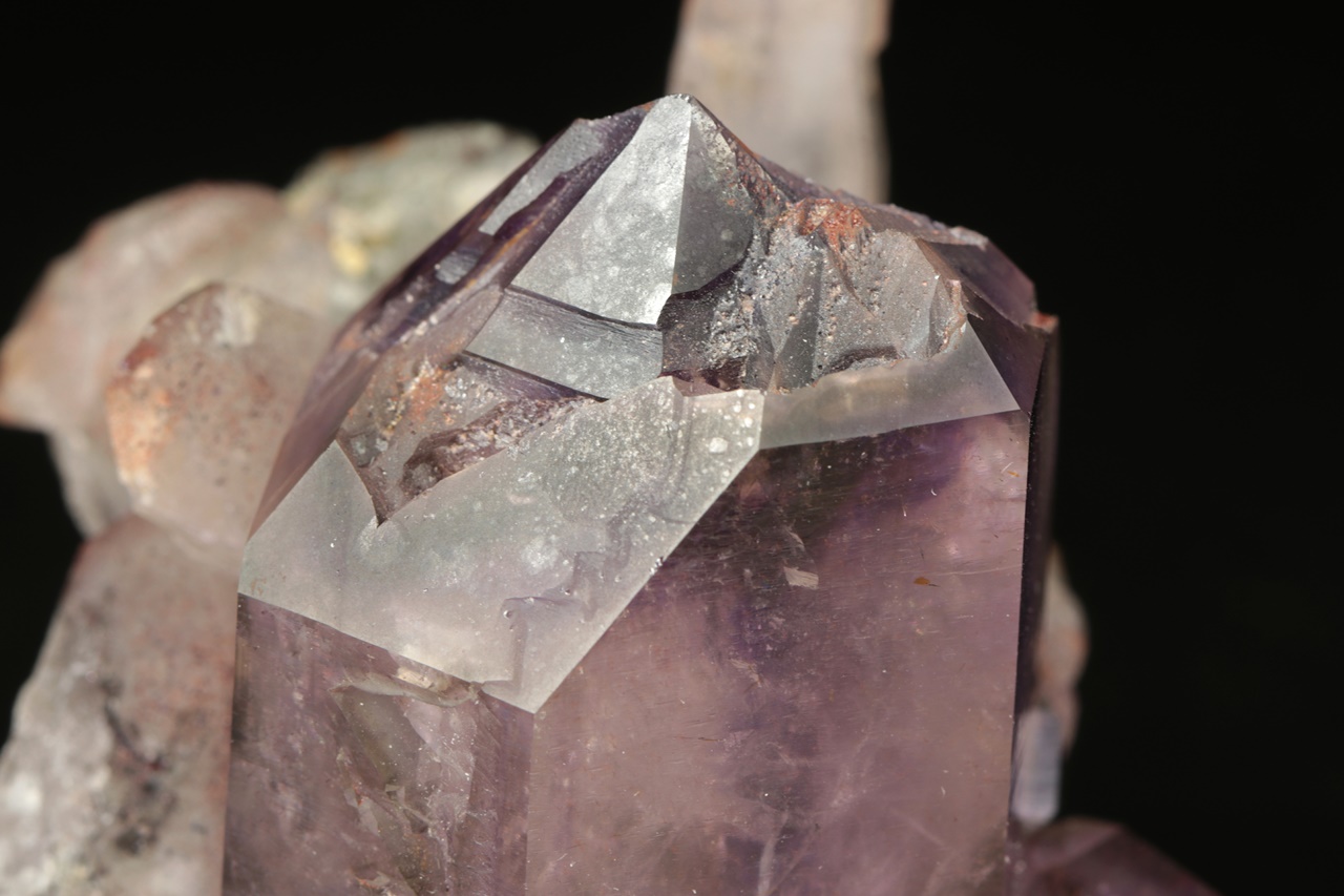 Großer, intensiv violetter, taubennistähnlicher Amethyst von der Größe 6 × 4 cm, der auf einem Aggregat älterer Kristalle eines helleren Amethysts wächst.