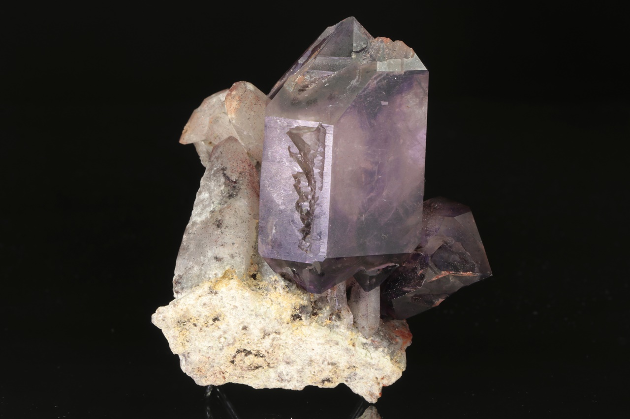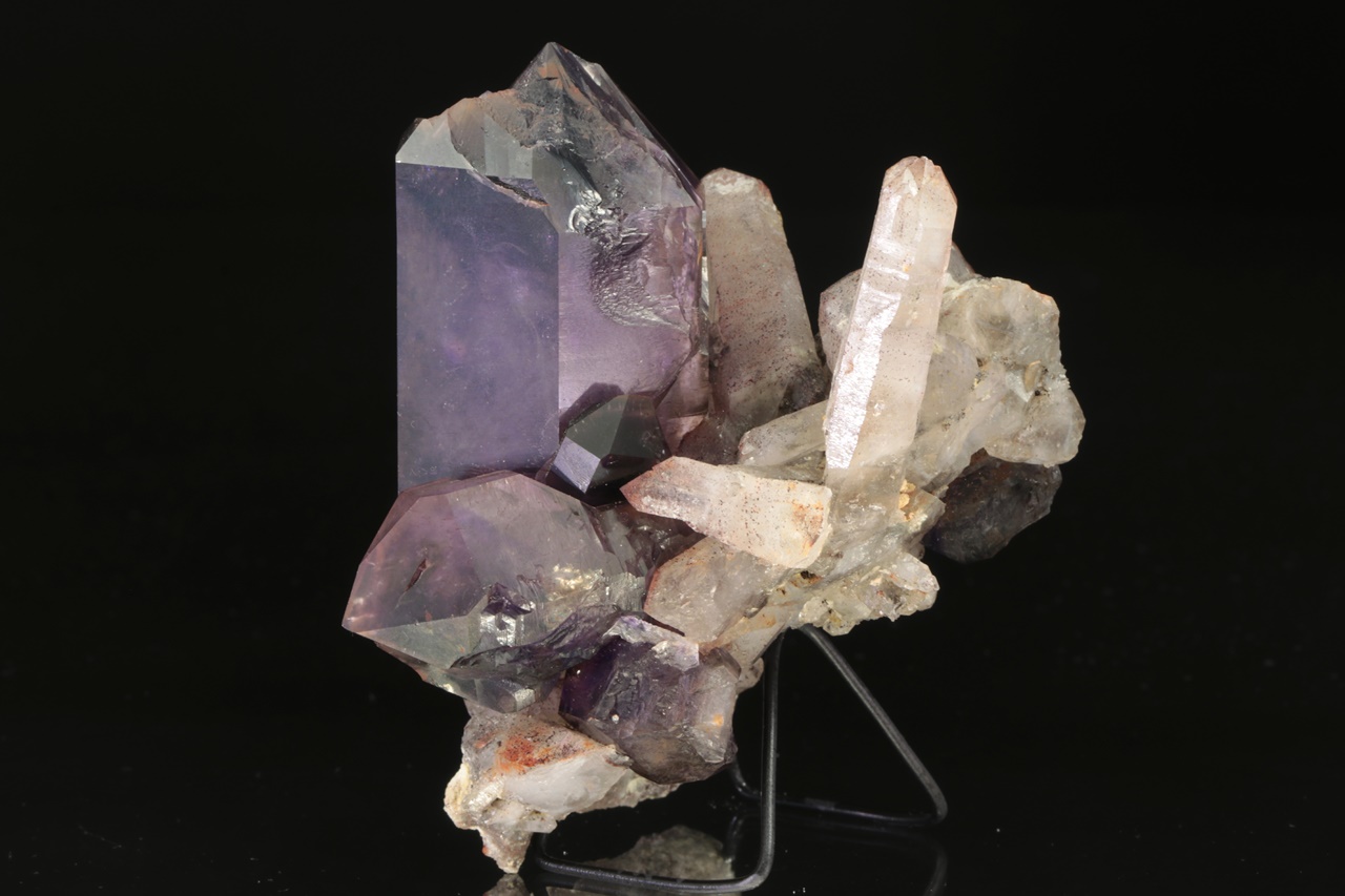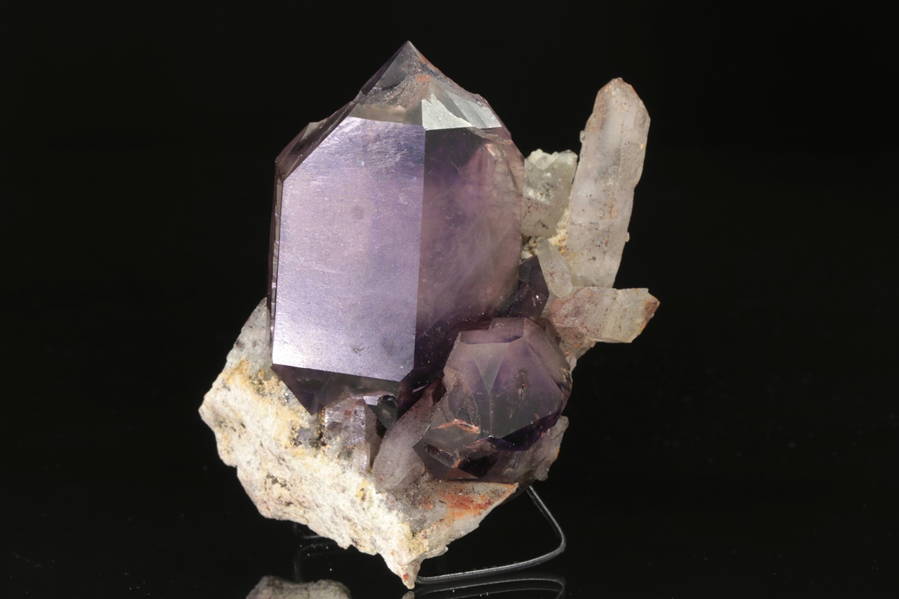 Großer, intensiv violetter, taubennistähnlicher Amethyst von der Größe 6 × 4 cm, der auf einem Aggregat älterer Kristalle eines helleren Amethysts wächst.