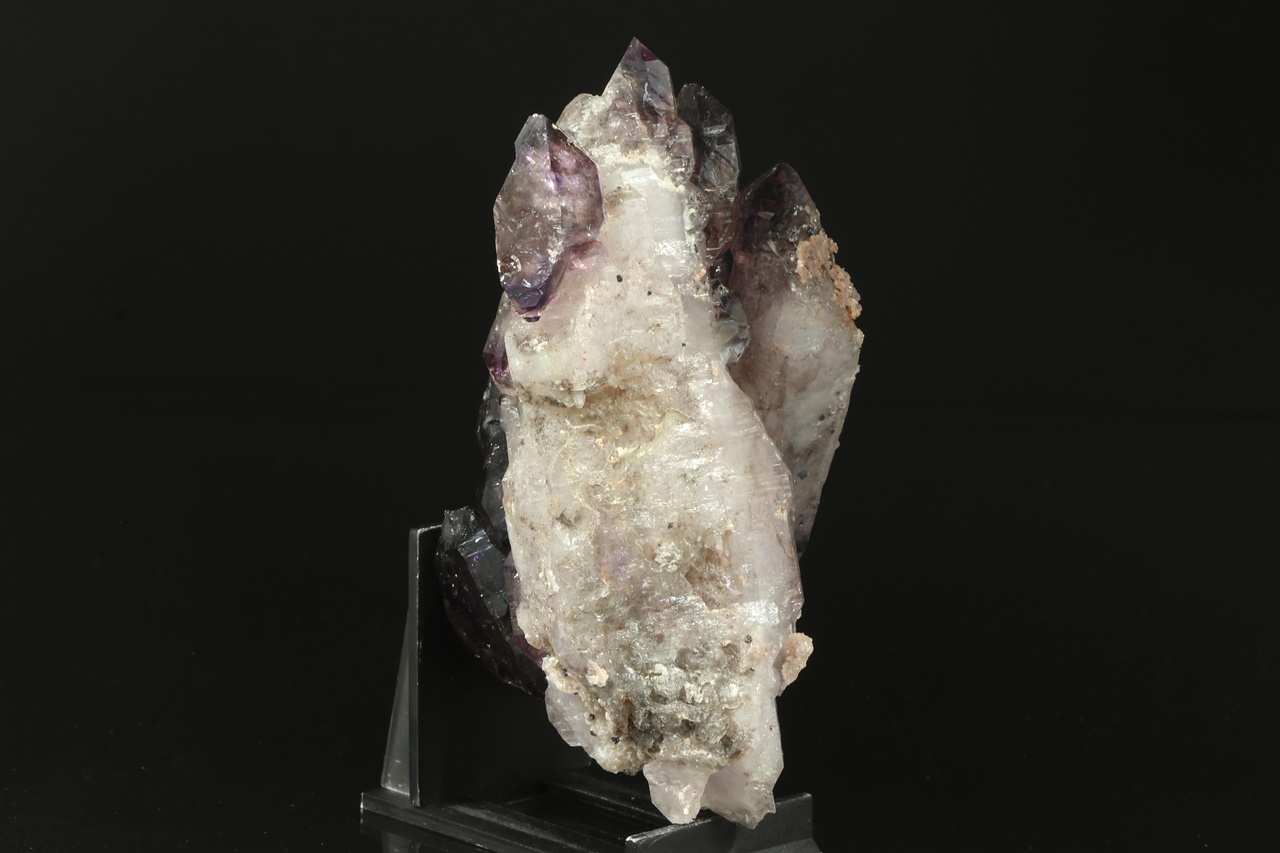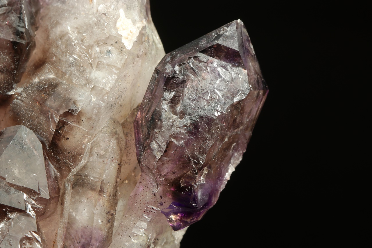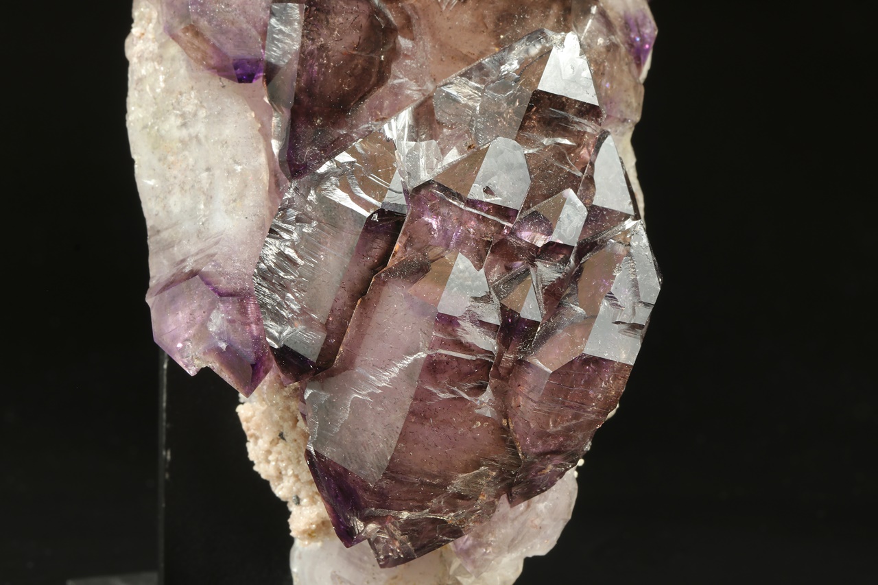 Wunderschön gefärbter hypoparalleler Cluster von beidseitig terminierten Amethysten, gewachsen auf einem älteren Quarz.