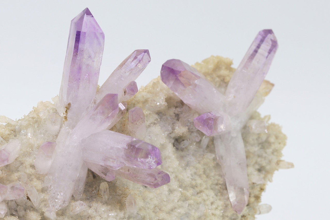 Kristalle von sehr reinem Amethyst, gewachsen auf kontrastreichem weißen Quarz. Der größte Kristall ist 3 cm groß.
