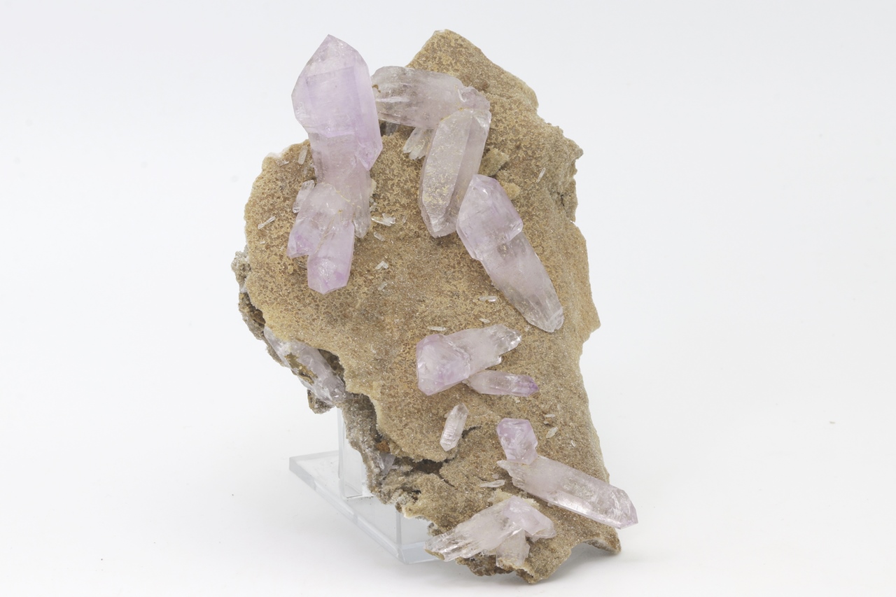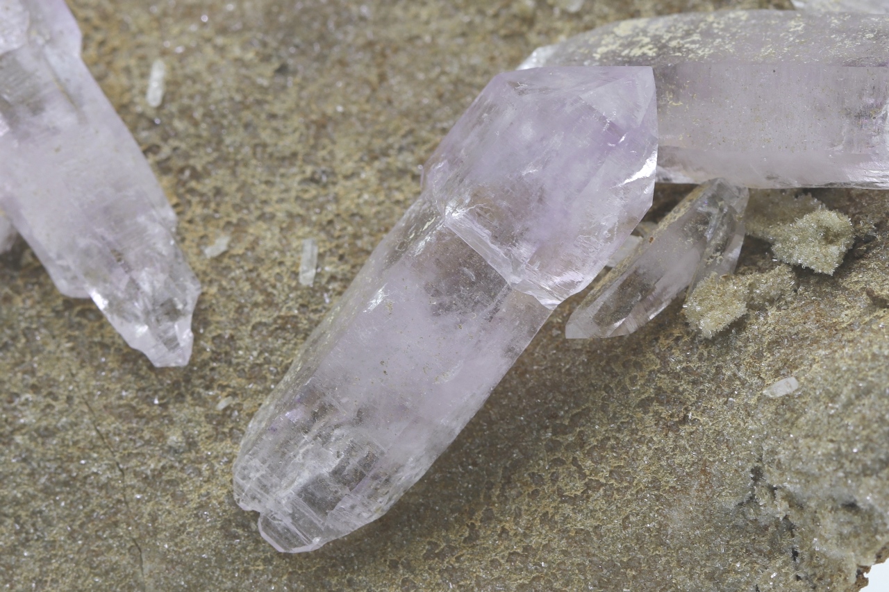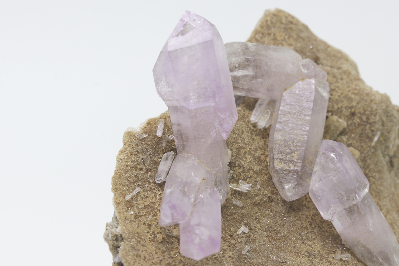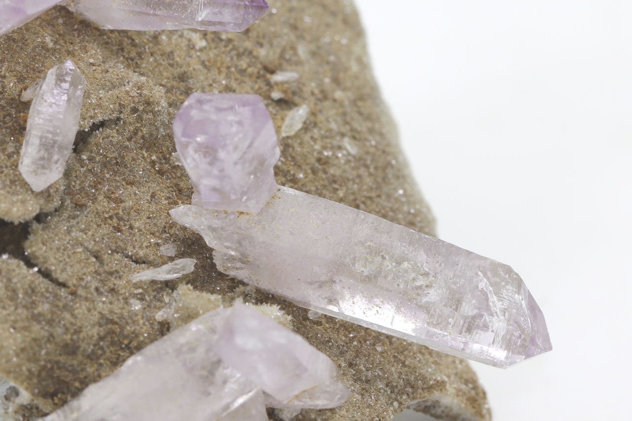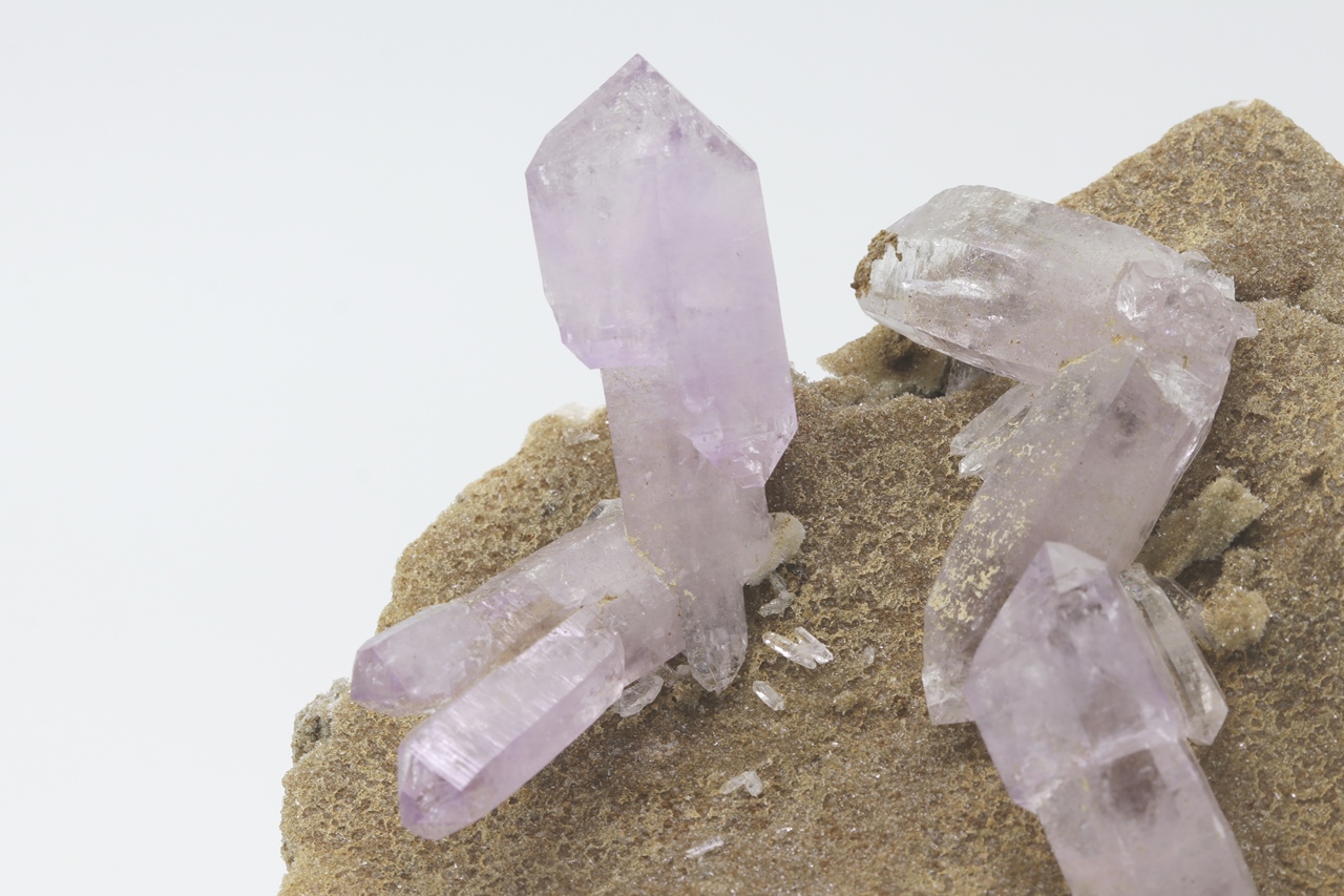 Zepter-Kristalle – einige doppelseitig terminiert – sehr reine, violette Amethyste gewachsen auf einem kontrastierenden beige-farbenen Grund. Der größte Kristall ist 4 cm groß.