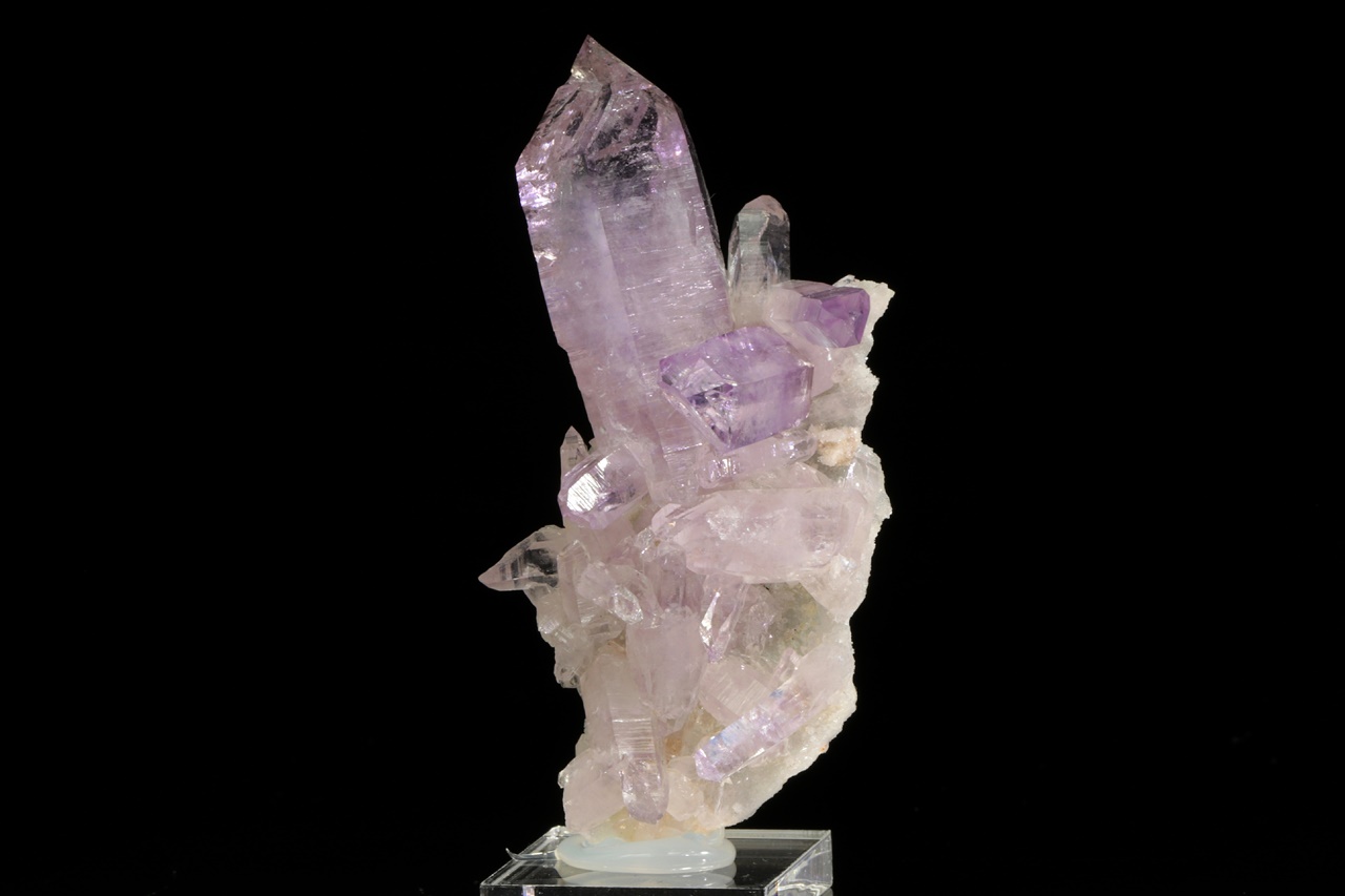 Krystalle aus hellem, klarem Amethyst, die auf einer Quarzunterlage gewachsen sind, zwischen denen ein 4 cm großer, zepterförmiger Kristall mit skelettartiger Entwicklung hervorsticht.