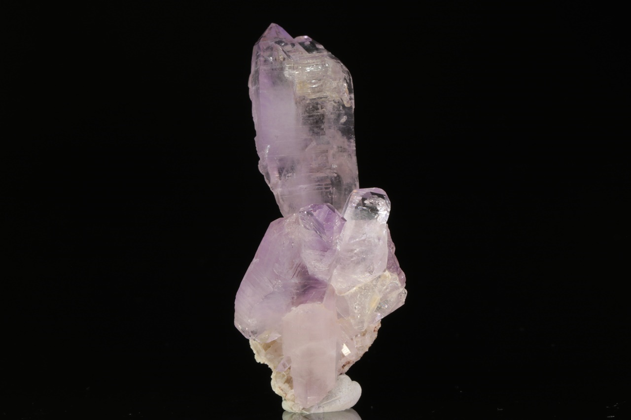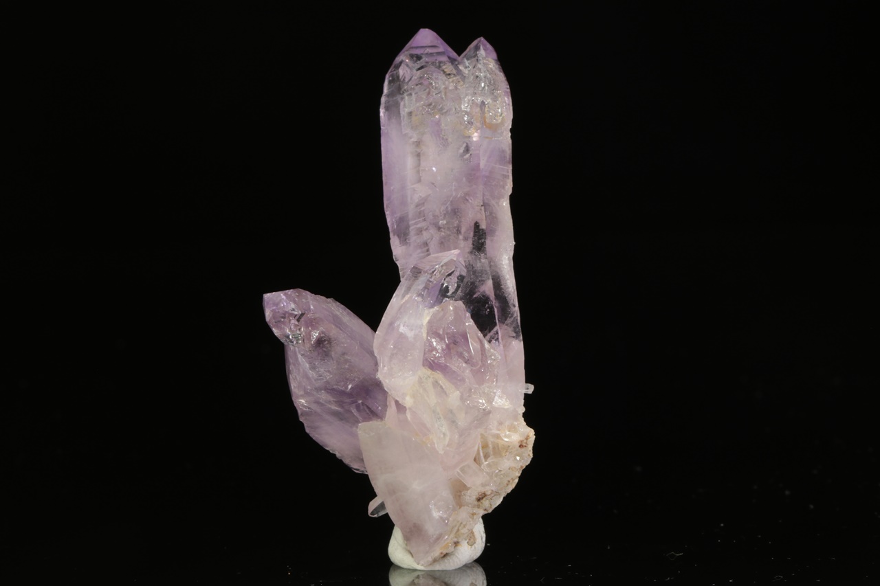Srostlice Kristalle des hellvioletten Amethysts, wobei ein 5 cm langer Kristall ein skelettartiges Szepter bildet.