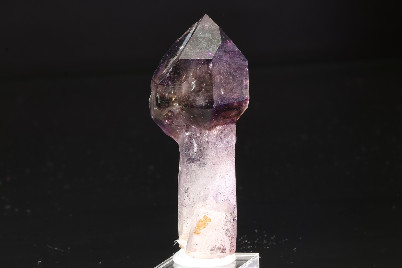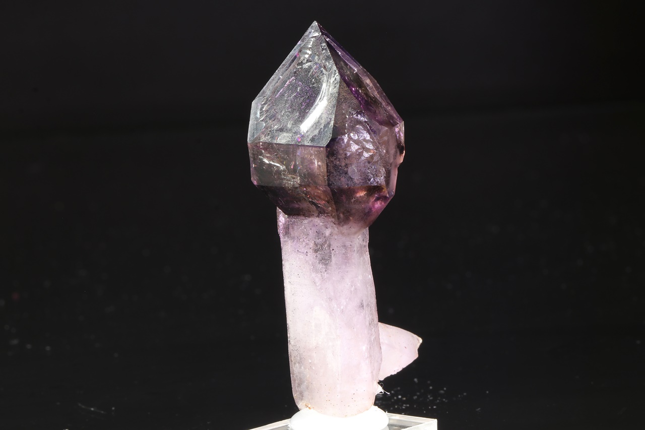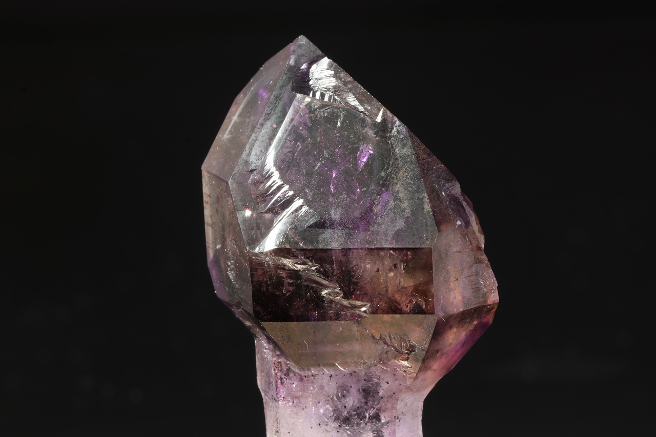 Unbeschädigter Amethyst-Taubenschwanz von 3,5 × 3 cm Größe, gewachsen auf einer Verwachsung von zwei Quarzen.
