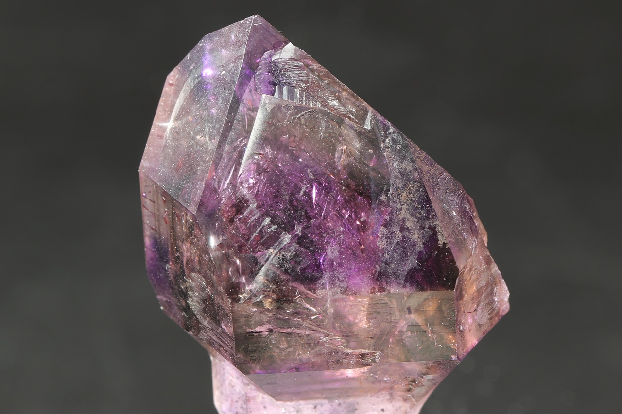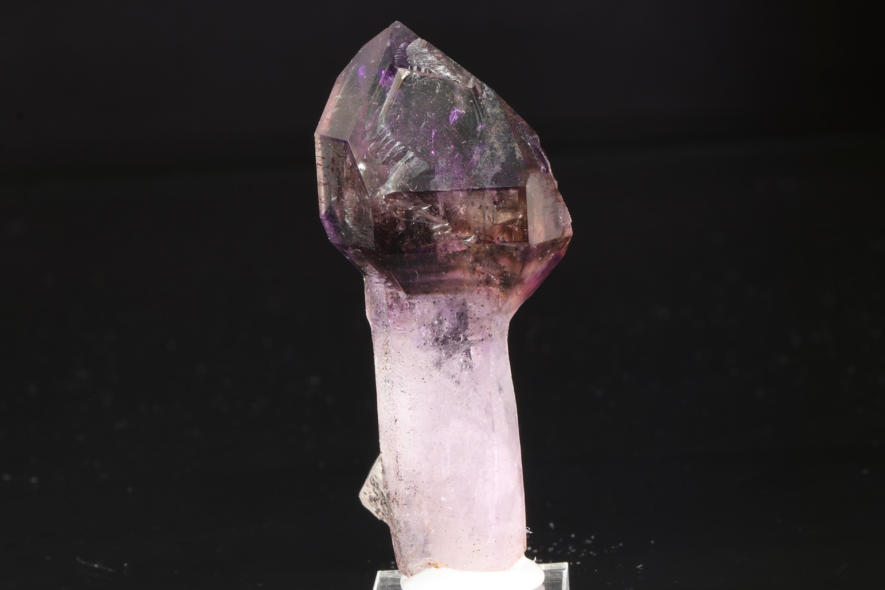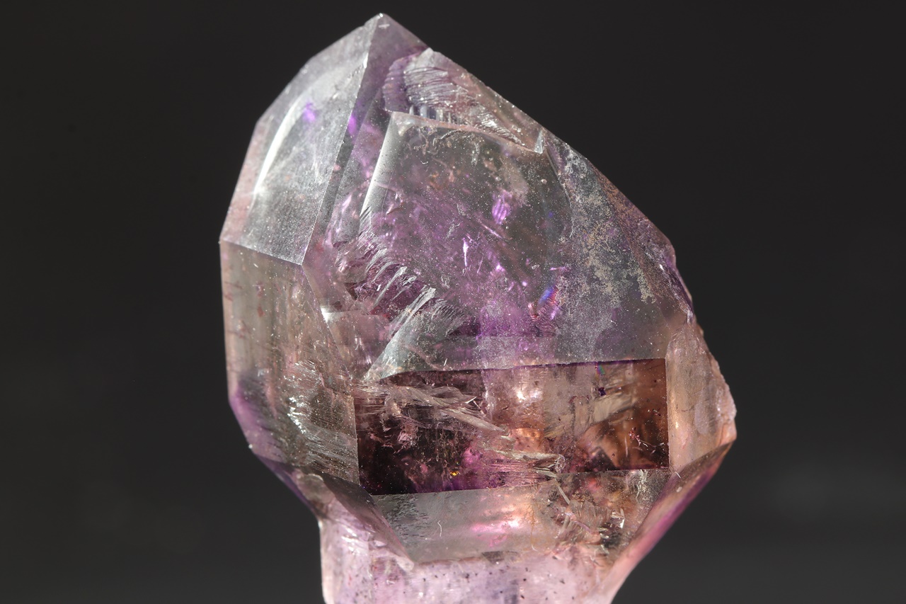 Unbeschädigter Amethyst-Taubenschwanz von 3,5 × 3 cm Größe, gewachsen auf einer Verwachsung von zwei Quarzen.