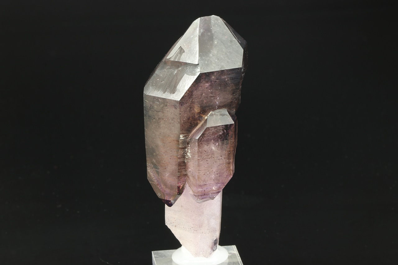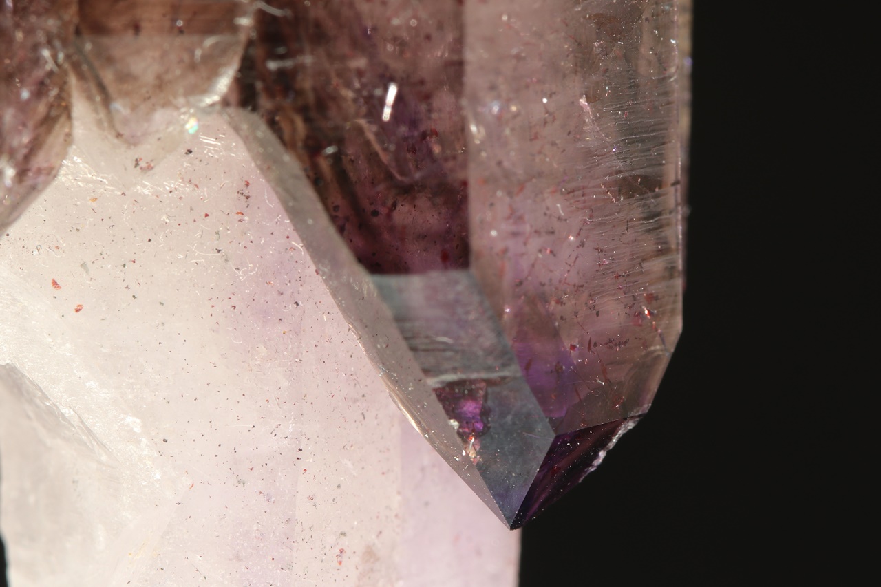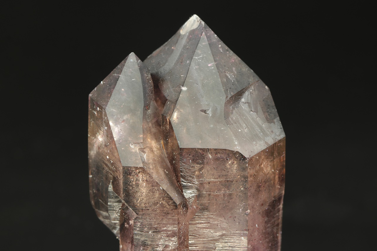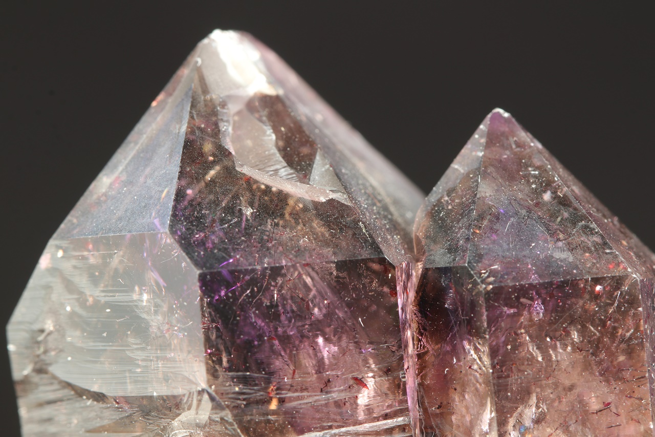 Hypoparallele Cluster von glänzenden Kristallen des zonalen Amethysts, die sogenannte Taubenschwanz bildend, auf älterem Quarz gewachsen. Die Größe des Taubenschwanzes beträgt 6,5 cm.
