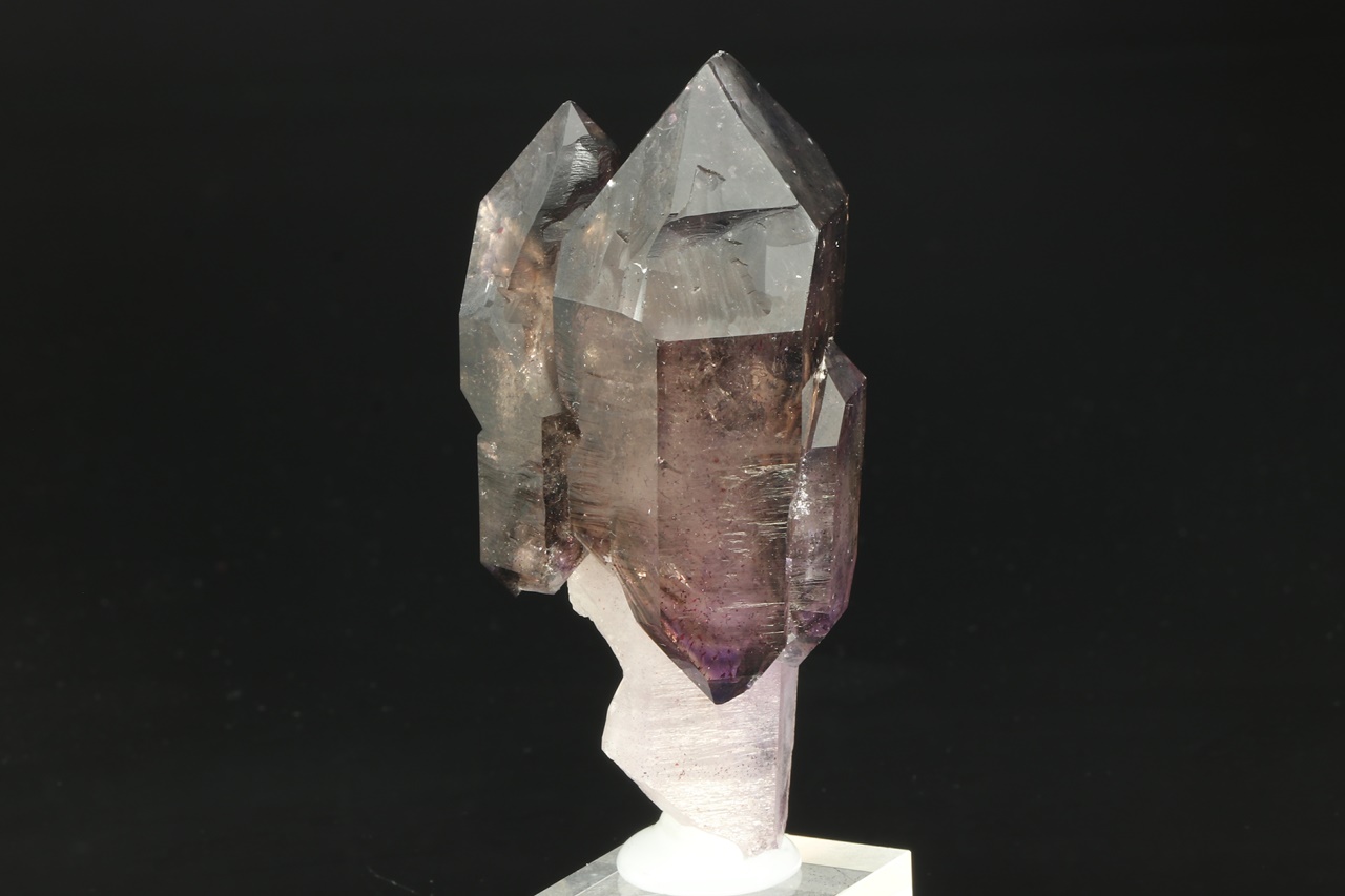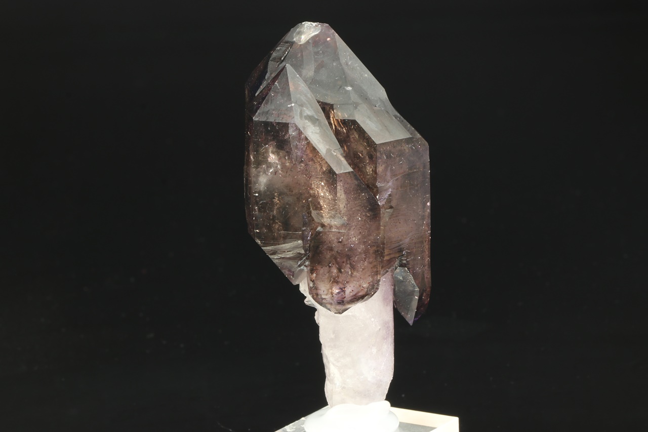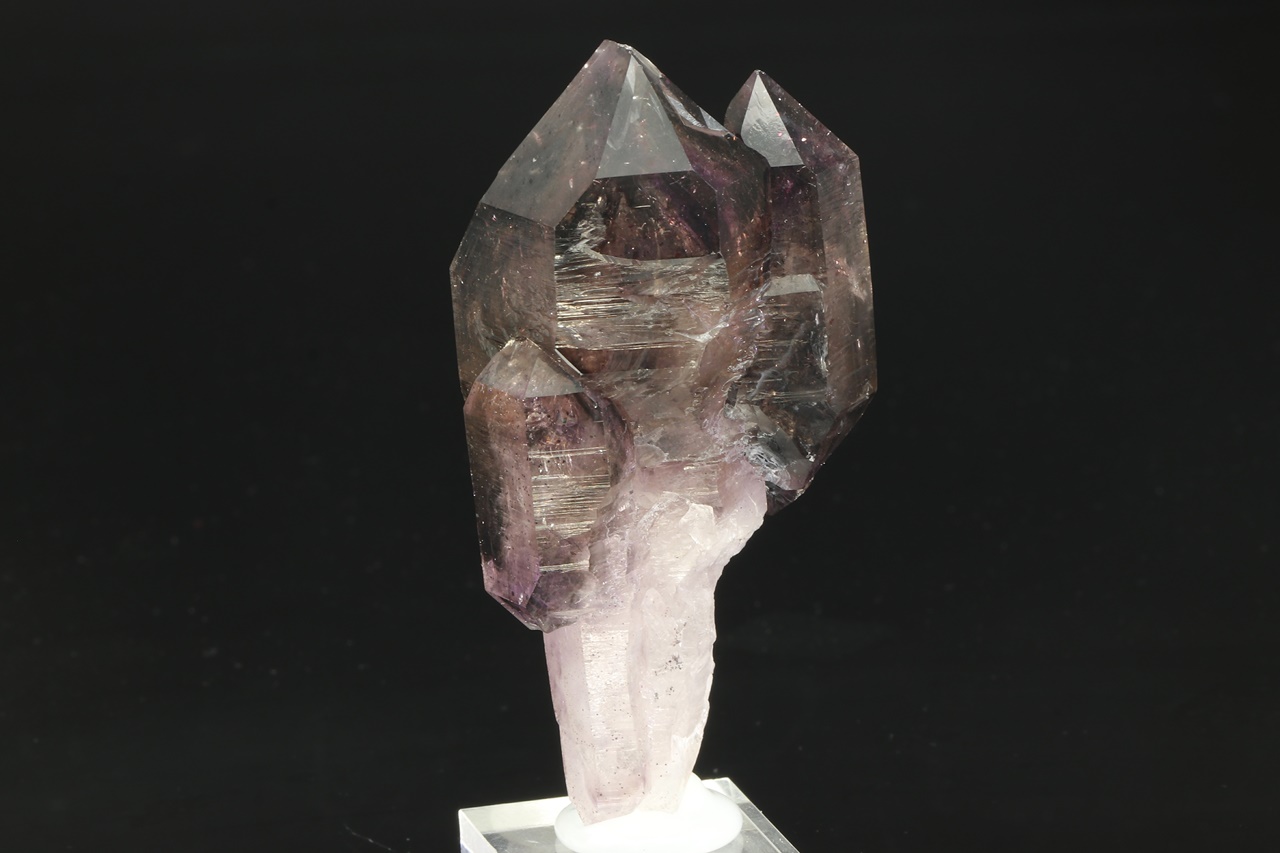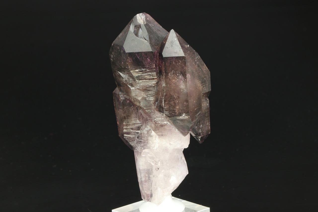 Hypoparallele Cluster von glänzenden Kristallen des zonalen Amethysts, die sogenannte Taubenschwanz bildend, auf älterem Quarz gewachsen. Die Größe des Taubenschwanzes beträgt 6,5 cm.