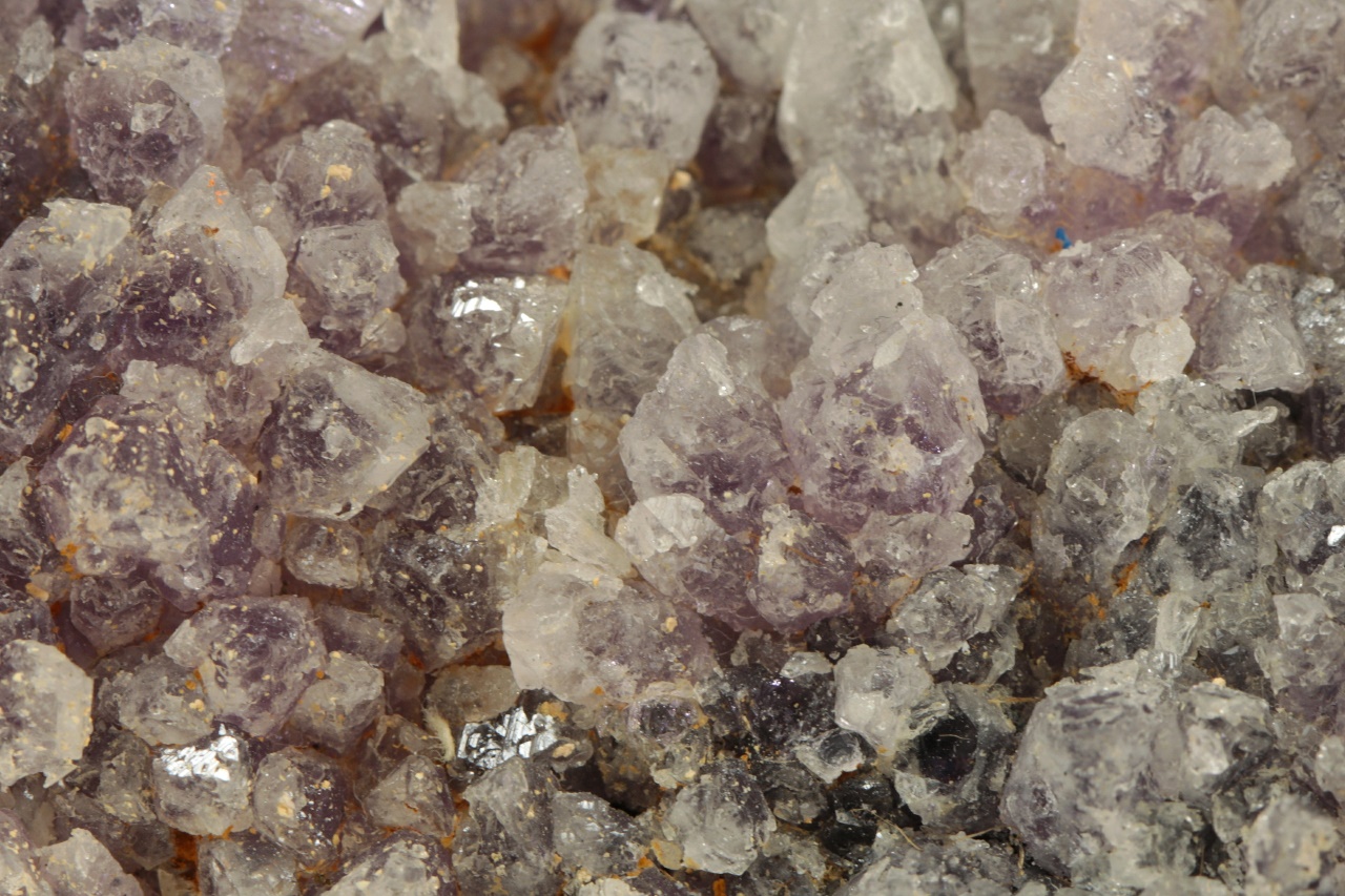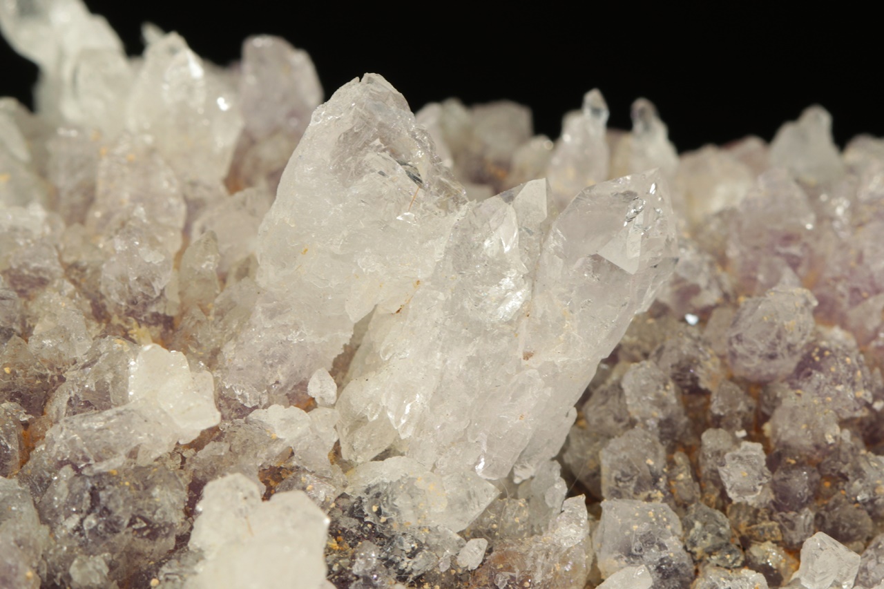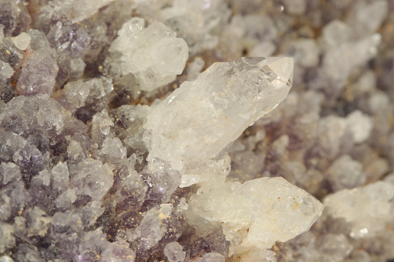 Kristalle bis zu zwei Zentimeter groß, die auf einer älteren Amethystdruse wachsen.