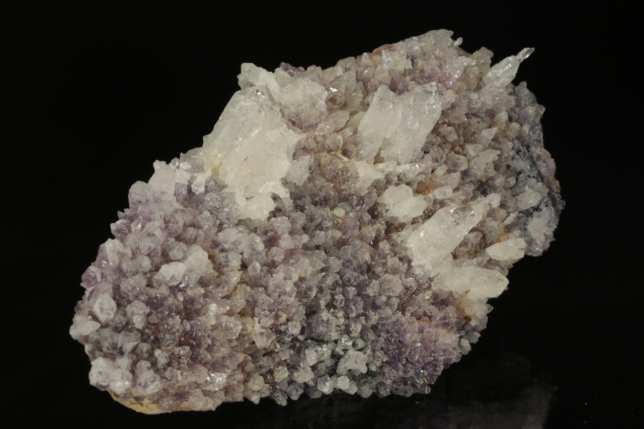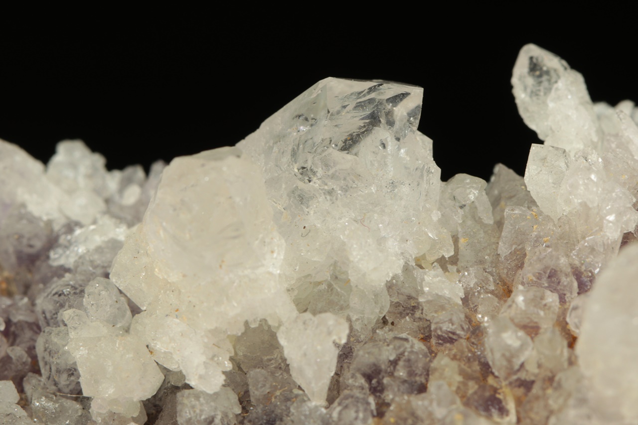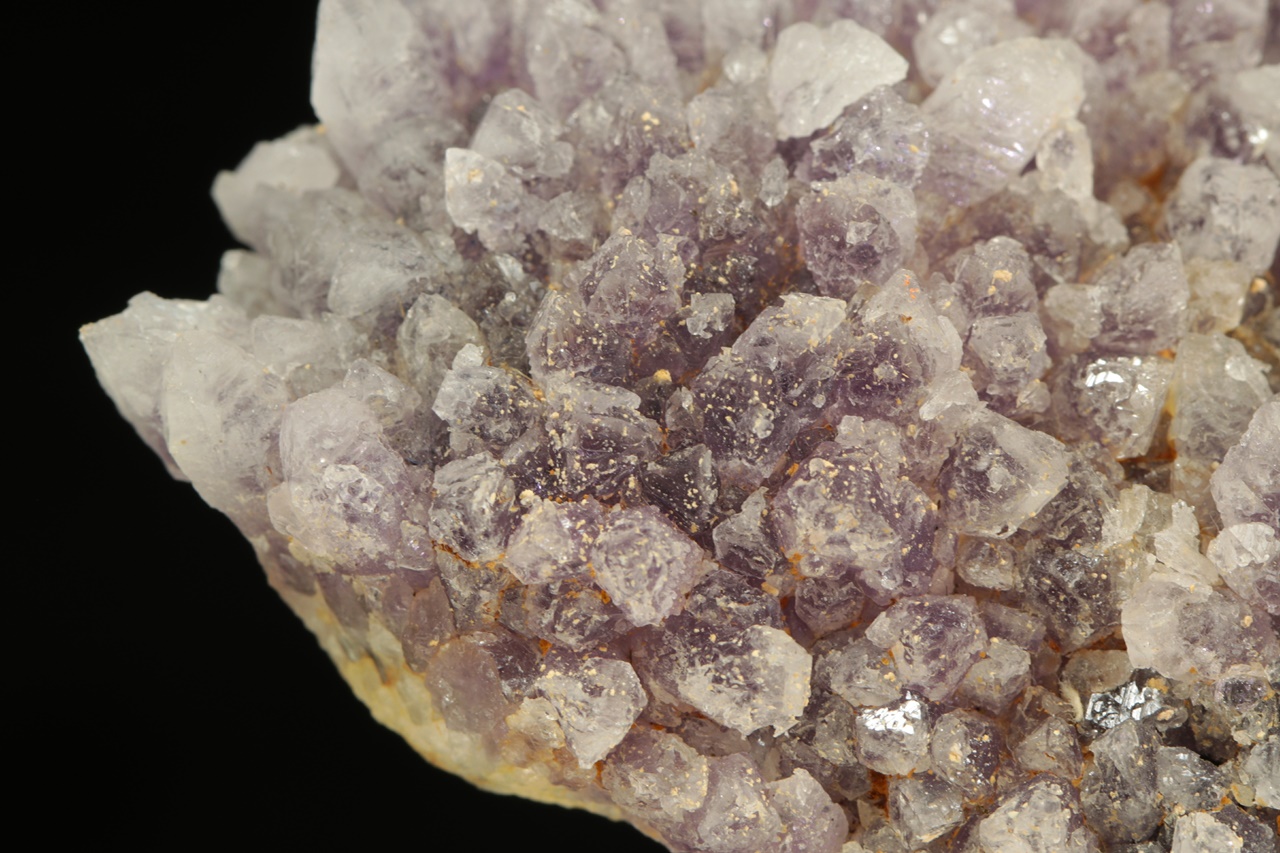 Kristalle bis zu zwei Zentimeter groß, die auf einer älteren Amethystdruse wachsen.