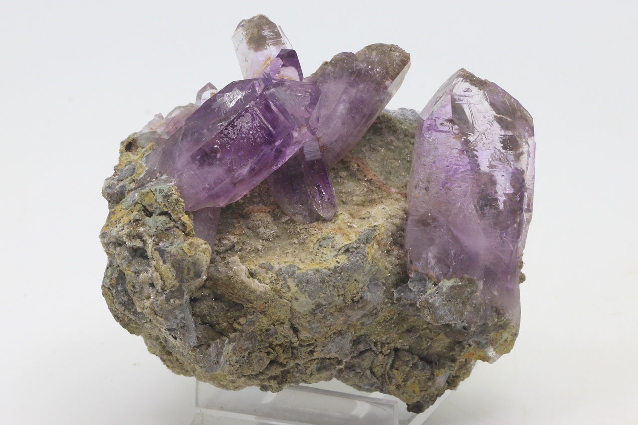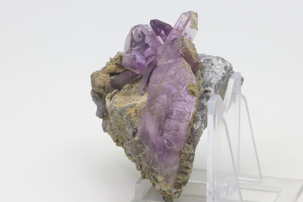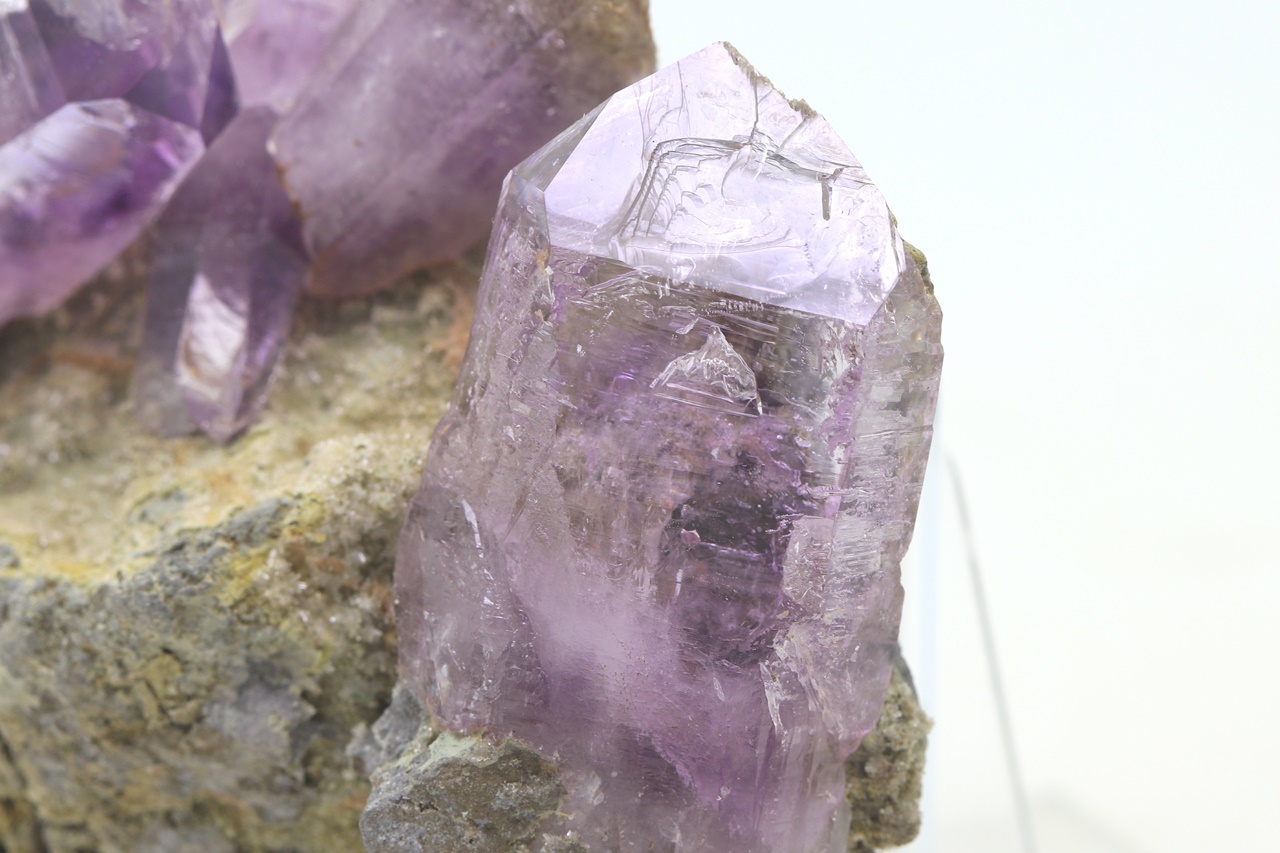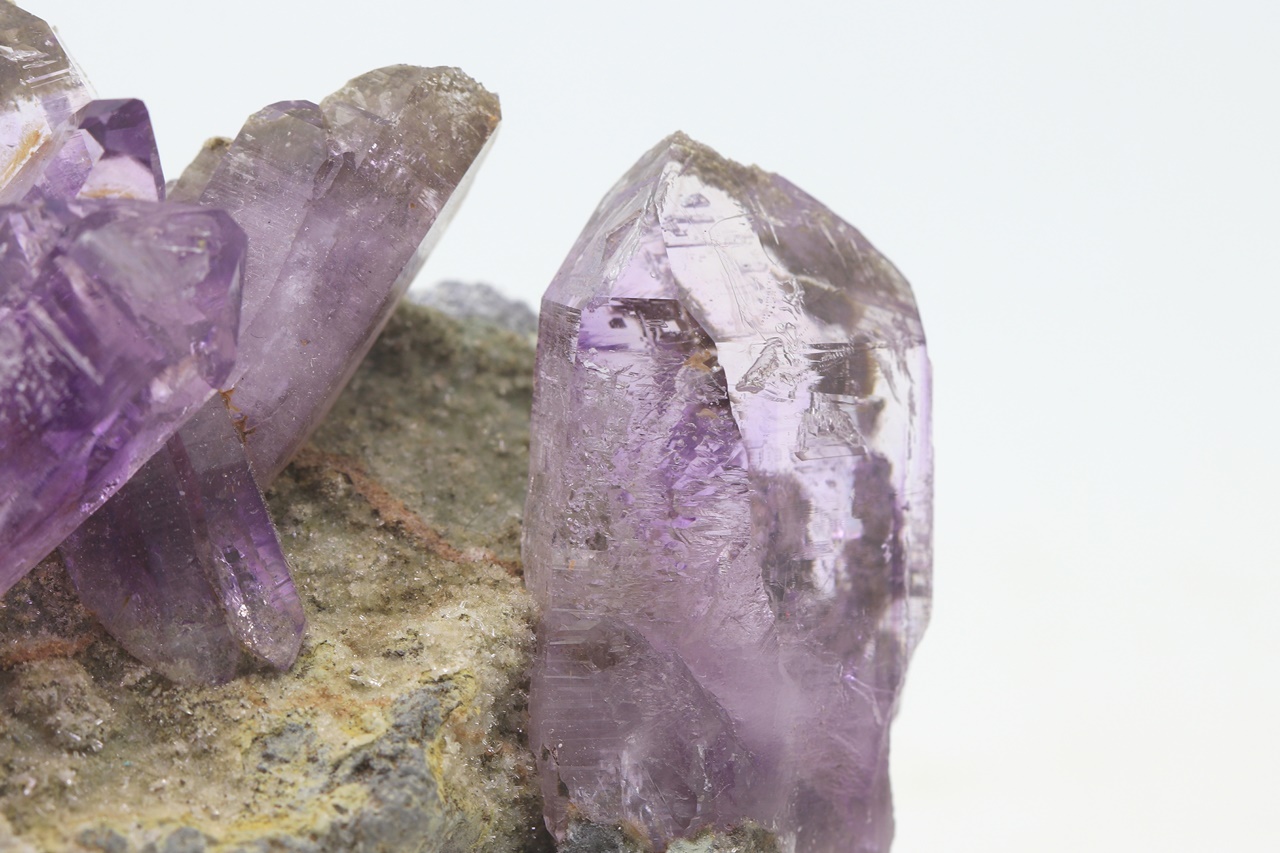 Wunderschönes Exemplar von reinen, glänzenden Amethystkristallen gewachsen auf einer Unterlage. Der größte Kristall im linken Teil des Exemplars ist 5 cm groß.