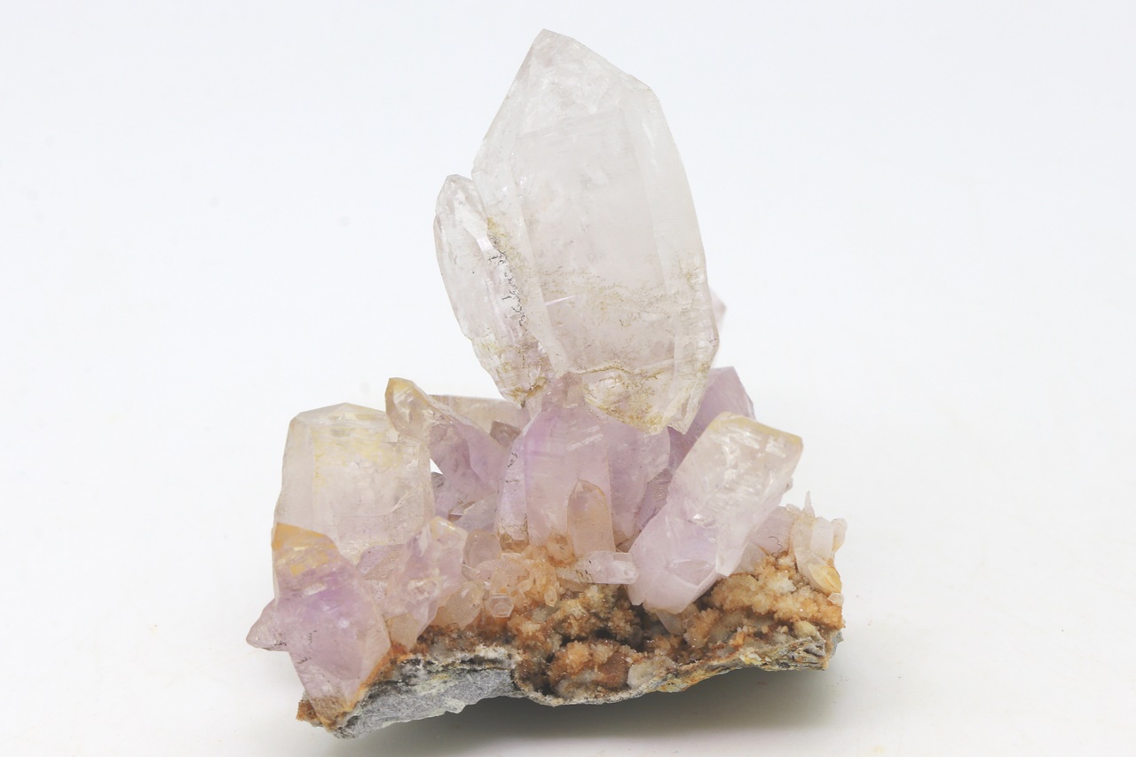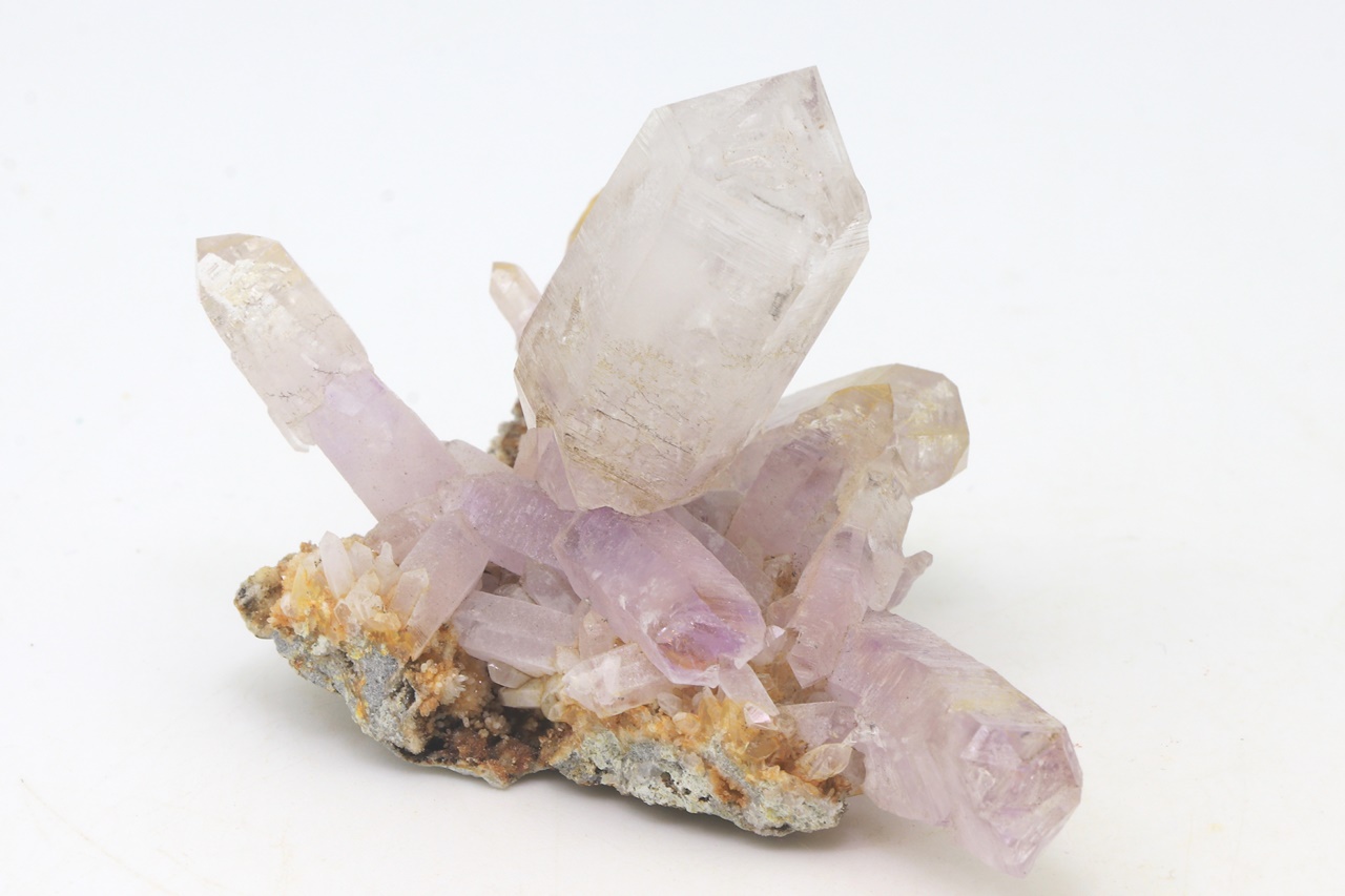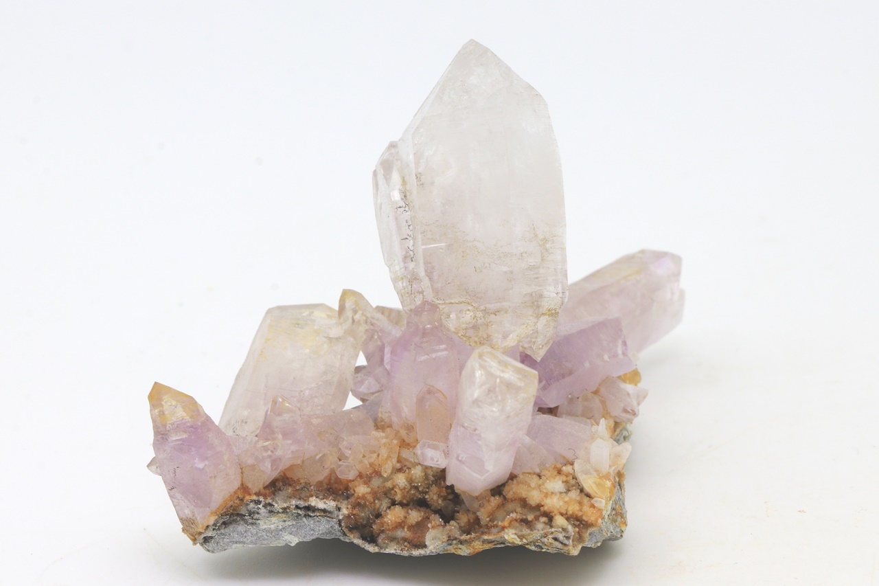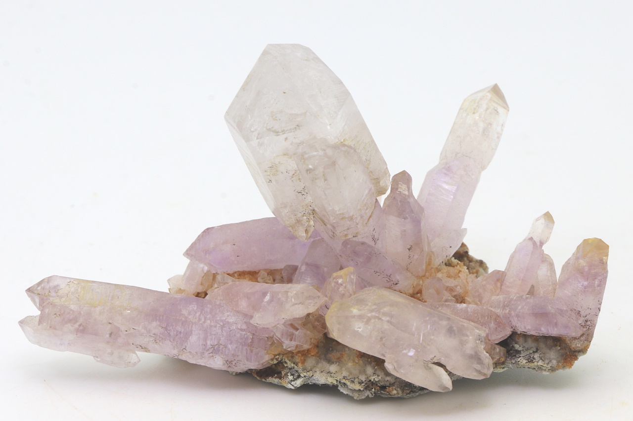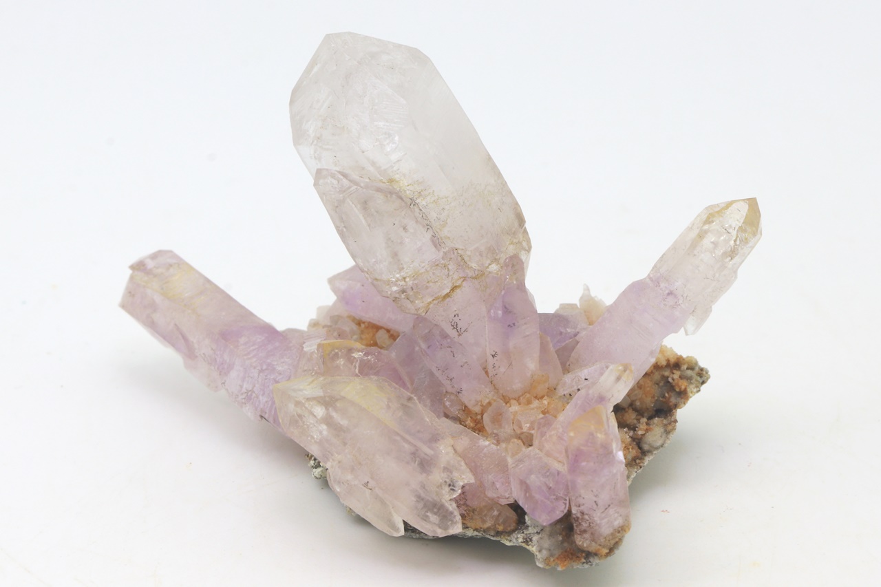 Ästhetische Verwachsung von mehreren hellviolett Kristallen des Amethysts gewachsen auf einer Unterlage. Der größte Kristall in der Mitte ist 4,5 cm groß.