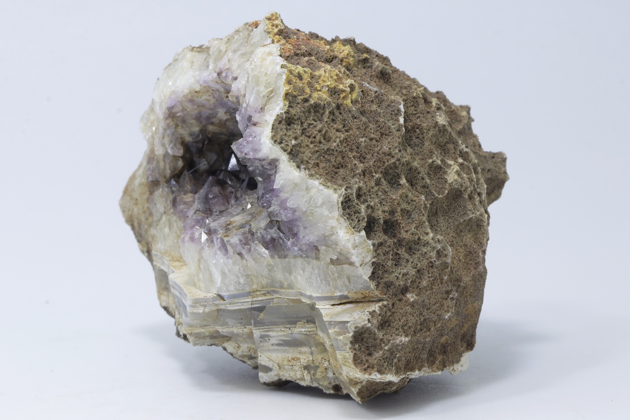 Für Raqšocka völlig einzigartiger glatter Achat. Eine vier Zentimeter große Höhlung von Quarz, die in Amethyst übergeht, mit einem unteren Teil gefüllt mit parallel gestreiftem Achat .