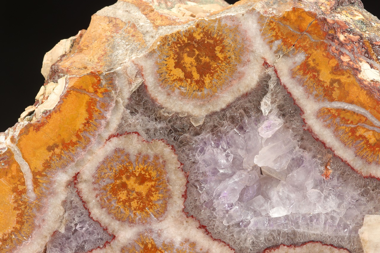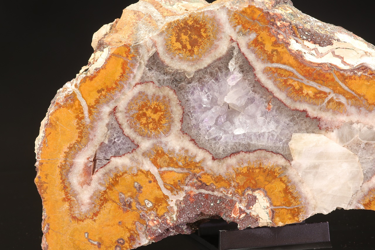 Schön gezeichnetes orange-ockerfarbenes Jaspis mit einem Zentrum aus hellem Amethyst.
