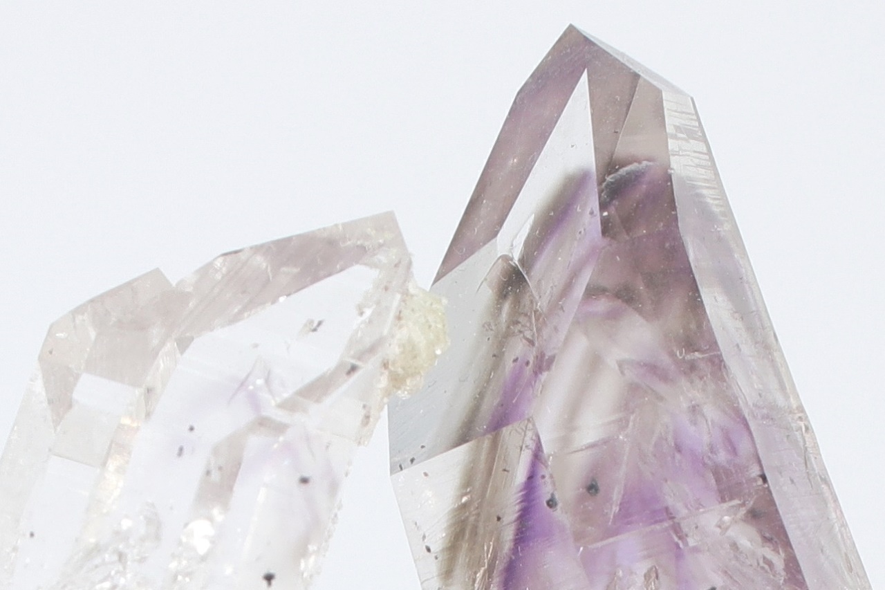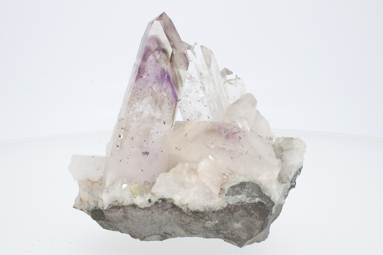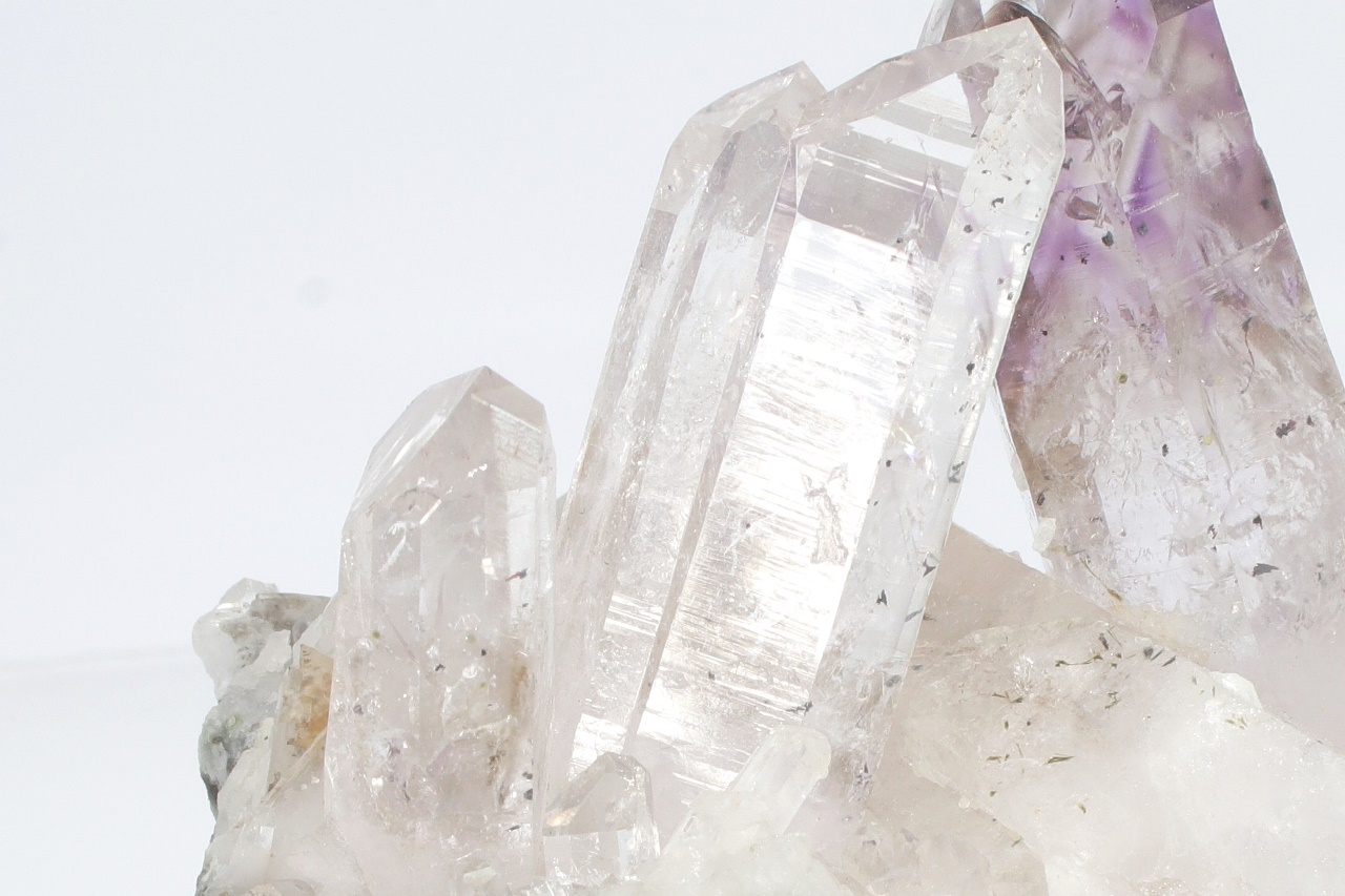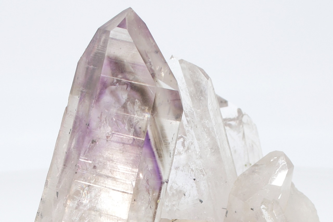 Ein schöner Exemplar von Drusekristallen aus klarem, leicht purpurnem Quarz mit einem Kristall aus schönem zonalem Amethyst 7 cm lang. Auf der Spitze des klaren Kristalls ist ein 5 mm großer Prehnit gewachsen.