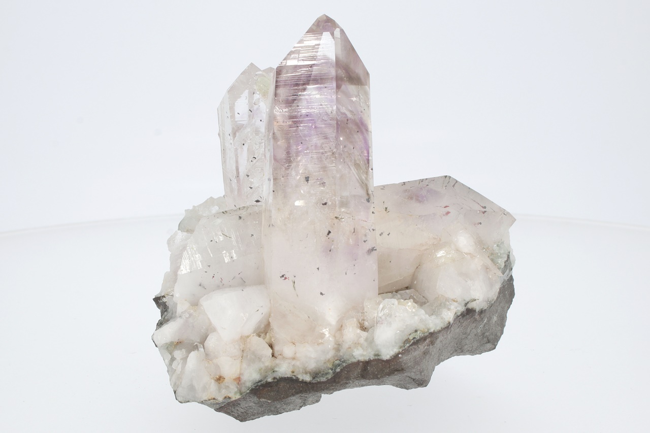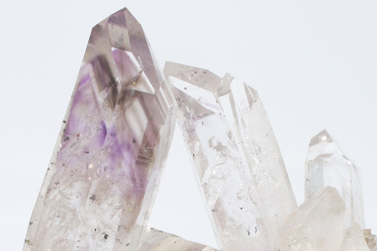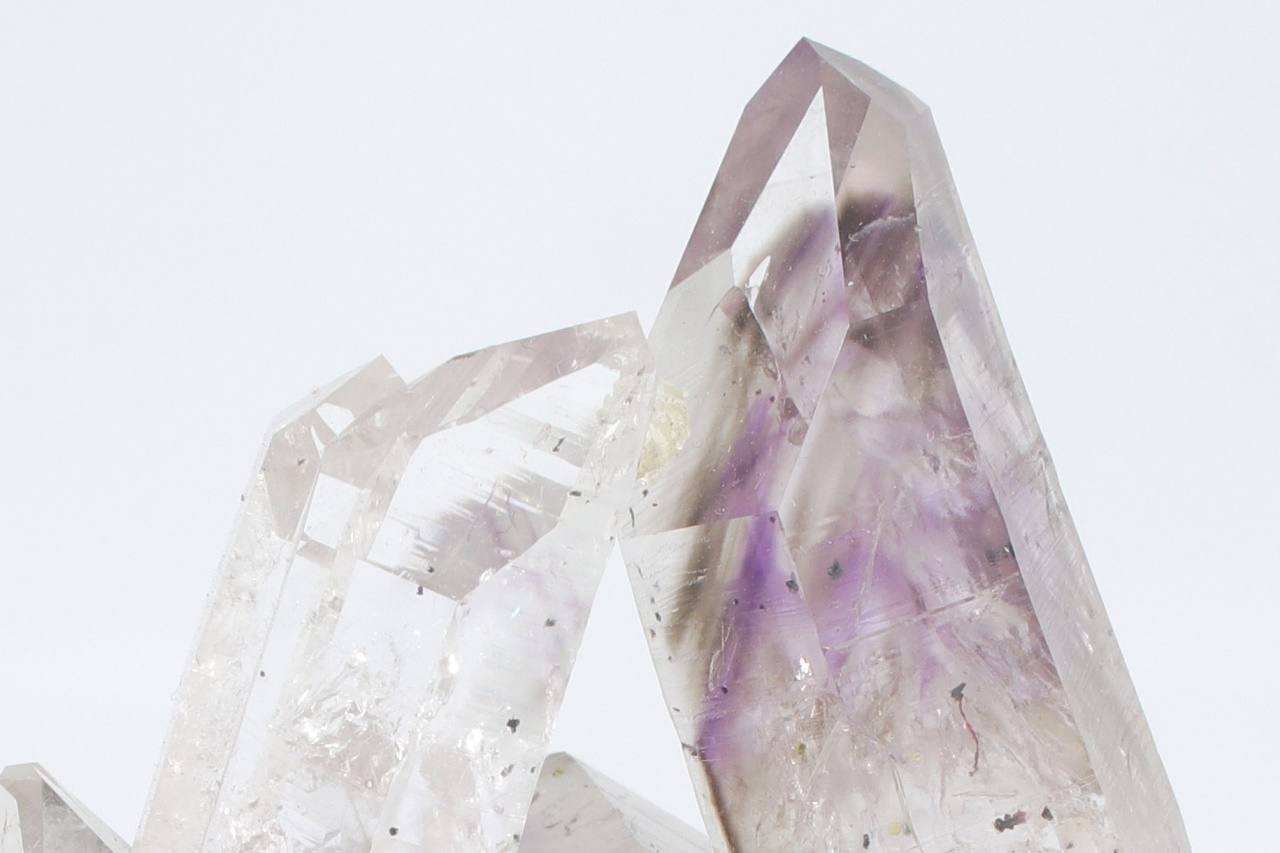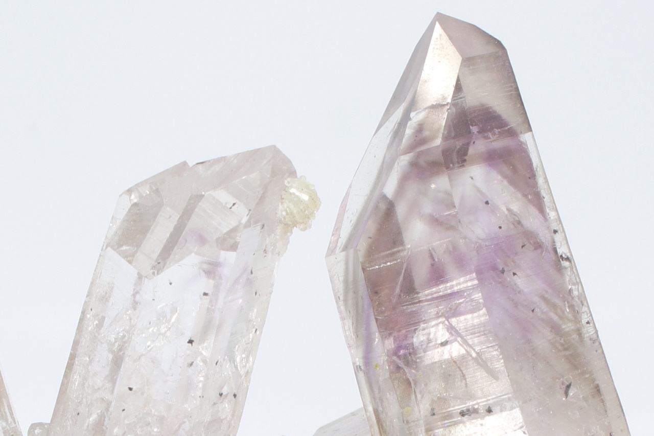 Ein schöner Exemplar von Drusekristallen aus klarem, leicht purpurnem Quarz mit einem Kristall aus schönem zonalem Amethyst 7 cm lang. Auf der Spitze des klaren Kristalls ist ein 5 mm großer Prehnit gewachsen.