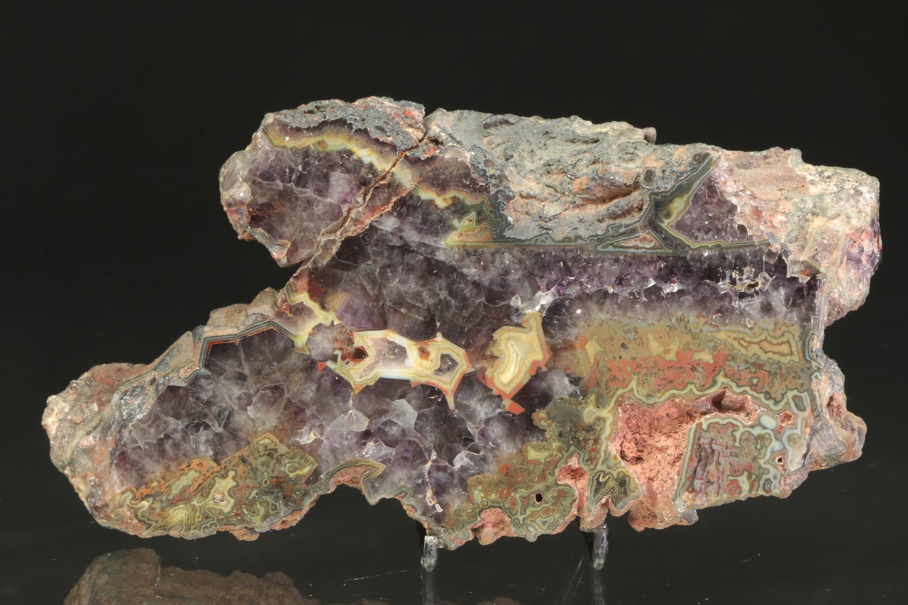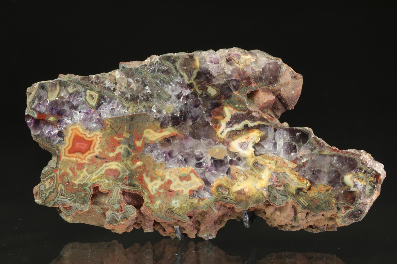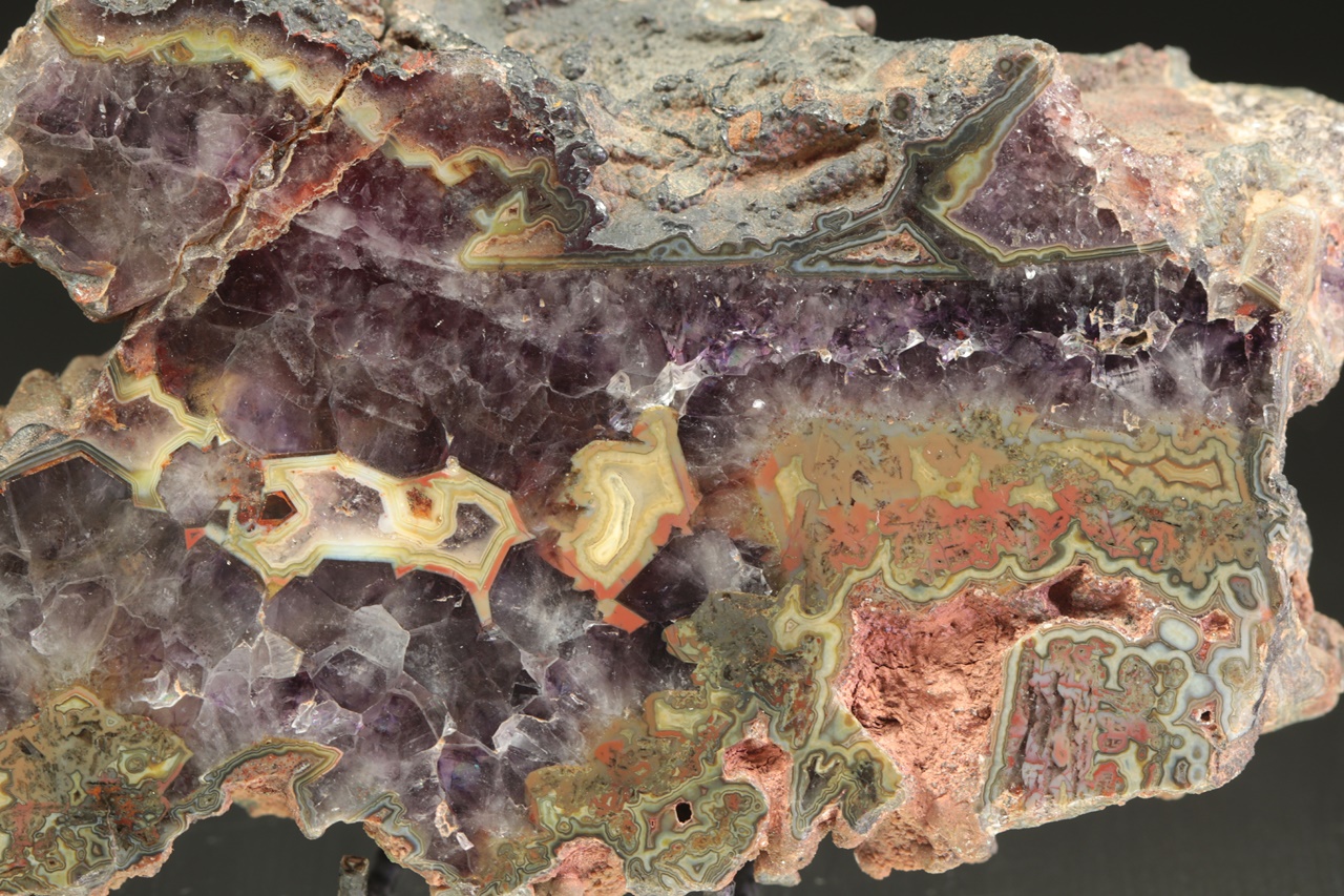 Nádherný vzorek tmavého ametystu s červeno žluto zeleným achátem z tzv. Černé Halže.
