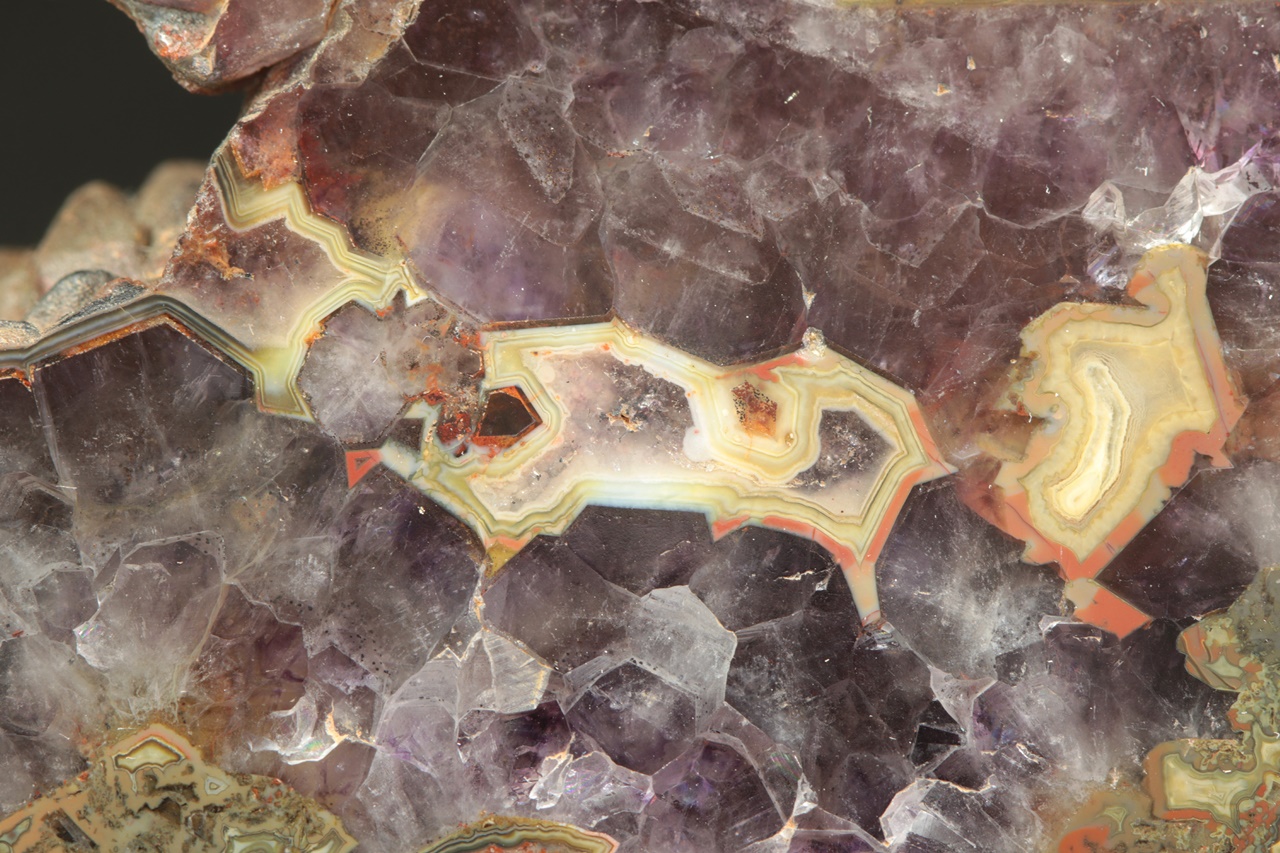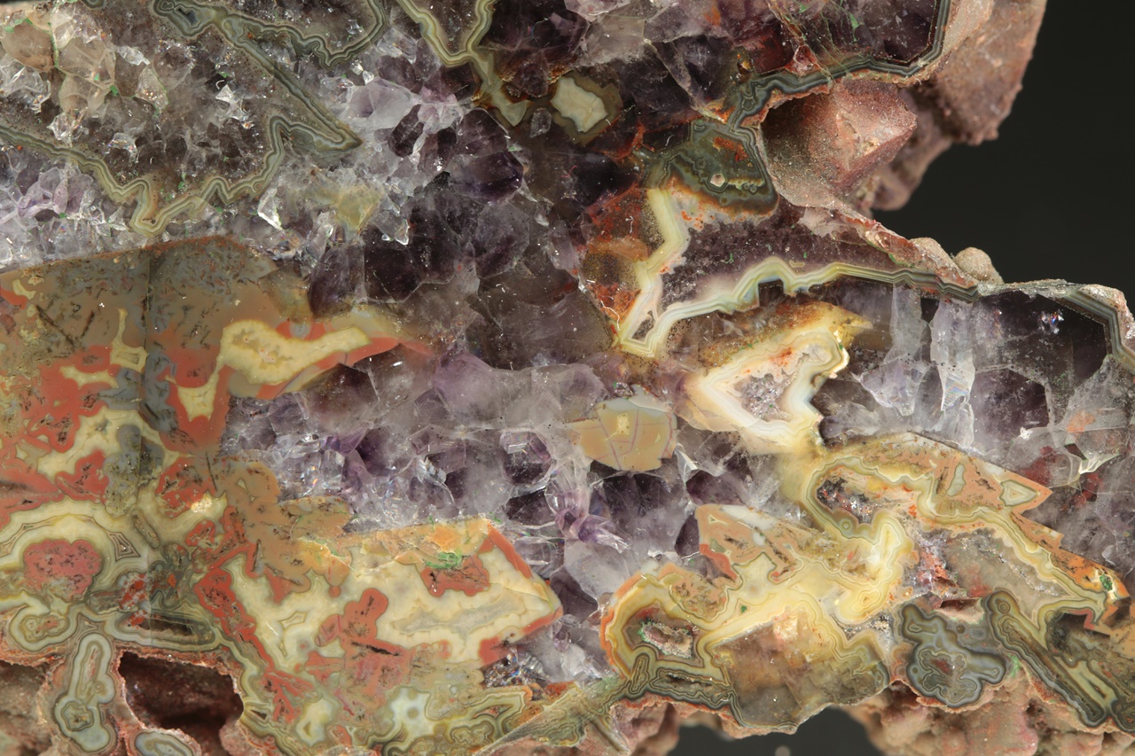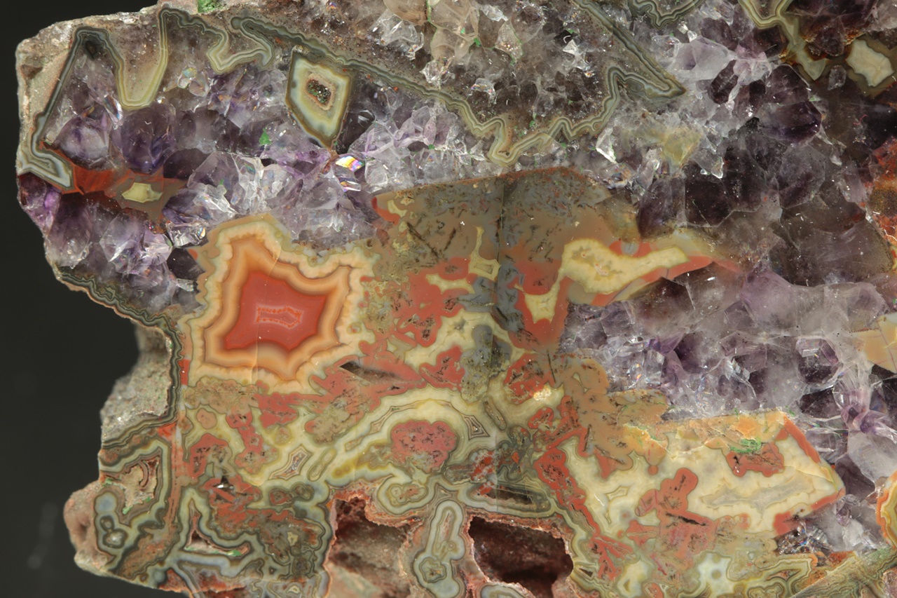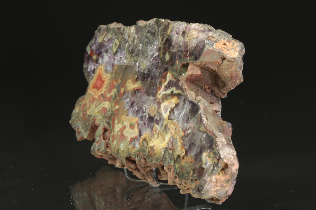Nádherný vzorek tmavého ametystu s červeno žluto zeleným achátem z tzv. Černé Halže.