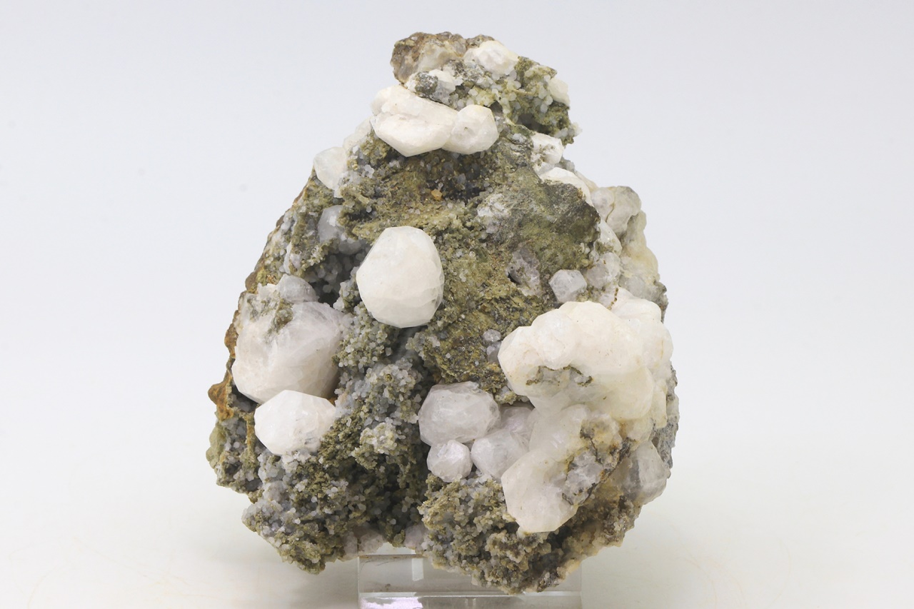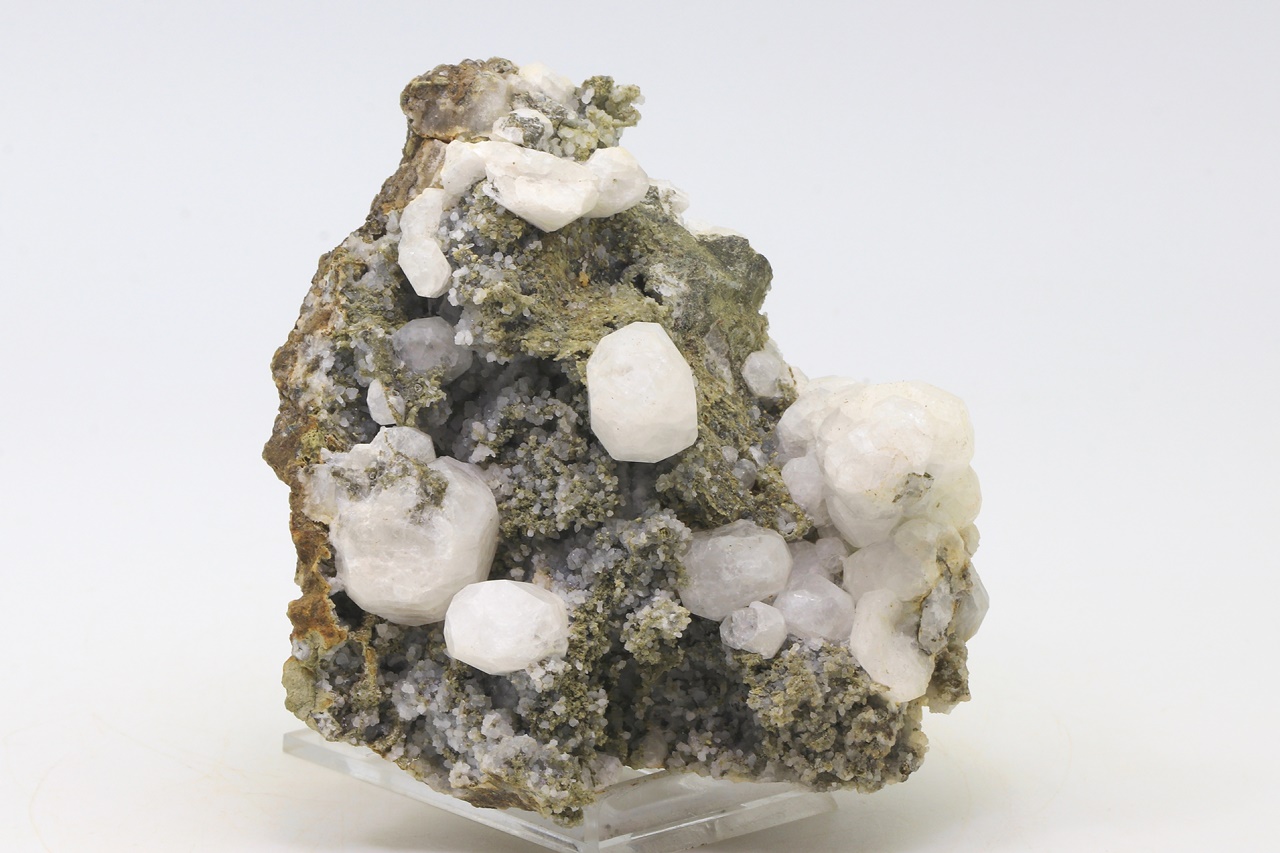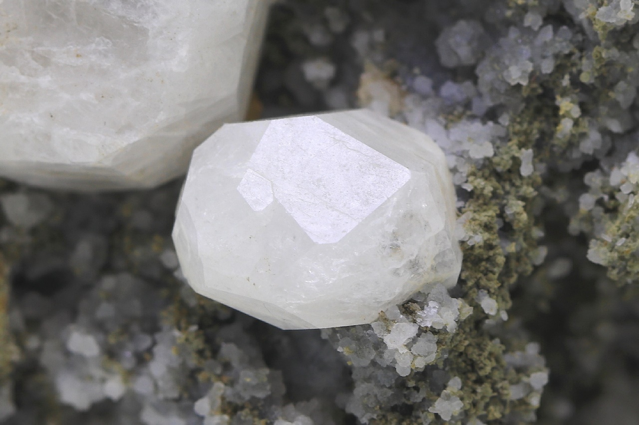 Weiße, ungewöhnlich große trapezoedrische Kristalle von Analcim. Der größte Kristall ist 2 cm groß.