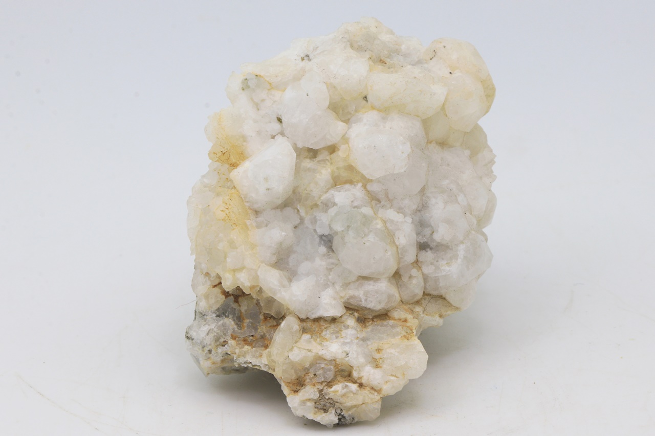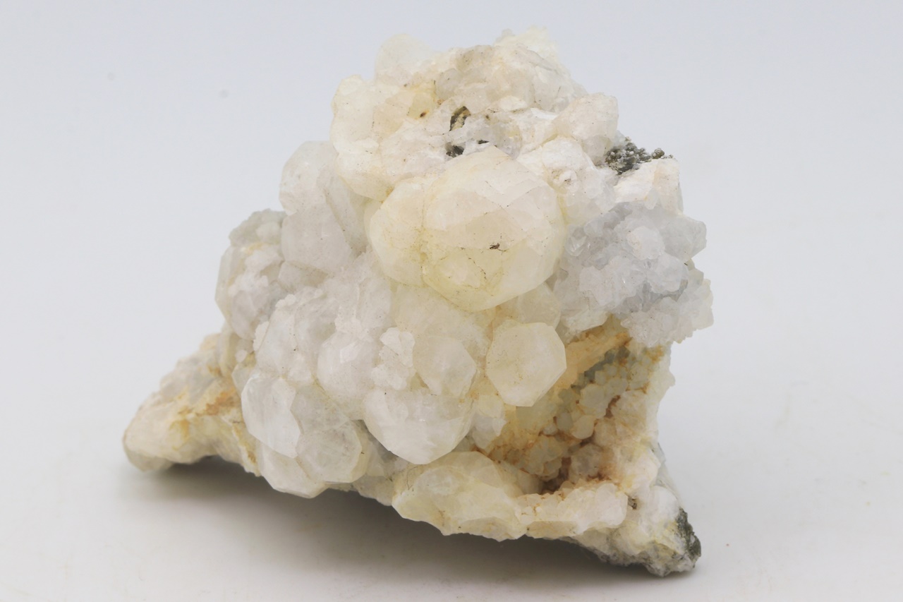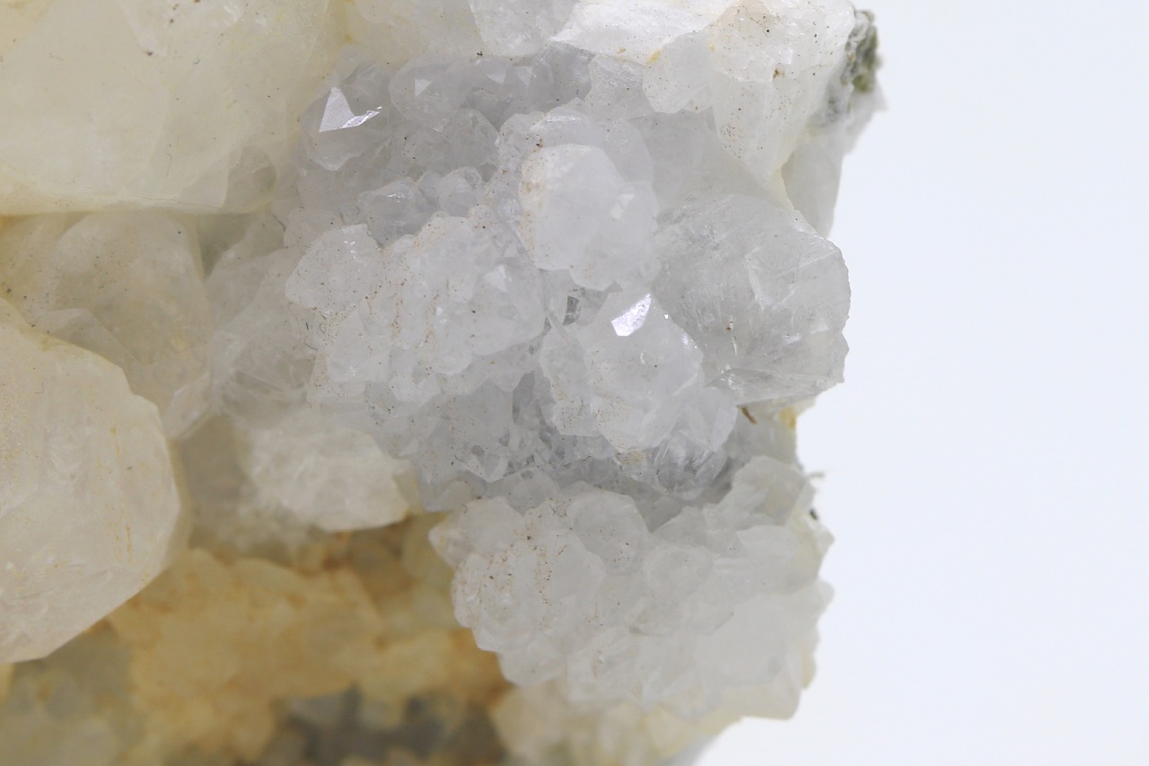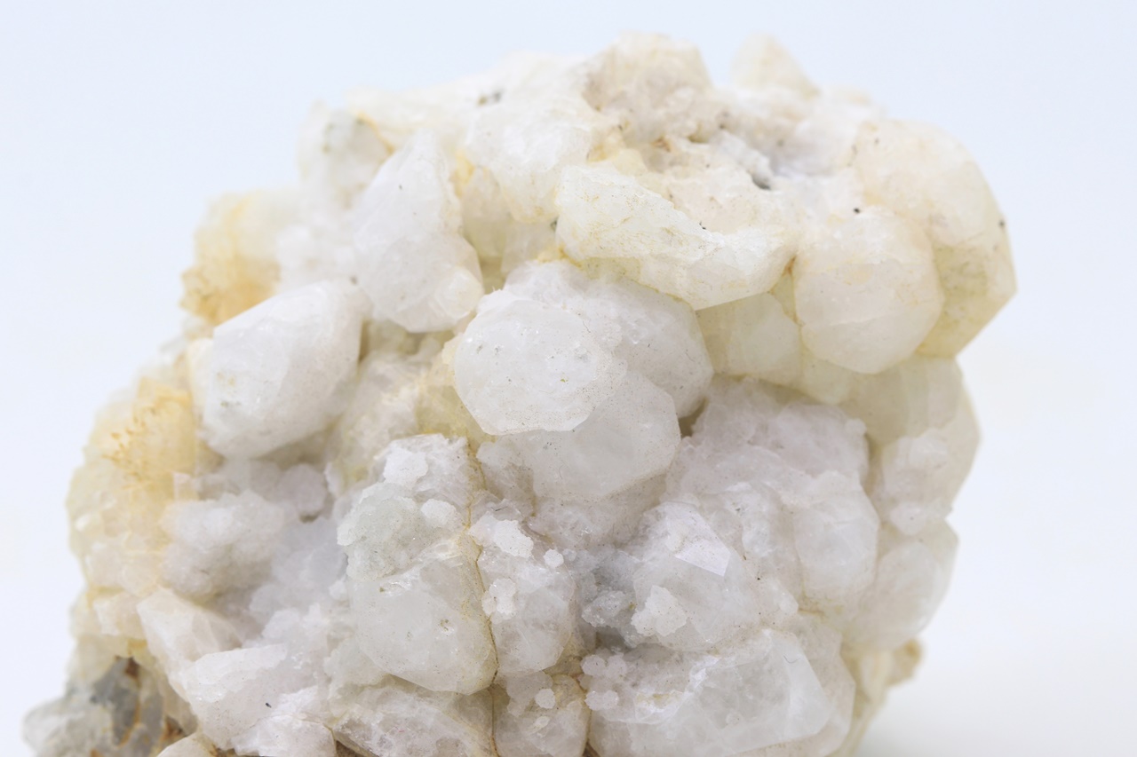 Reiche Druse von weißen, glänzenden, trapezoedrischen Kristallen des Analcims mit einer Druse von seitlich gewachsenem Quarz. Der größte Analcim-Kristall ist 1,3 cm groß.
