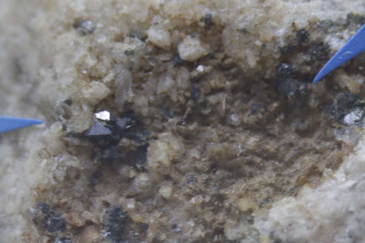 Zwei dunkel schwarze Anatas-Kristalle, gewachsen auf Spalten. Der größere Kristall ist kaum 1 mm groß.