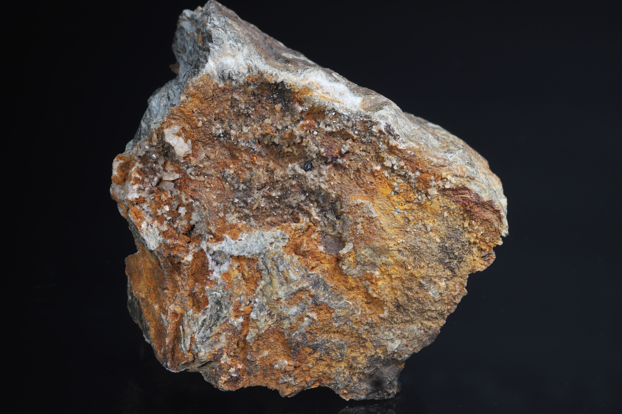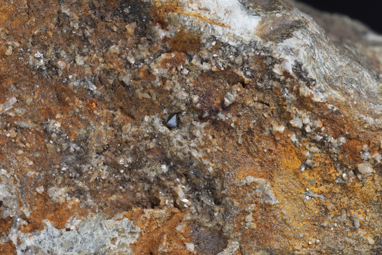Dunkelblau bis schwarzer, perfekt begrenzter dipyramidaler Anatas-Kristall (ca. 1,5 mm) in einer Kluft von Phyllit aus dem bekannten Fundort Praděd aus den 1970er Jahren. Die Stufe ist unten abgeschliffen .