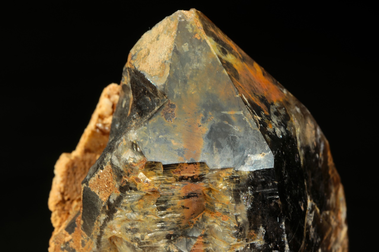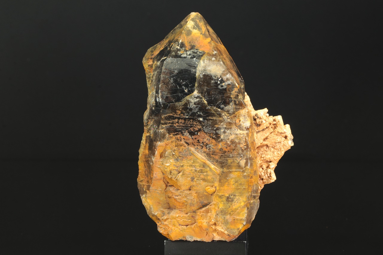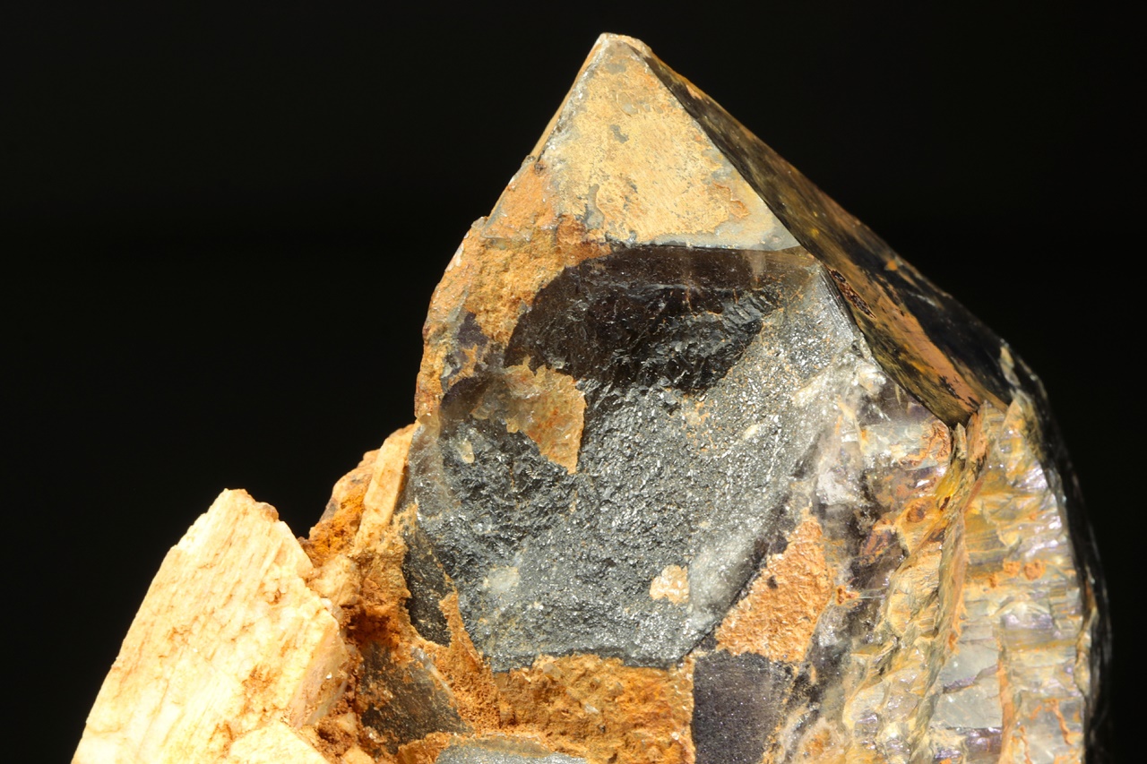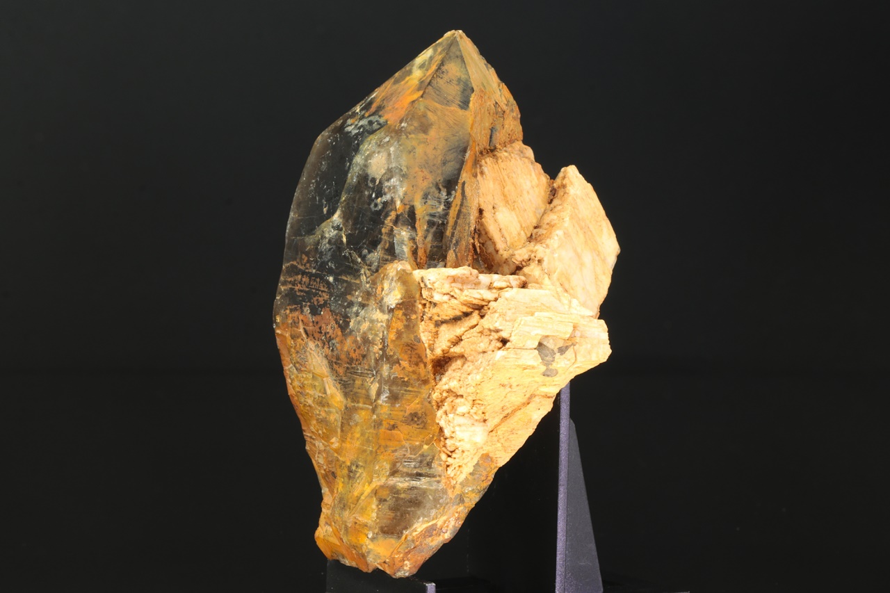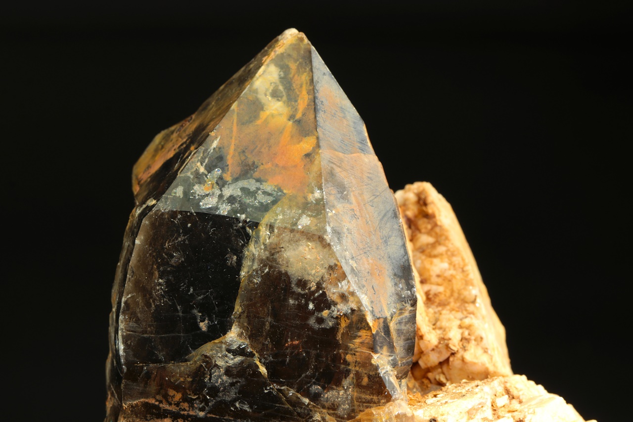 Ein elf Zentimeter großer Kristall Záhněda gewachsen auf beige Plagioklas.