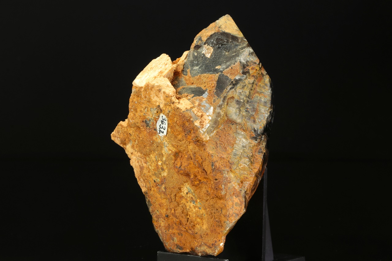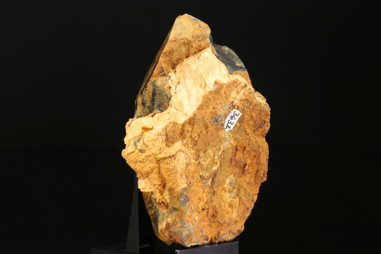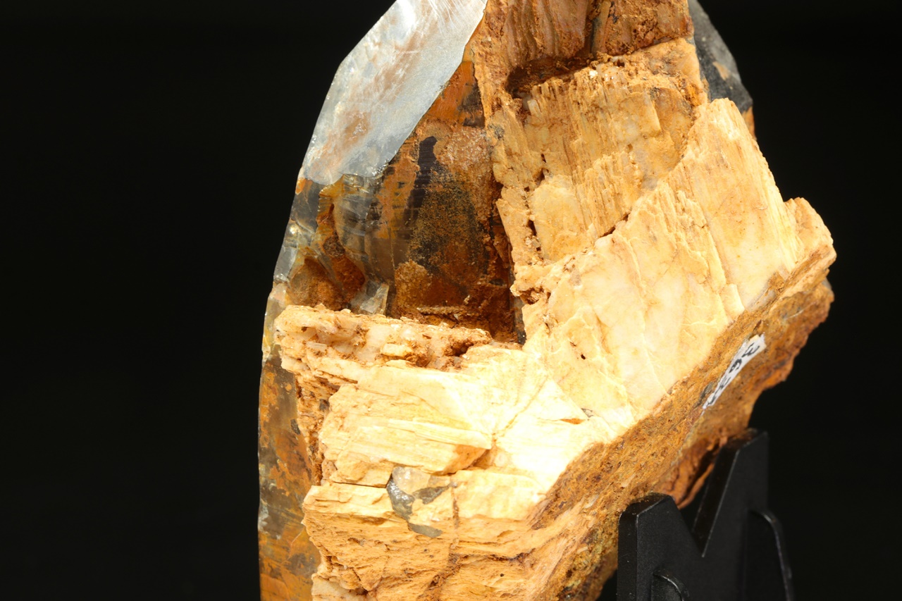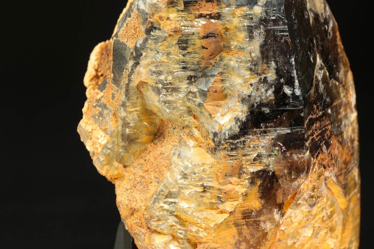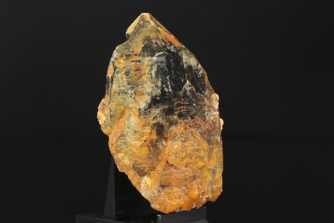 Ein elf Zentimeter großer Kristall Záhněda gewachsen auf beige Plagioklas.