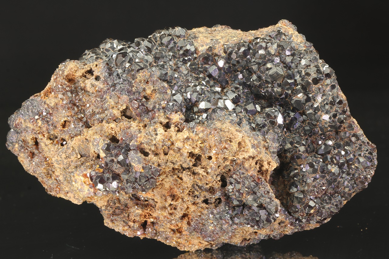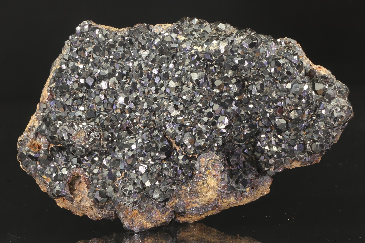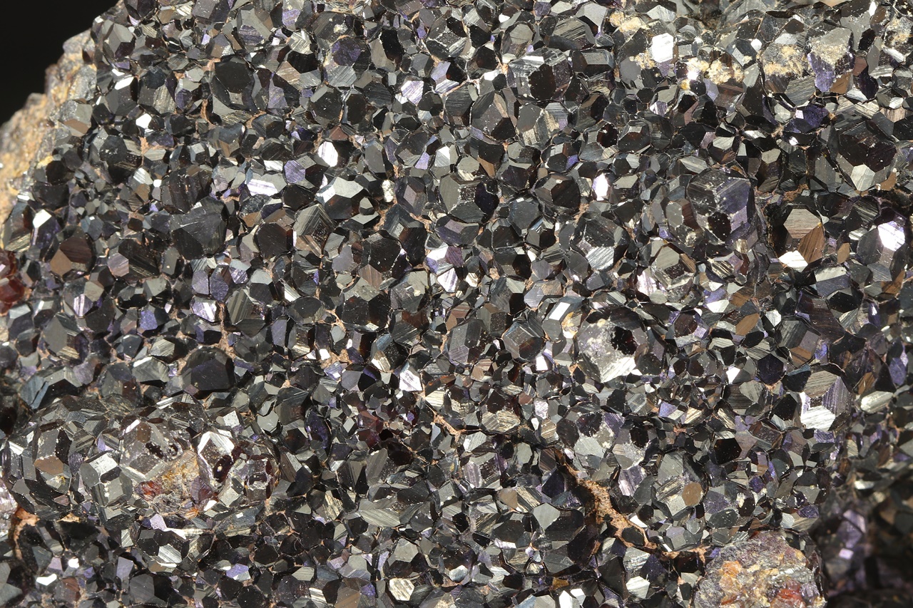 Druse von sehr glänzenden, dunkelbraunen Kristallen des calciumeisenhaltigen Granats. Die größten Kristalle sind 5 mm groß .