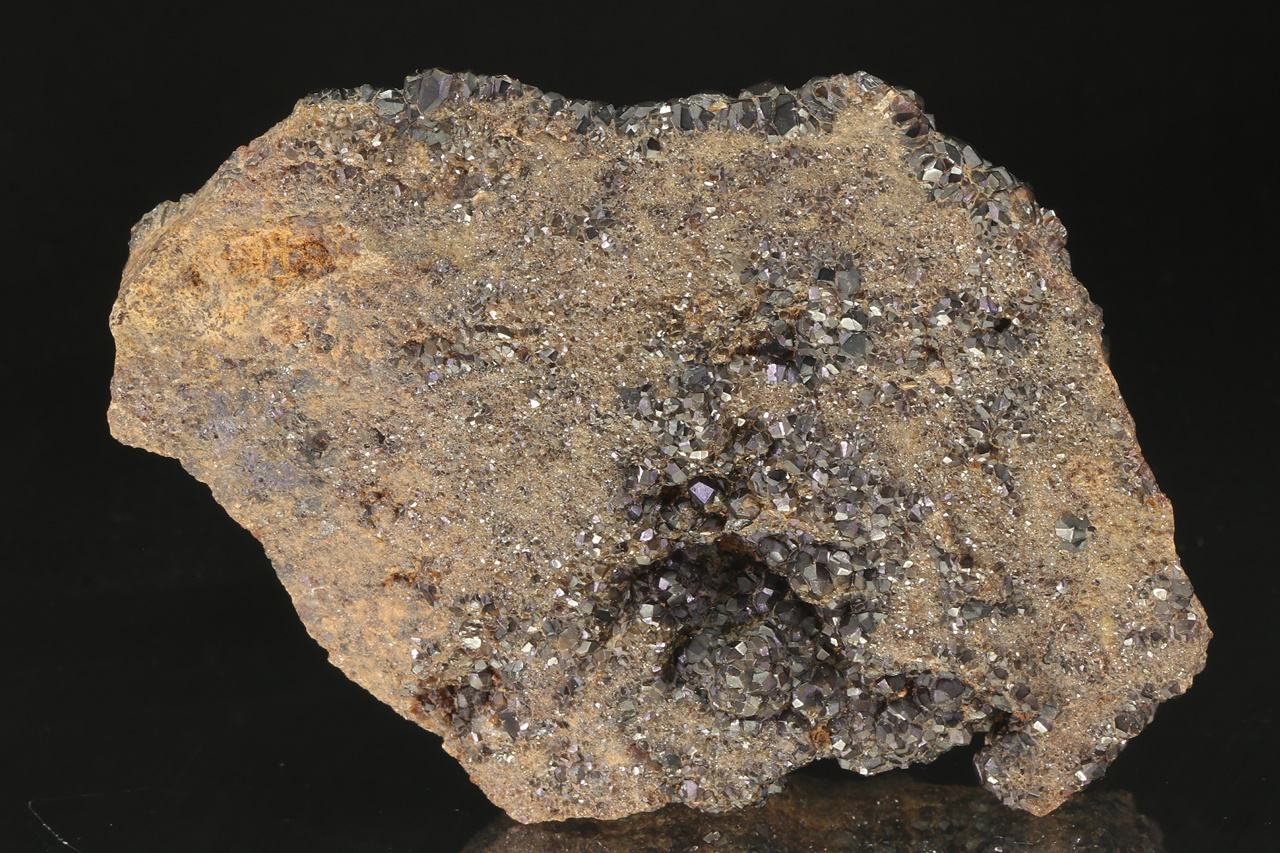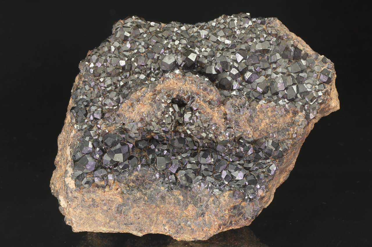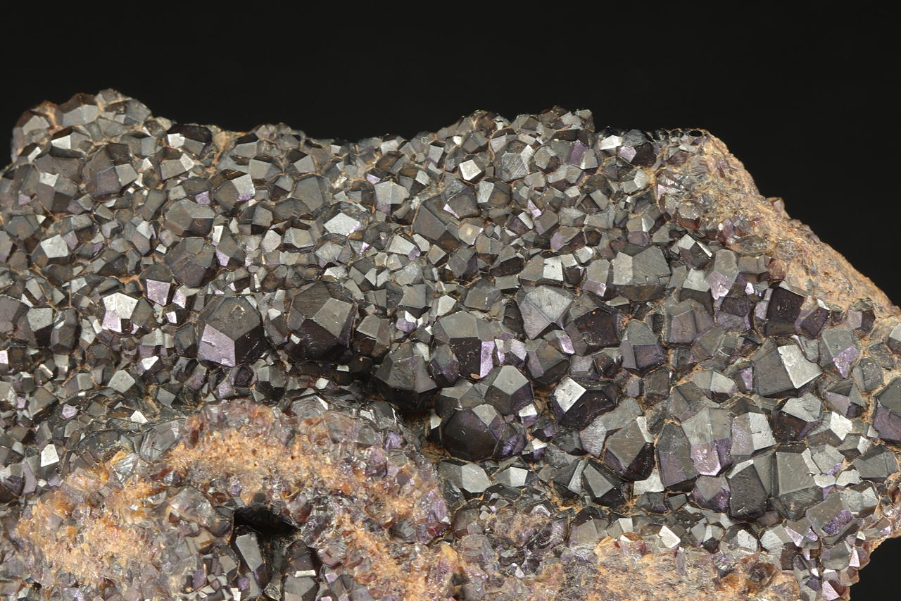 Druse sehr glänzender, dunkelbrauner Kristalle von calciumeisigem Granat. Die größten Kristalle sind 7 mm groß .