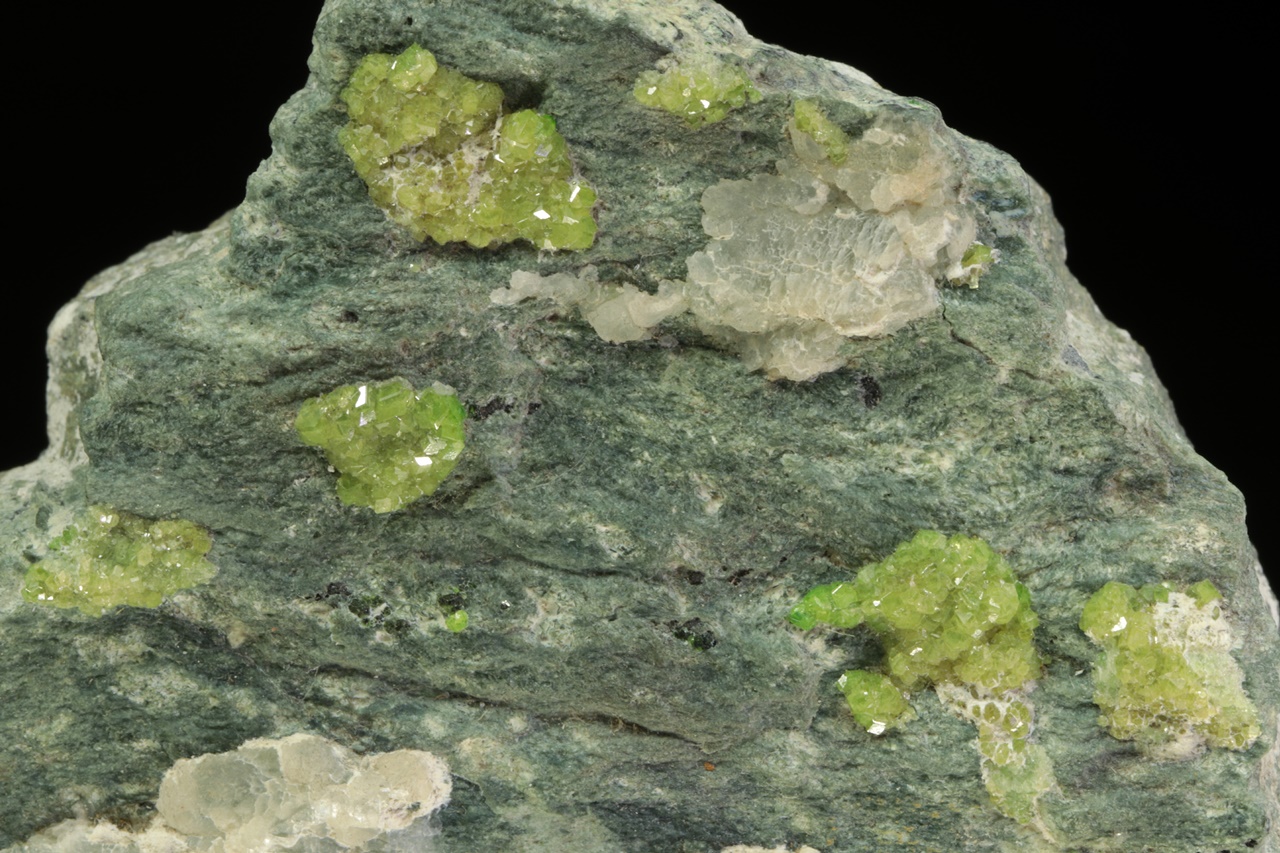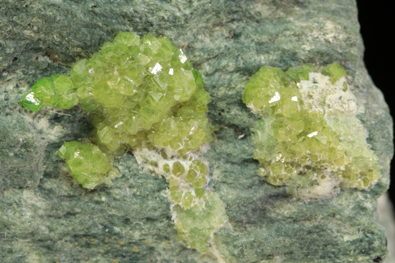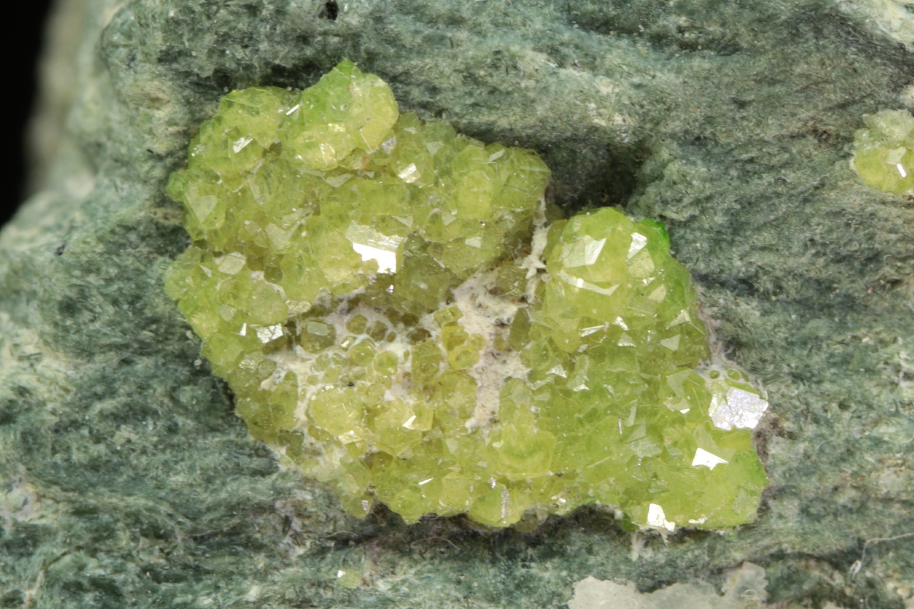Schwärme von hellgrünem, glänzendem Andradit-Varietät Demantoid, gewachsen in einer Spalte. Die Größe der Kristalle beträgt etwa 2 mm.