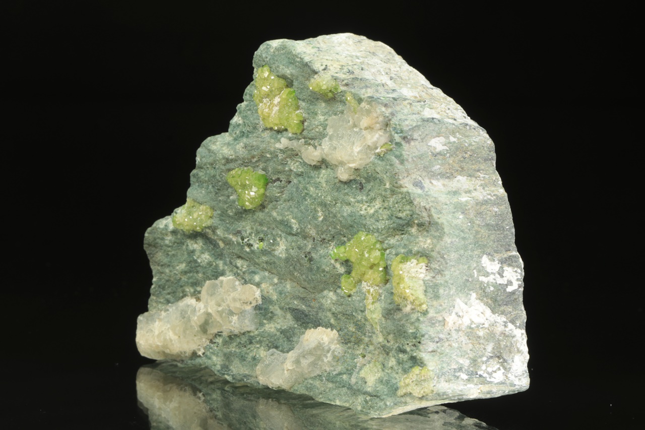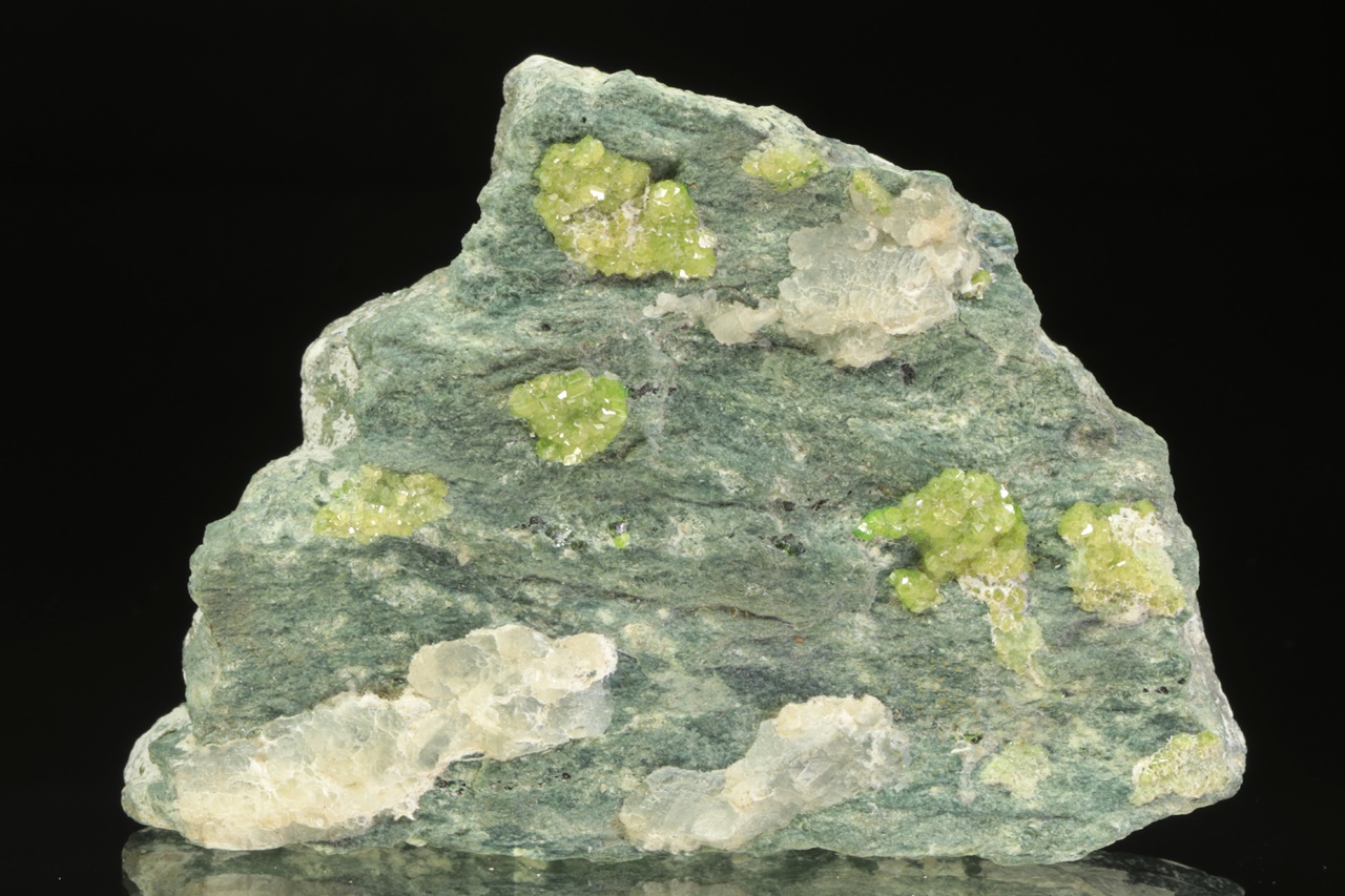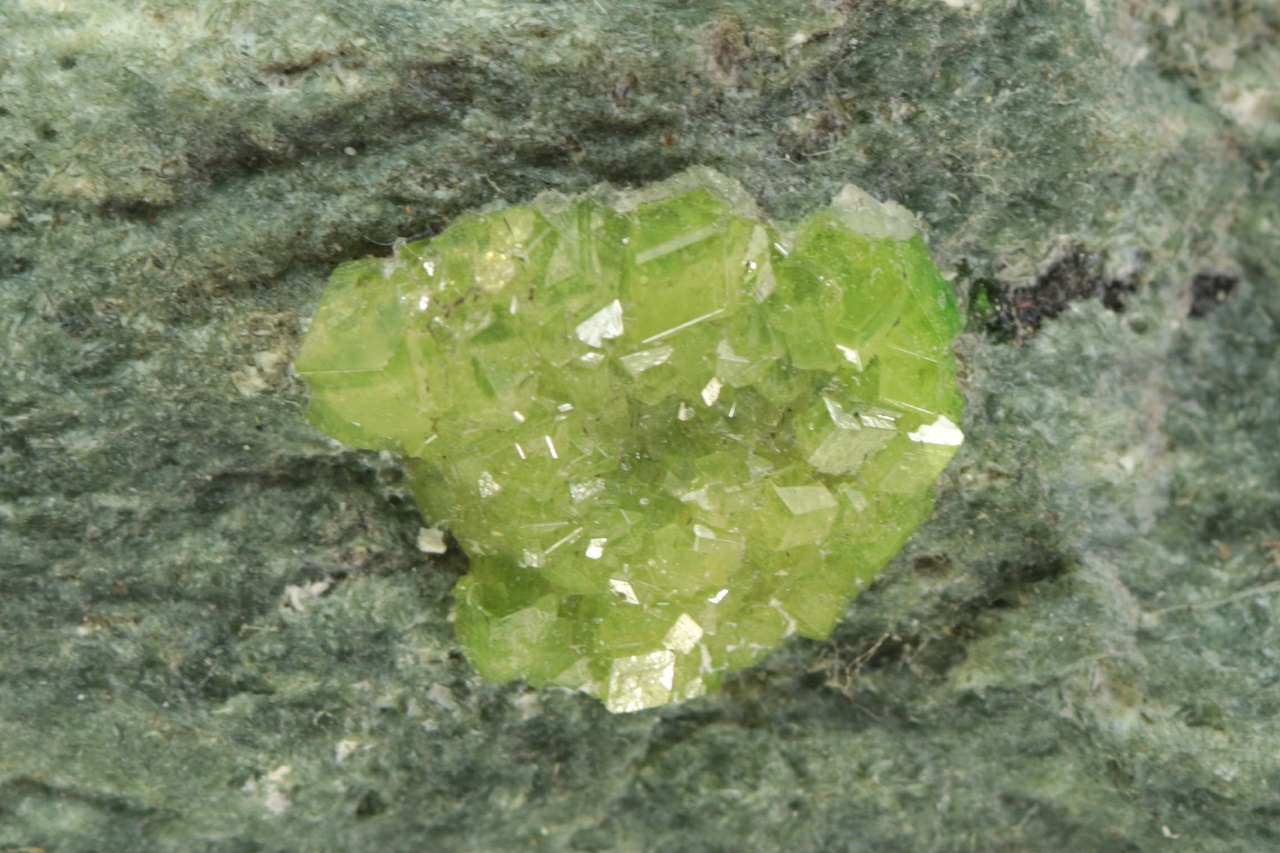 Schwärme von hellgrünem, glänzendem Andradit-Varietät Demantoid, gewachsen in einer Spalte. Die Größe der Kristalle beträgt etwa 2 mm.