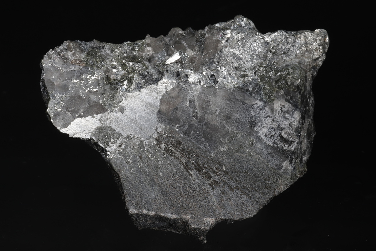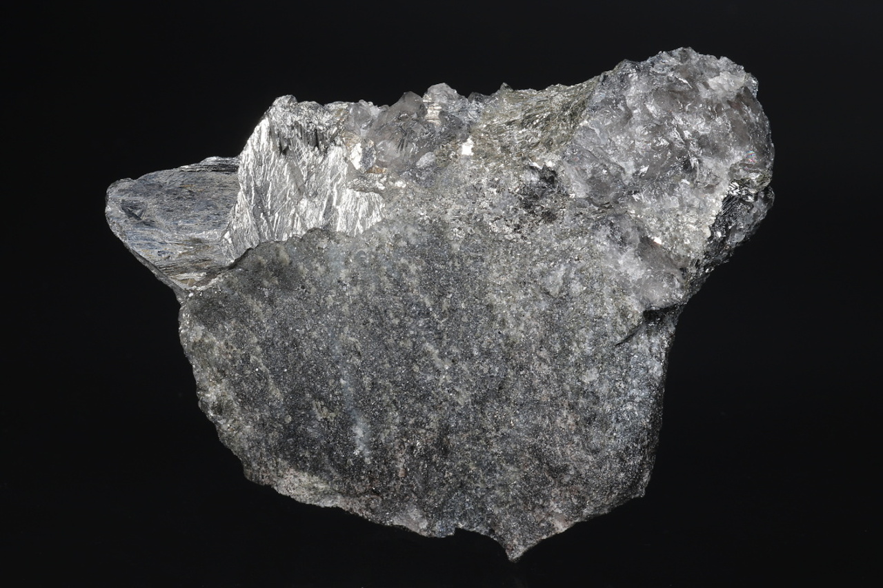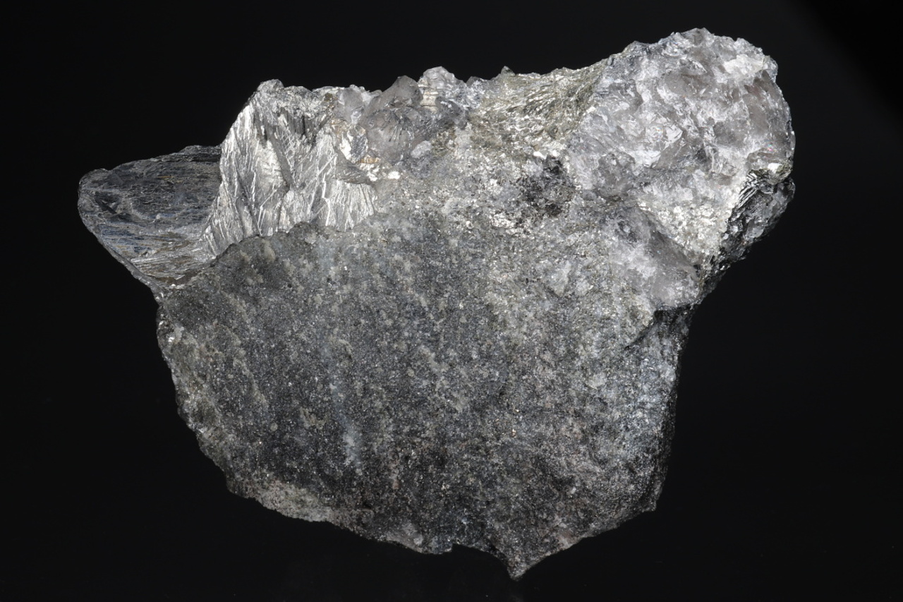 Sehr reiche Probe von spaltbaren silbrig weißen Aggregaten aus reinem Antimon bis zu einer Größe von 14 mm. Die Probe ist auf der Rückseite abgeschnitten.