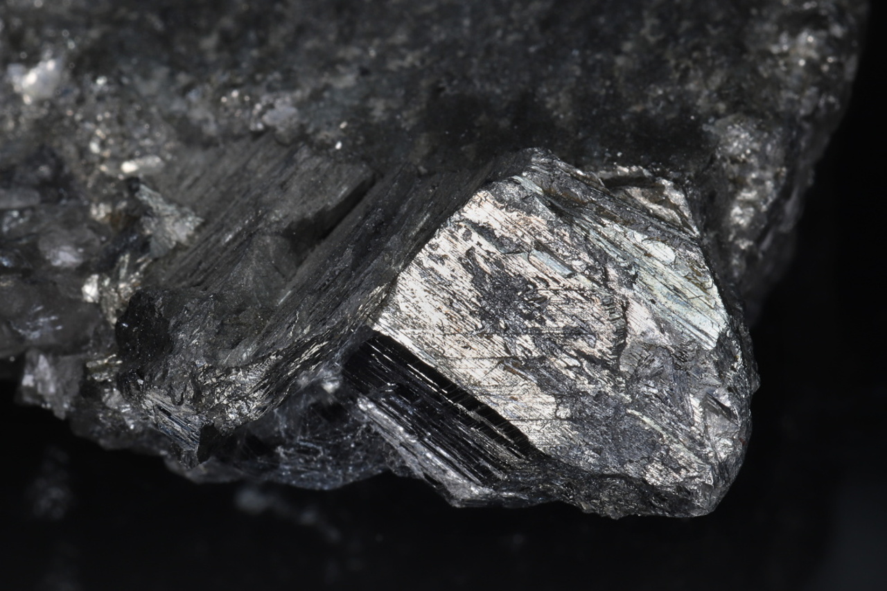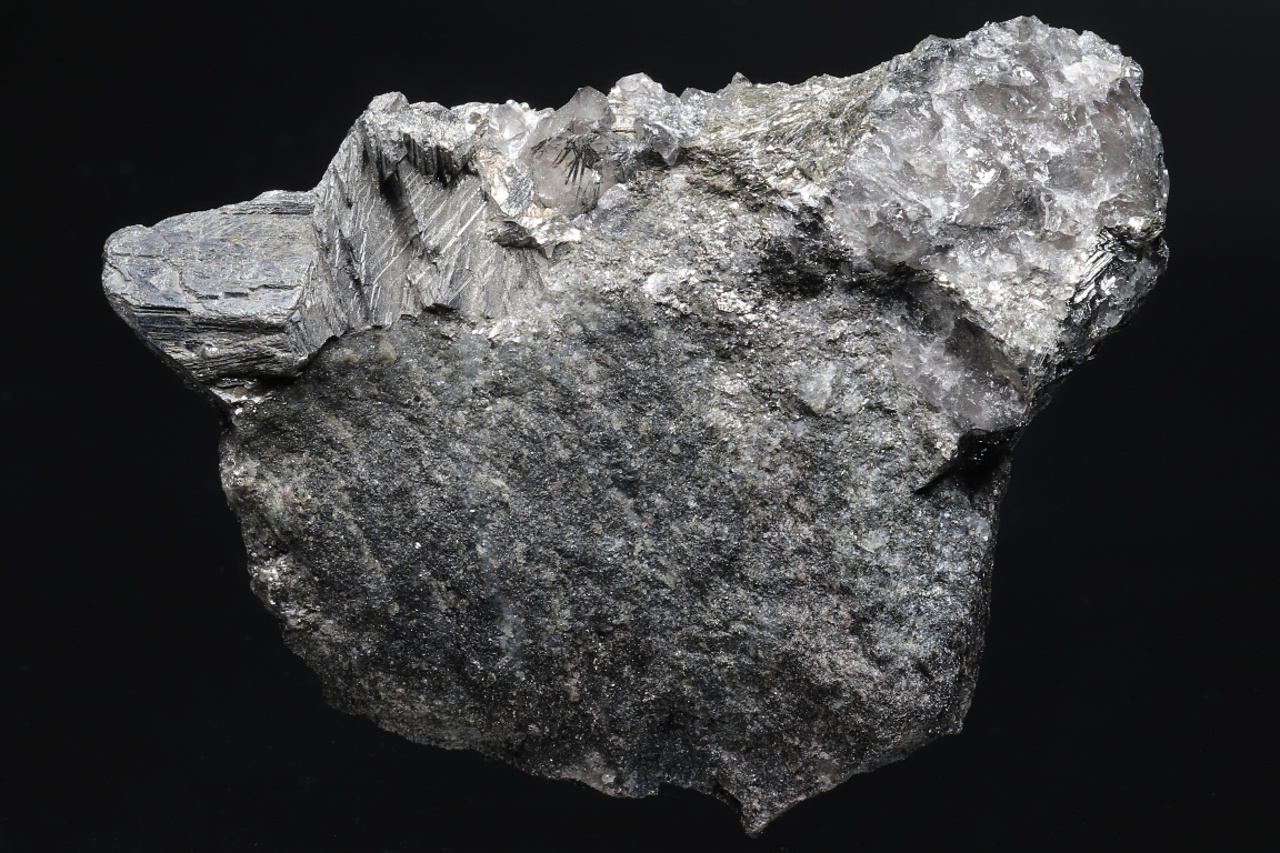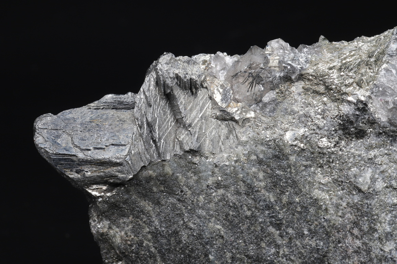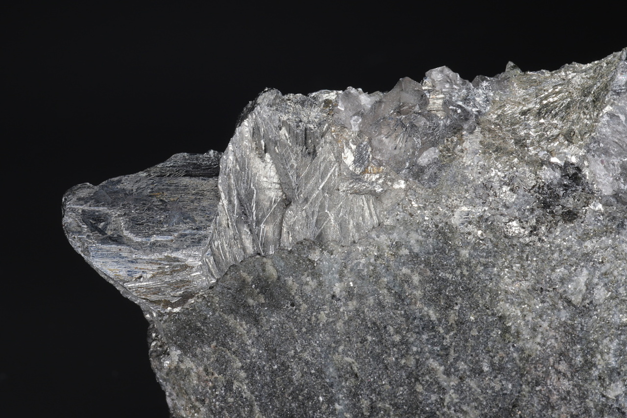 Sehr reiche Probe von spaltbaren silbrig weißen Aggregaten aus reinem Antimon bis zu einer Größe von 14 mm. Die Probe ist auf der Rückseite abgeschnitten.