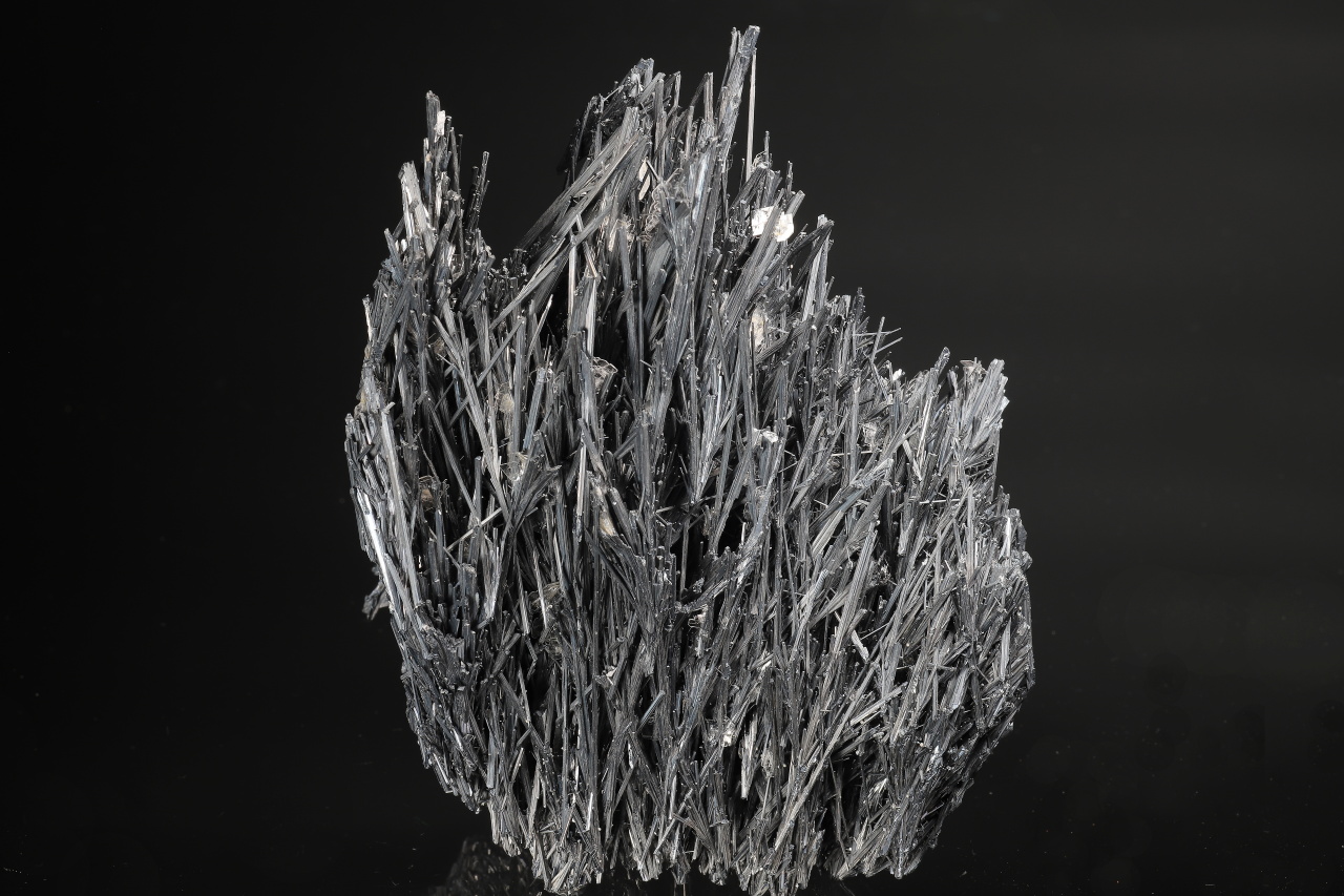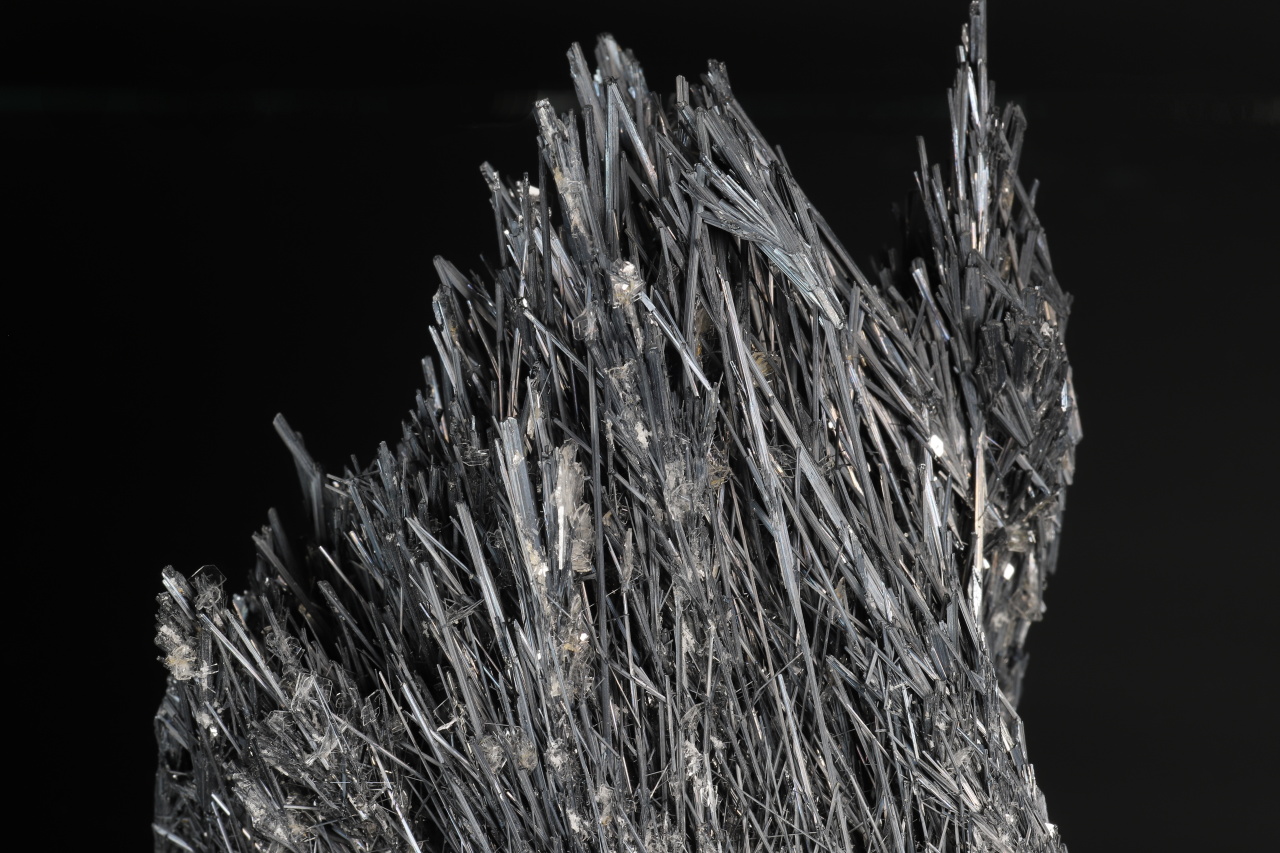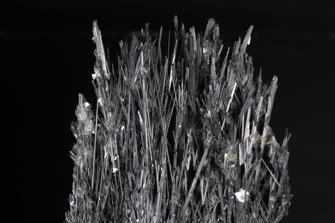 Perfektní sbírková drúza tvořená dlouhými jehlicovitými krystaly antimonitu, na které nasedají čiré tabulkovité krystaly barytu. Vysoce estetická ukázka antimonitu z dolu Herja v Rumunsku.