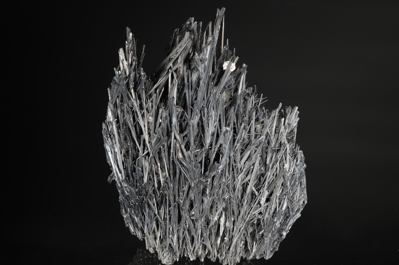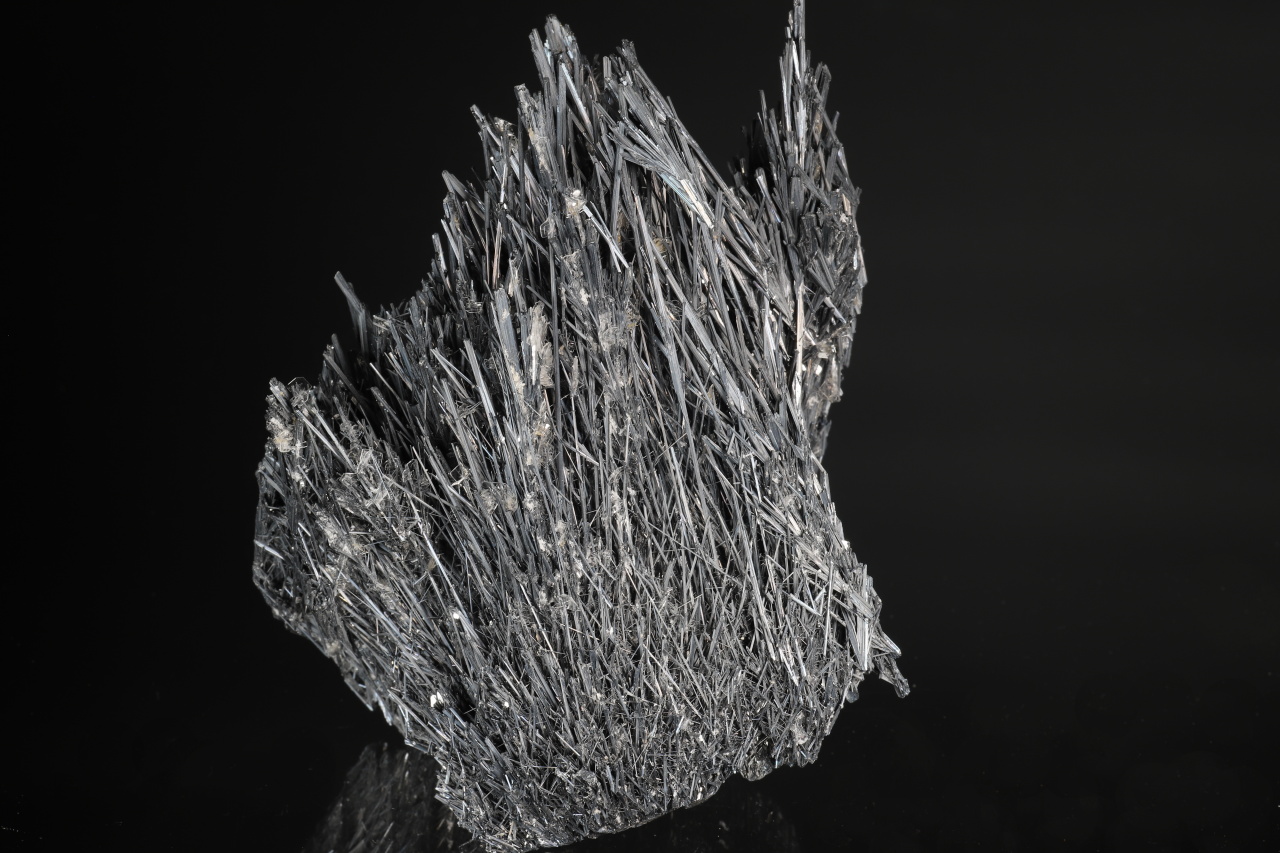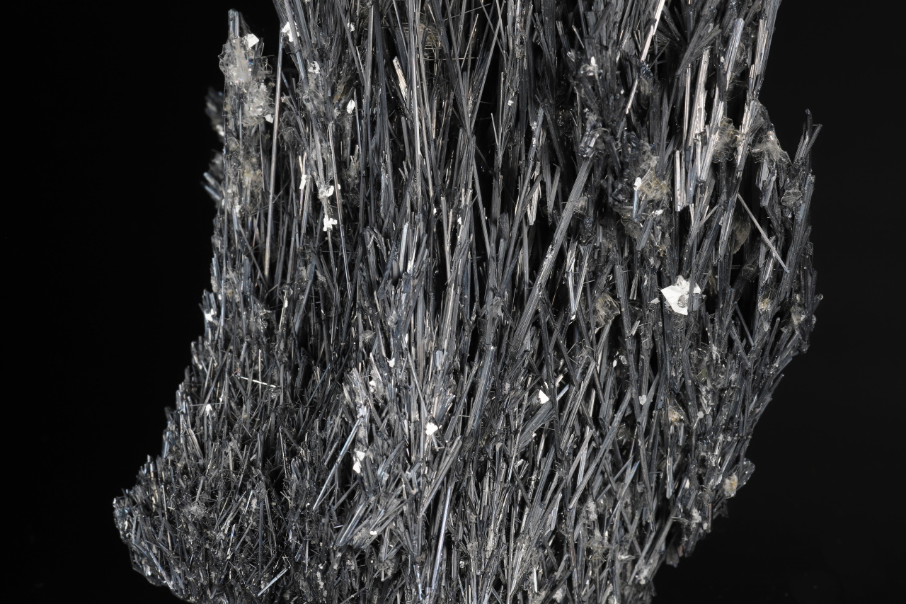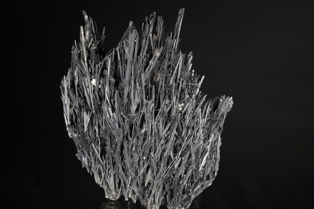 Perfektní sbírková drúza tvořená dlouhými jehlicovitými krystaly antimonitu, na které nasedají čiré tabulkovité krystaly barytu. Vysoce estetická ukázka antimonitu z dolu Herja v Rumunsku.