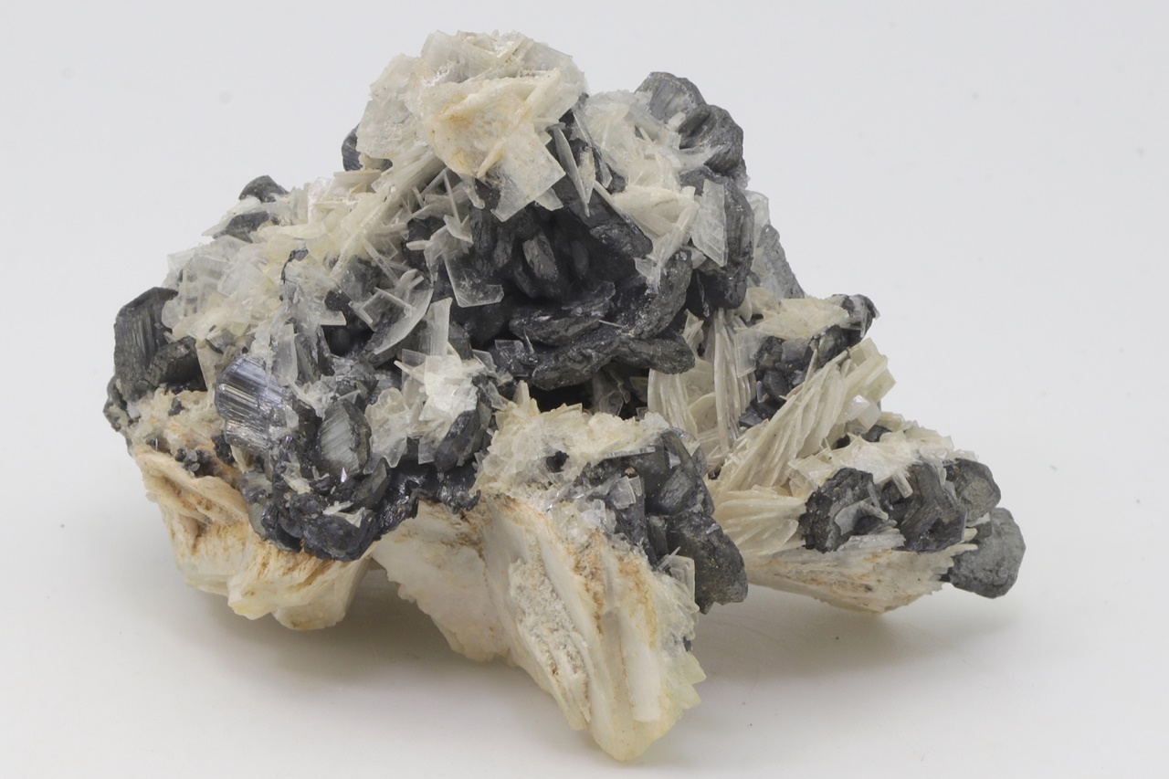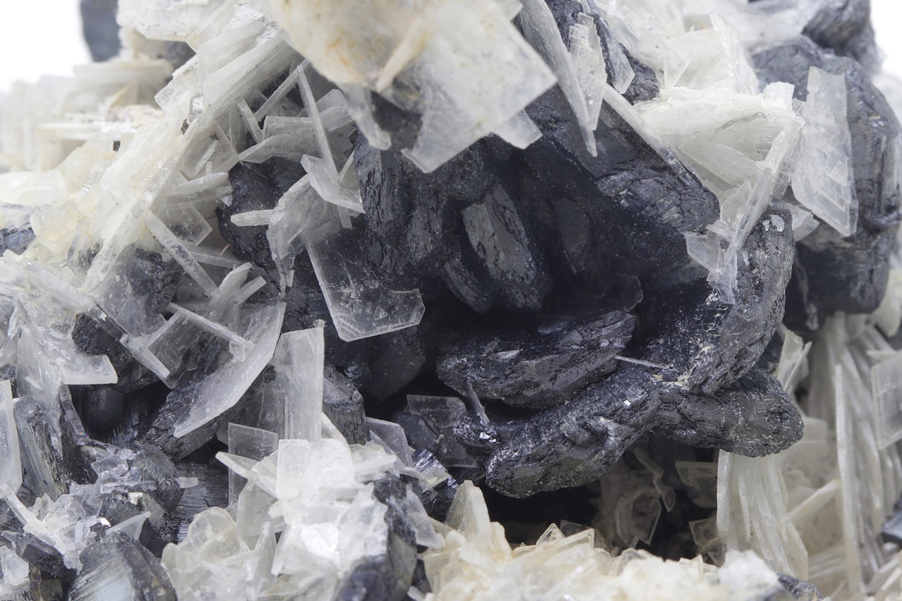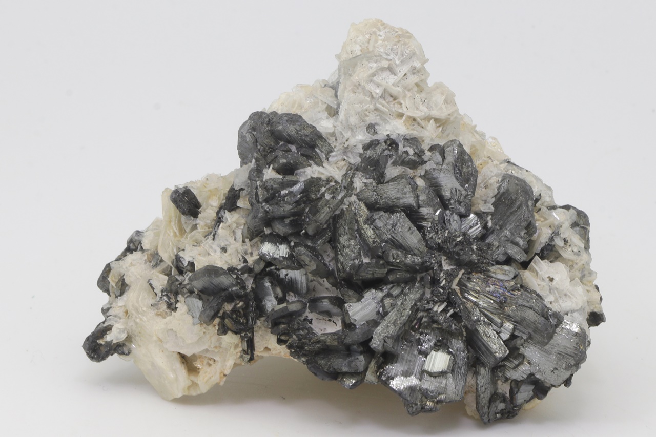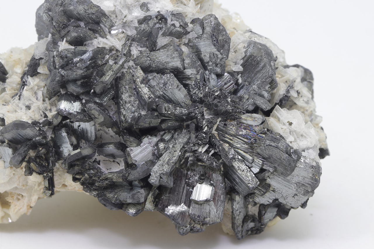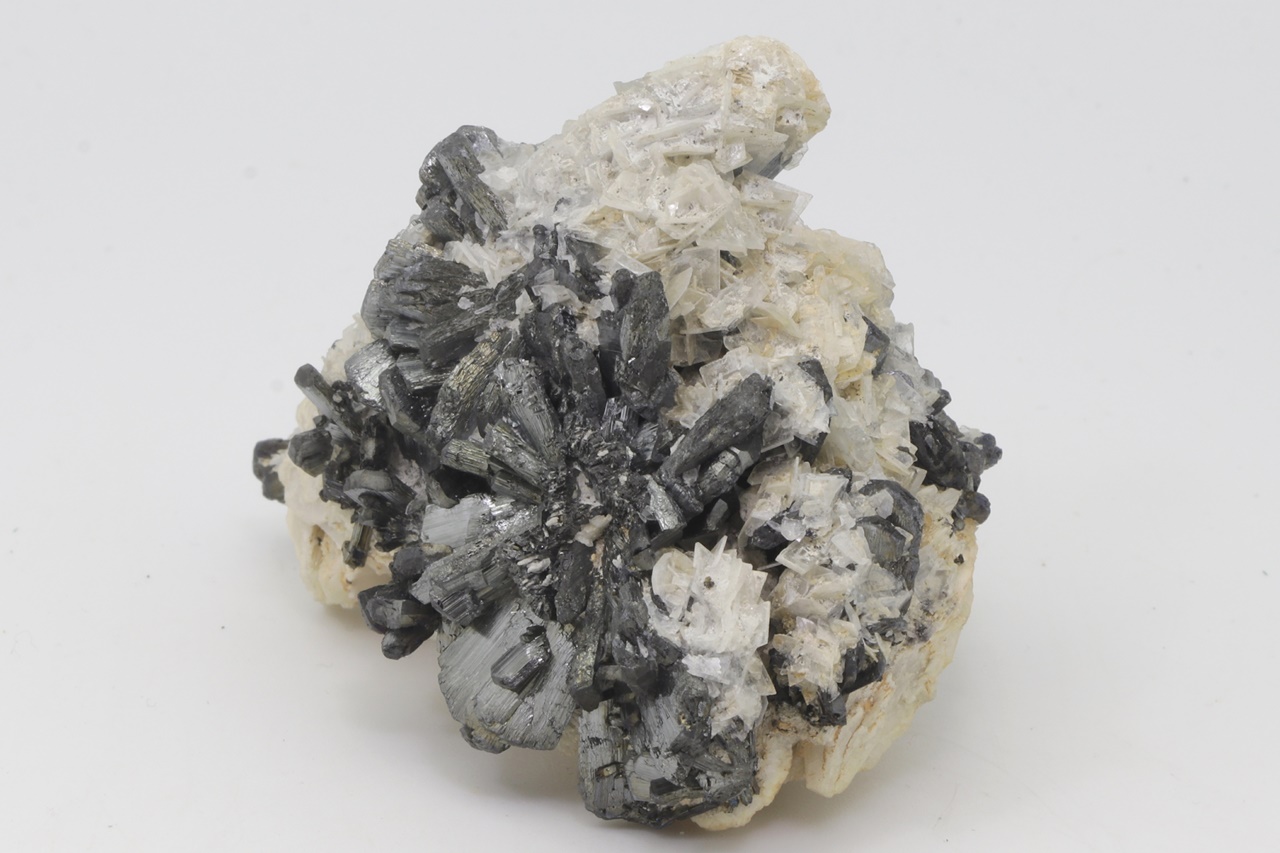 Dicke, metallisch glänzende, pyramidal abgeschlossene Antimonit-Kristalle mit charakteristischer Riefung, die eine „Blume“ bilden, überzogen von tabularen Kristallen des weißen Baryts.