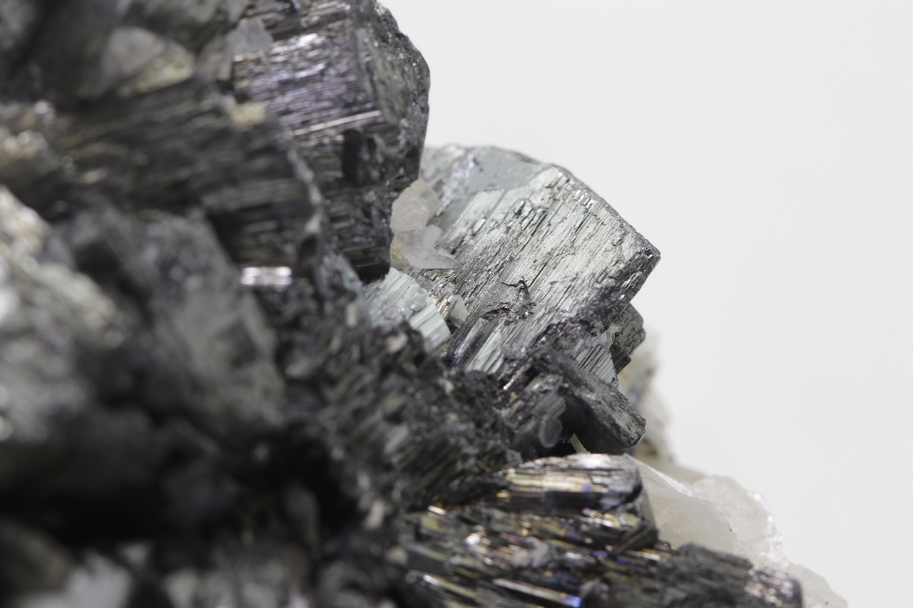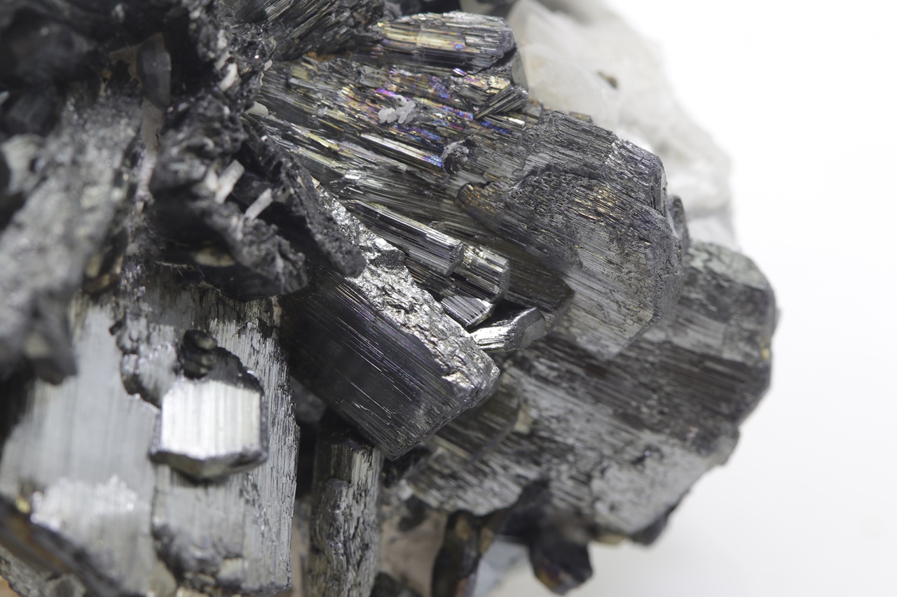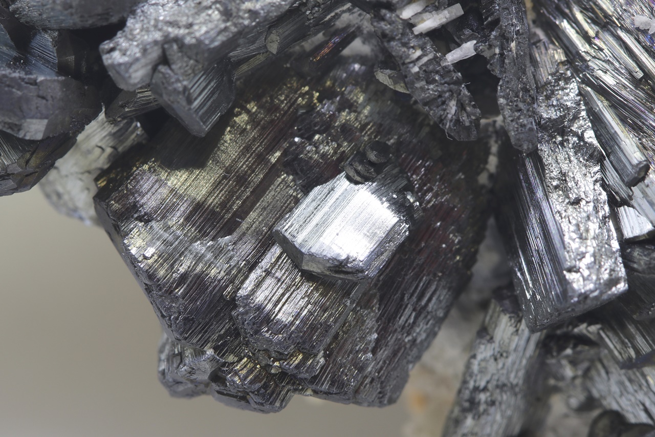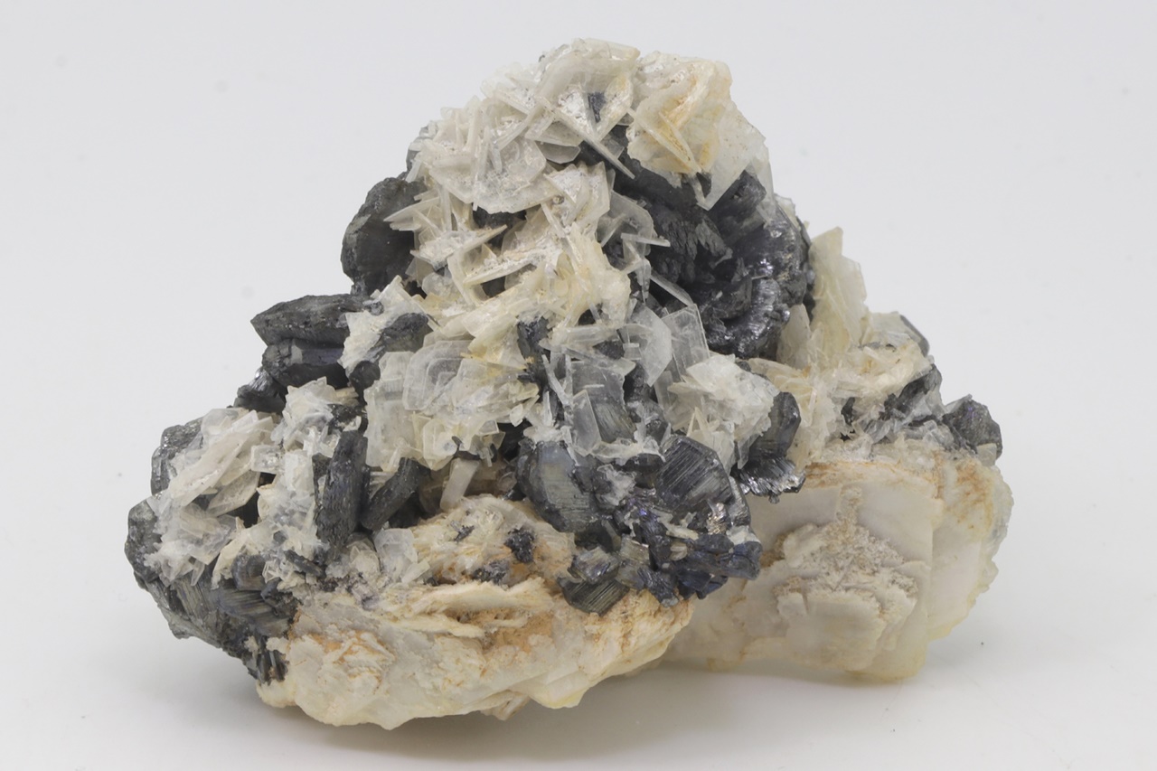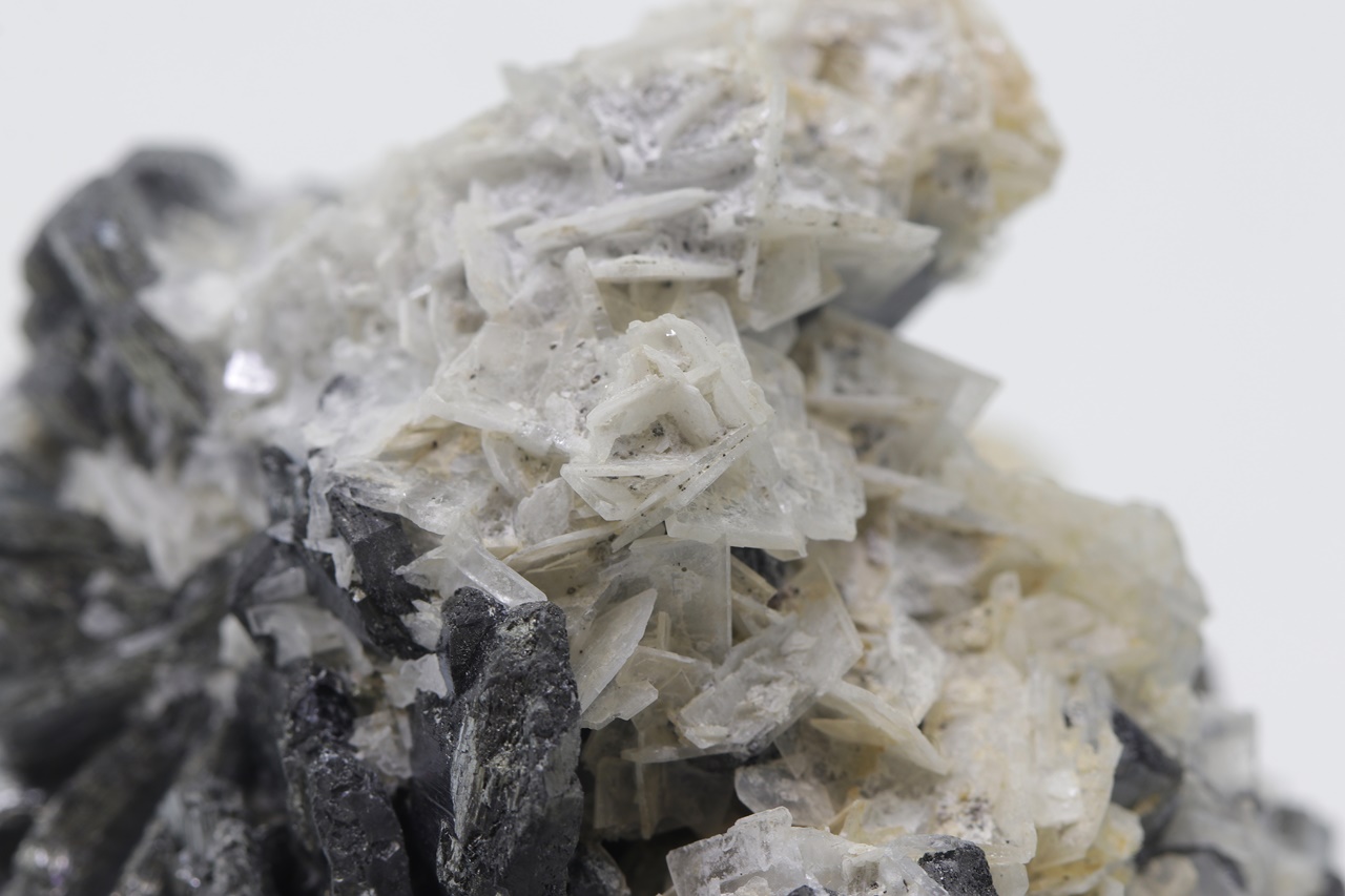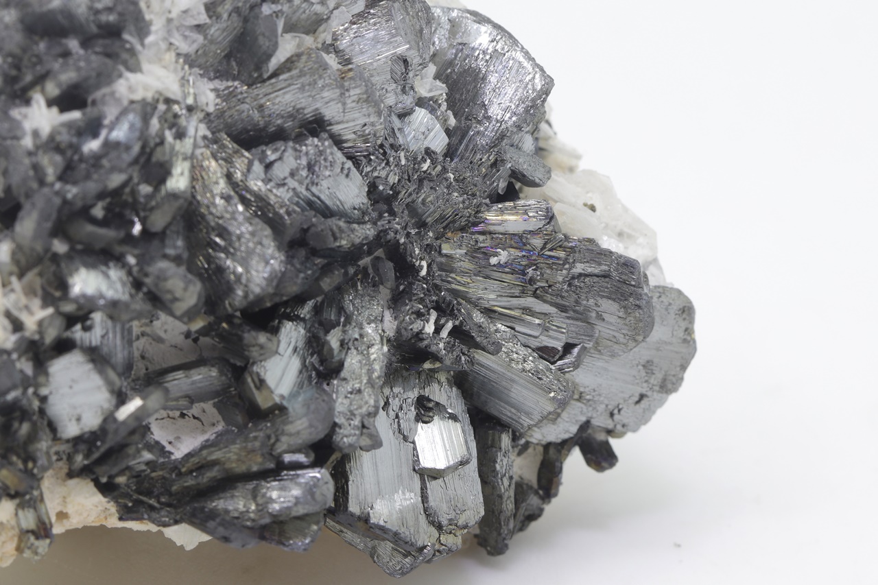 Dicke, metallisch glänzende, pyramidal abgeschlossene Antimonit-Kristalle mit charakteristischer Riefung, die eine „Blume“ bilden, überzogen von tabularen Kristallen des weißen Baryts.