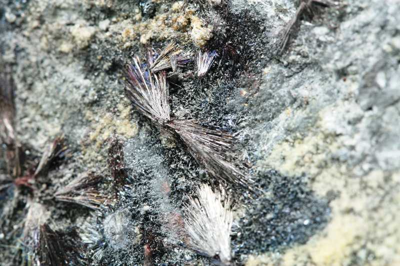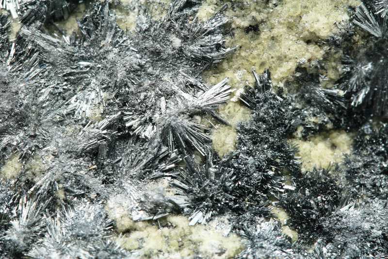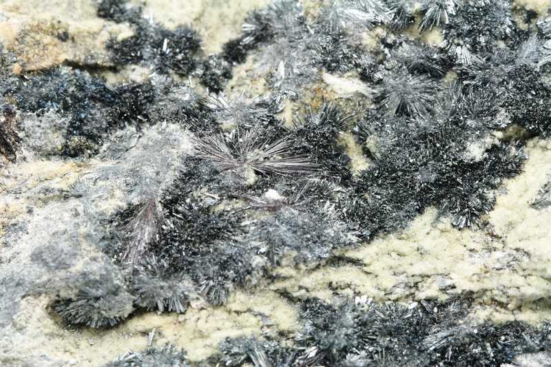 Wunderschönes Exemplar von Antimonit und Kermesit aus der Lokalität Pezinok, SR. Eine Probe von metallisch glänzenden, radialen Kristallen von Antimonit und Kermesit, bis zu 11 mm lang. Die Probe ist intakt, massiv und sehr gut erhalten.