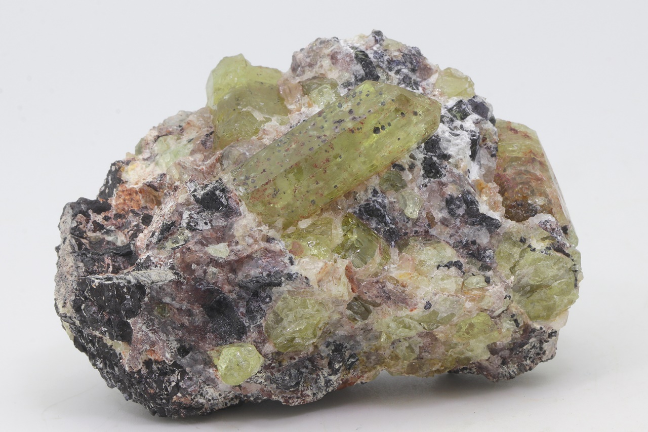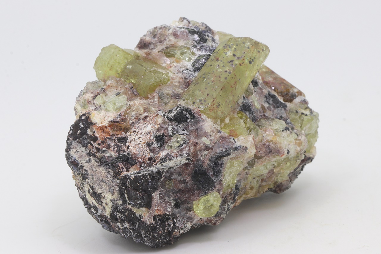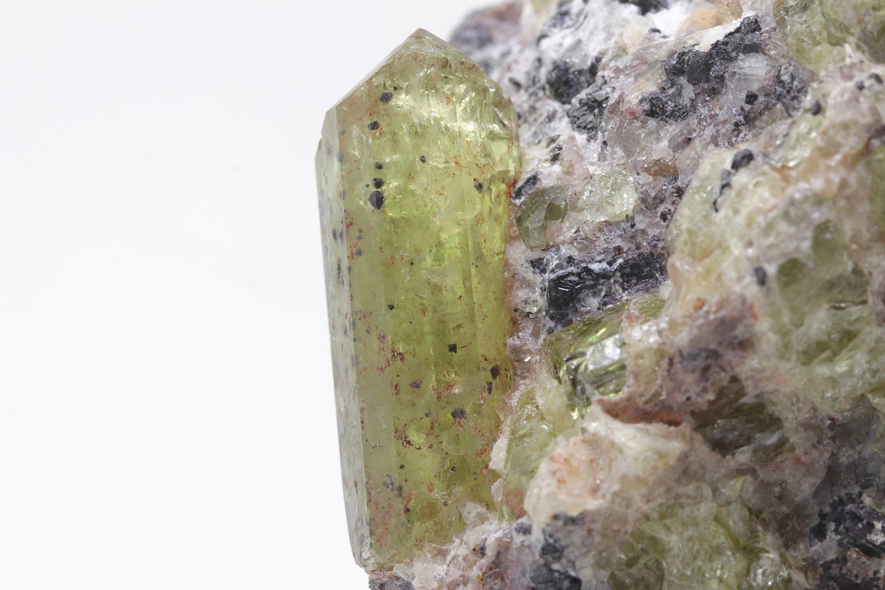 Intensiv gelber, 3,5 cm großer Apatitkristall, der aus dem Muttergestein herauspräpariert wurde. Die Probe ist auf der Unterseite abgeschnitten.