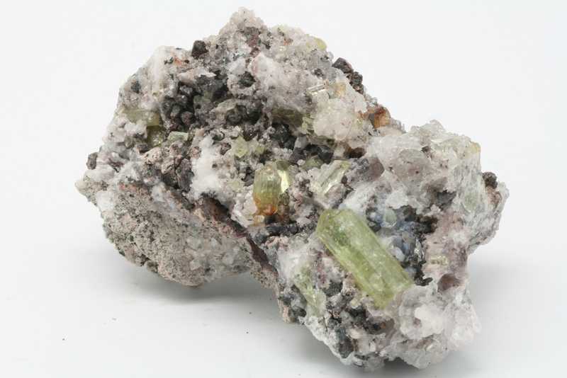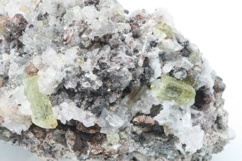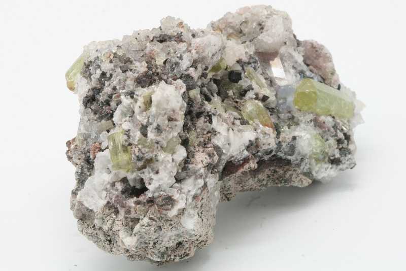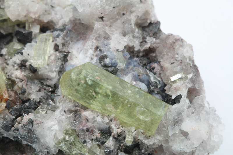 Kristalle von Apatit aus Mexiko. Grüne, glänzende, eingewachsene Apatite mit einer Größe von bis zu 21 mm.