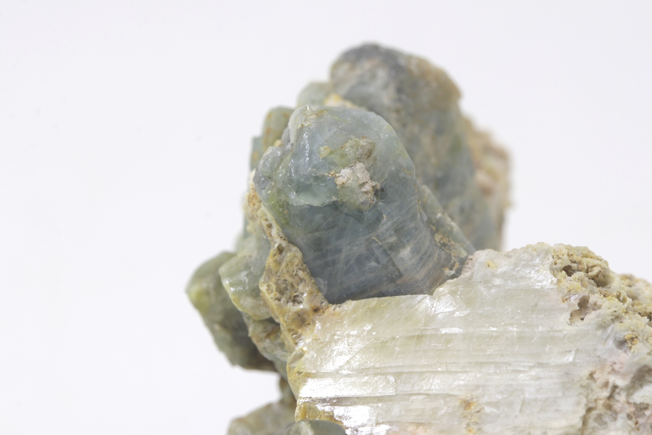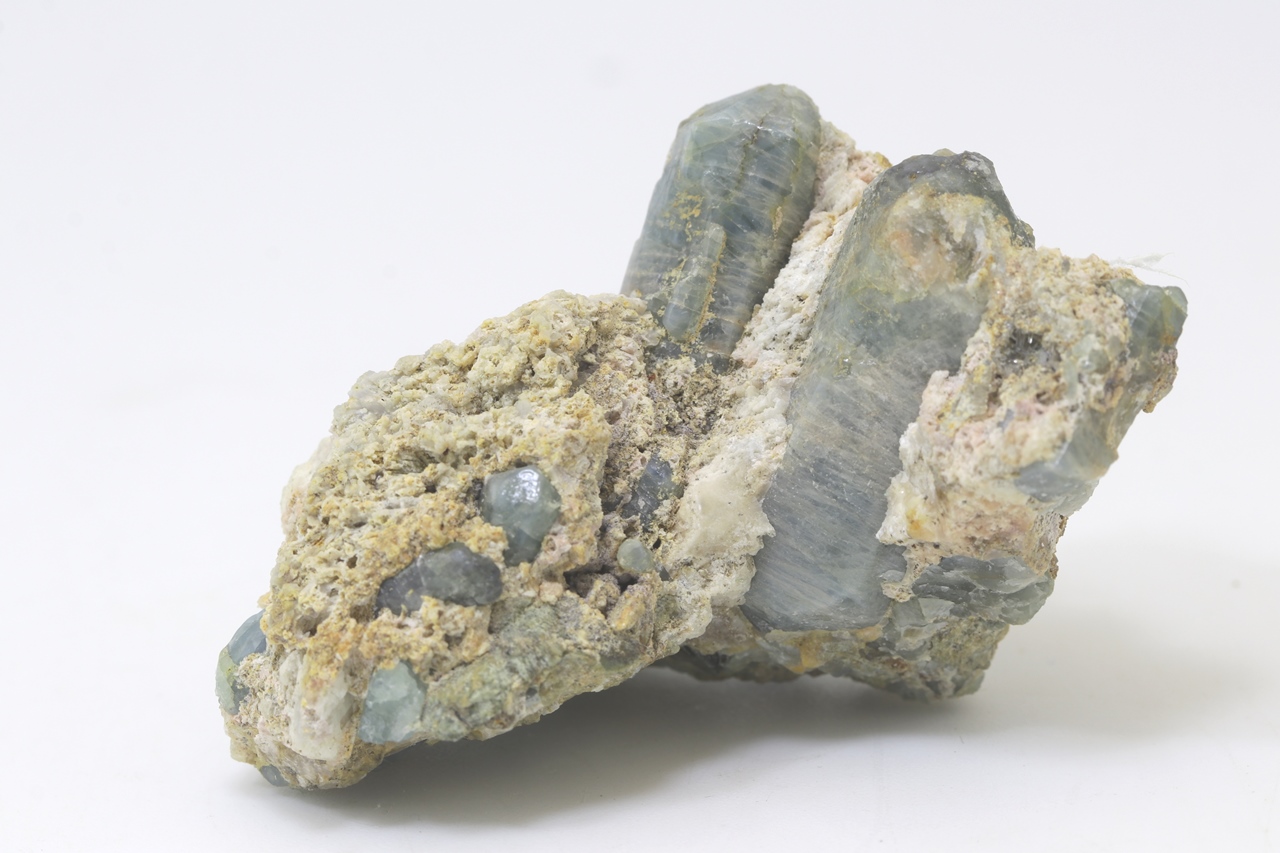 Hellblaue Apatit-Kristalle bis zu 3,5 cm groß in hellem Kalkit von einem bekannten Fundort.