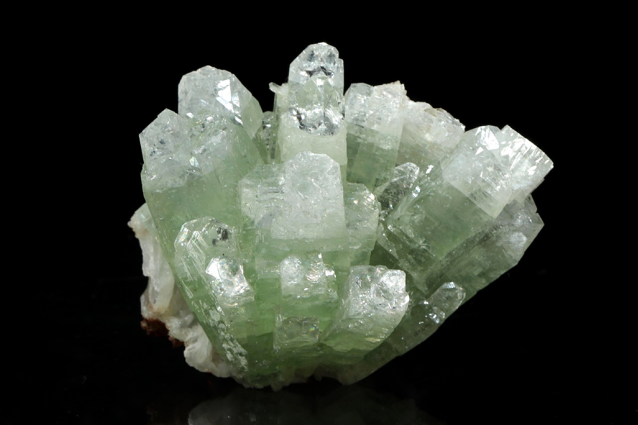 Sehr glänzende, säulenförmige Kristalle von hellgrünem Apophyllit mit klaren, durchsichtigen Spitzen bis zu 4 cm Größe.