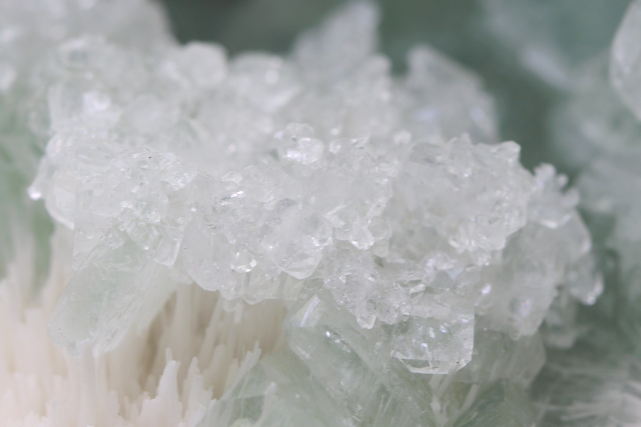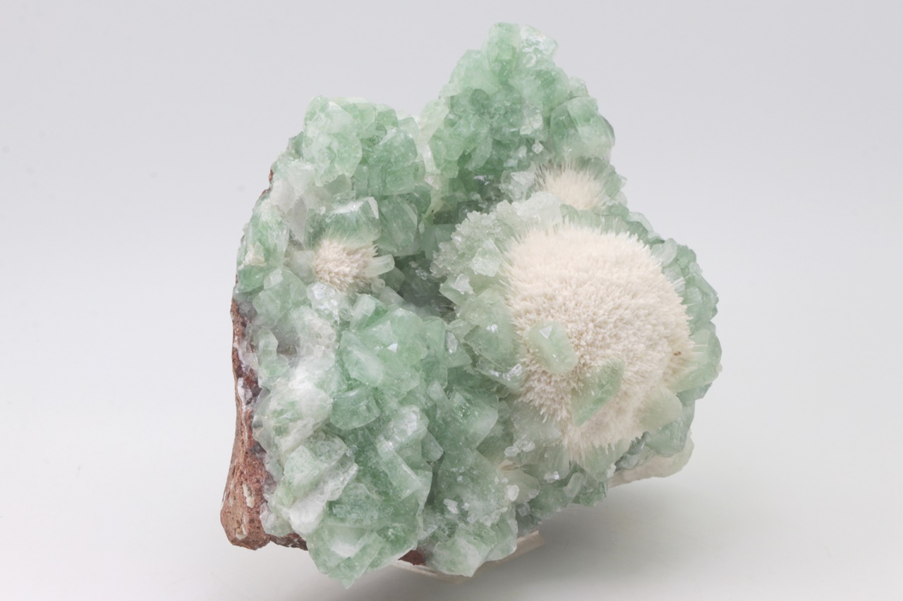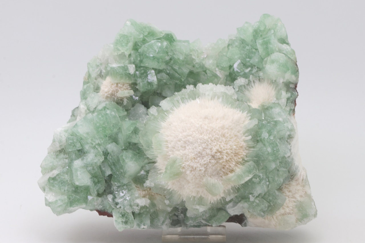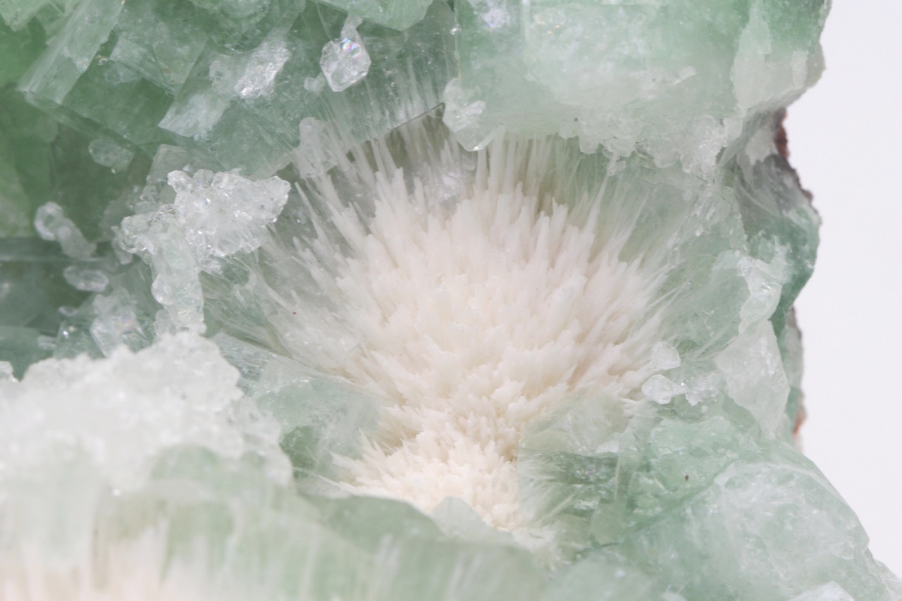 Große, radiale Aggregate von weißem Mesolith, überwachsen mit blassgrünem, glänzendem Apophyllit. Das größte Mesolith-Aggregat ist 6 cm groß. Ein unbeschädigtes Exemplar von Museumsqualität.
