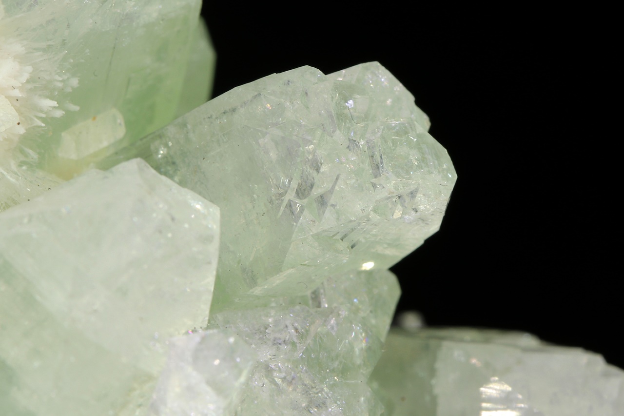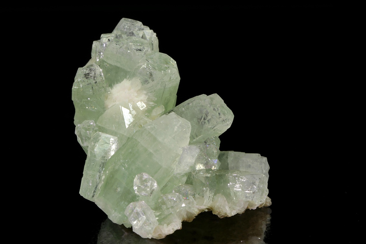 Ästhetische Druse von hellgrünen, glänzenden Apophyllit Kristallen mit einem Büschel von weißem Mesolith.