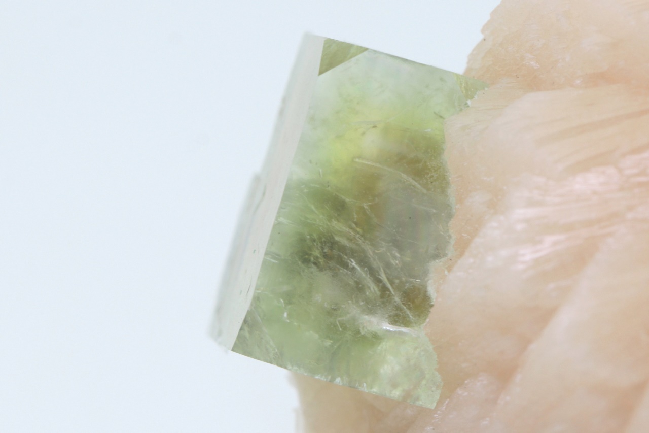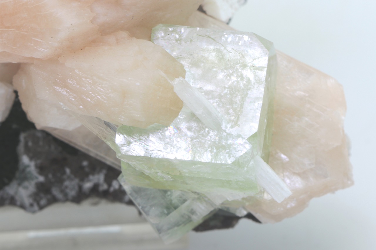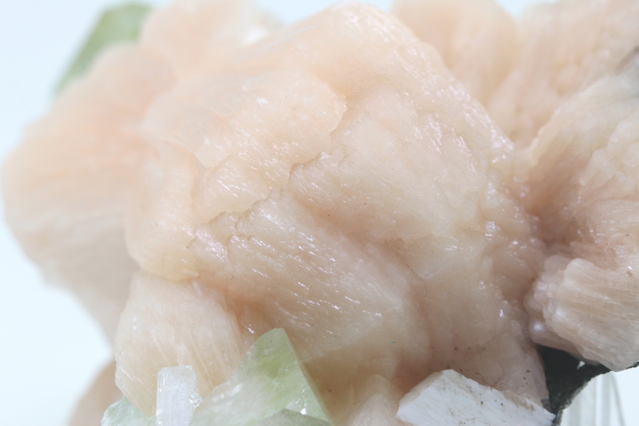 Ästhetische Probe von hell orangefarbenem Stilbit, der auf einer Basaltmatrix gewachsen ist und einen beidseitigen „Fächer“ (9 cm lang) bildet, zusammen mit grünen Pseudokubukeln von Apophyllit und weißem Laumontit .