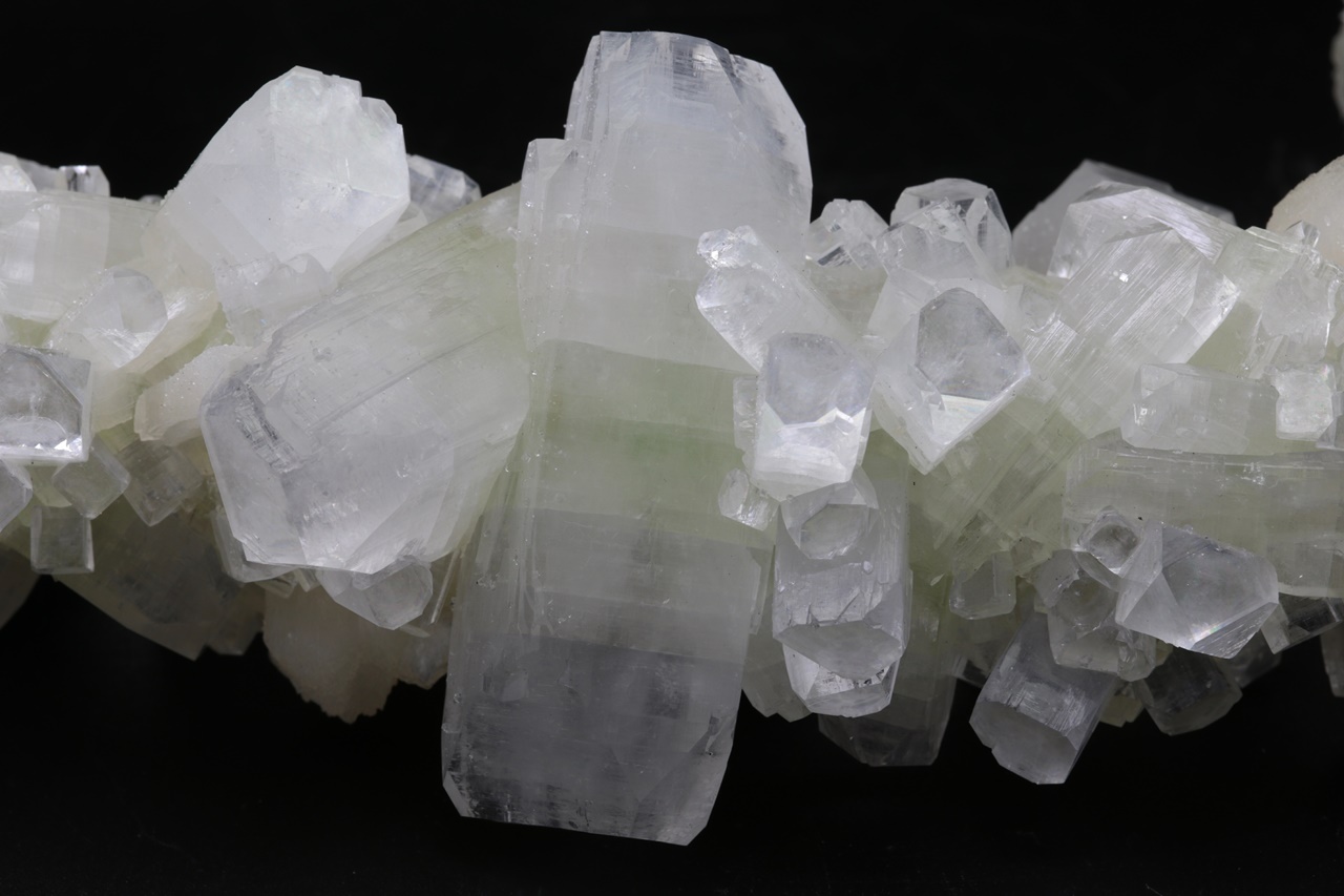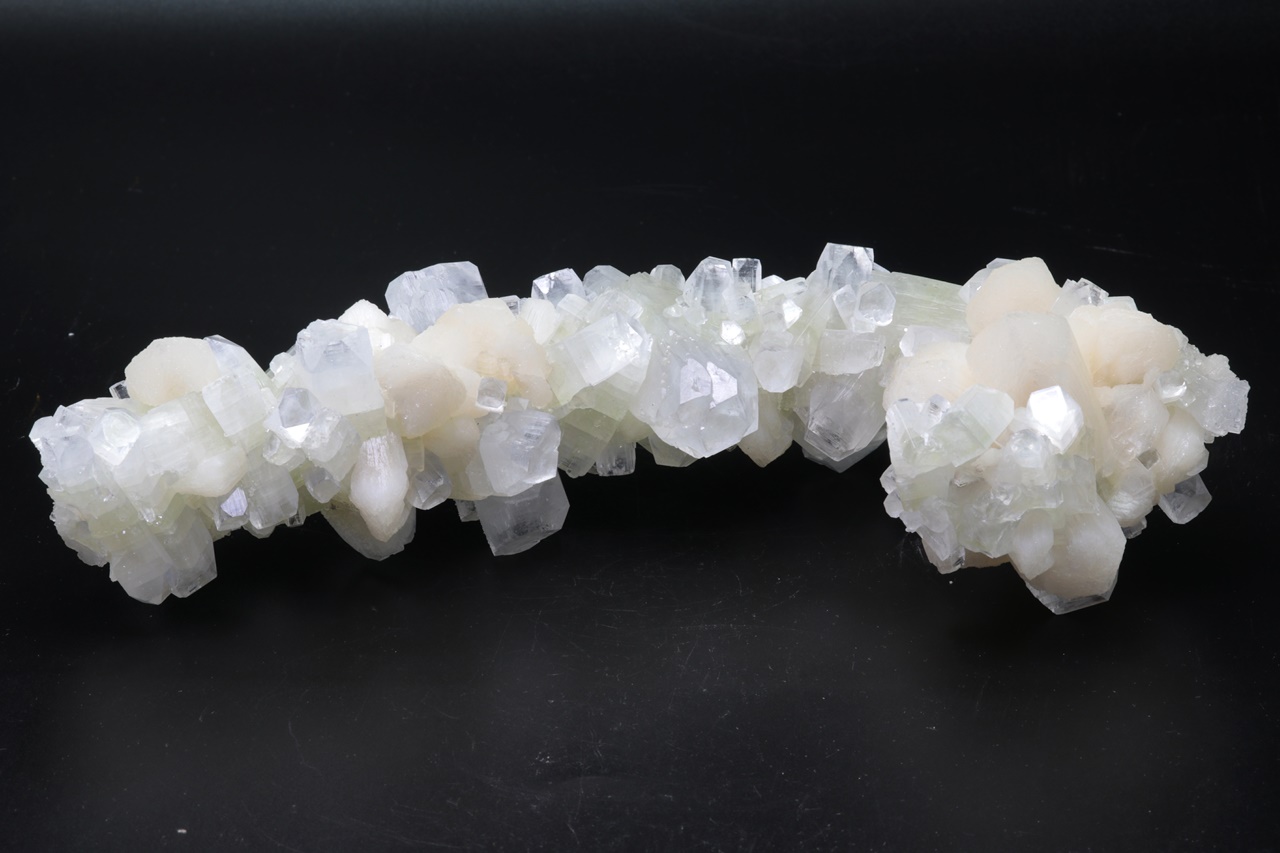 Von allen Seiten abgeschlossener Cluster von glänzenden, grünlich bis klaren Apophyllit-Kristallen mit hellem Stilbit. Der größte Apophyllit-Kristall ist 6 cm groß. Unbeschädigtes Exemplar von Museumsqualität.
