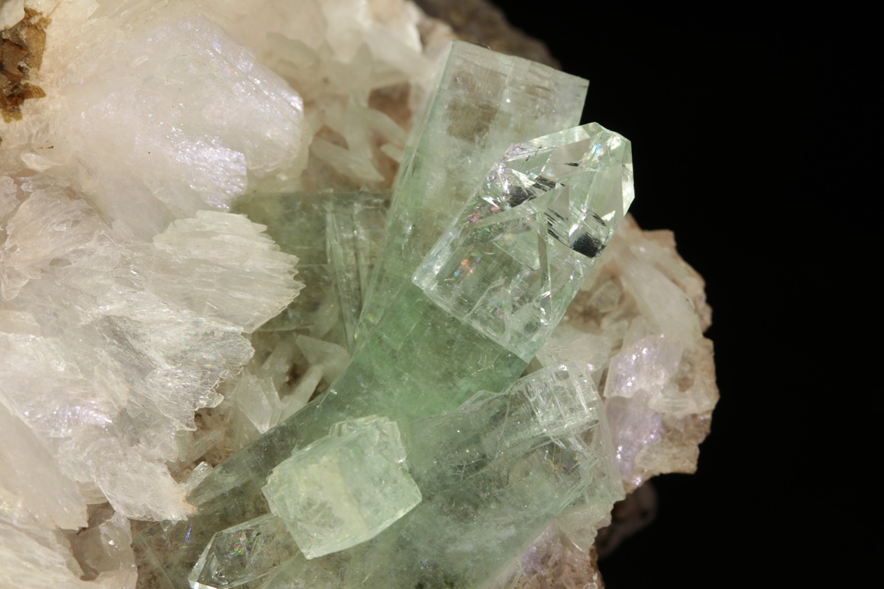 Hellgrüne, glänzende Apophyllit-Kristalle bis zu 2 cm Größe mit weißem Stilbit.