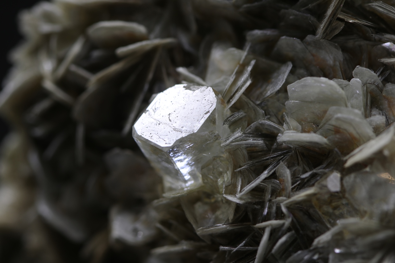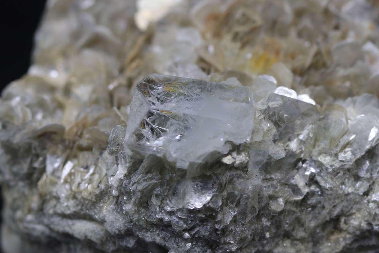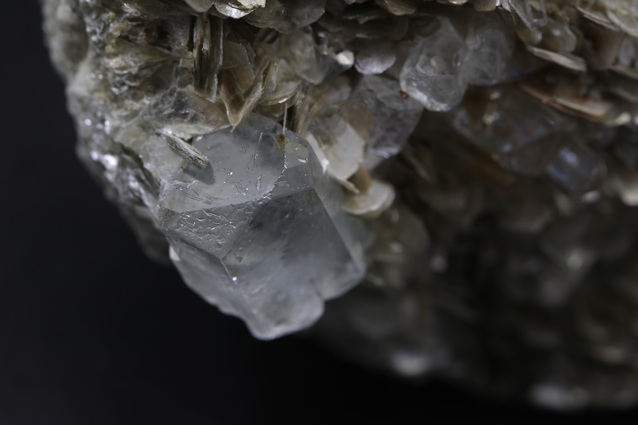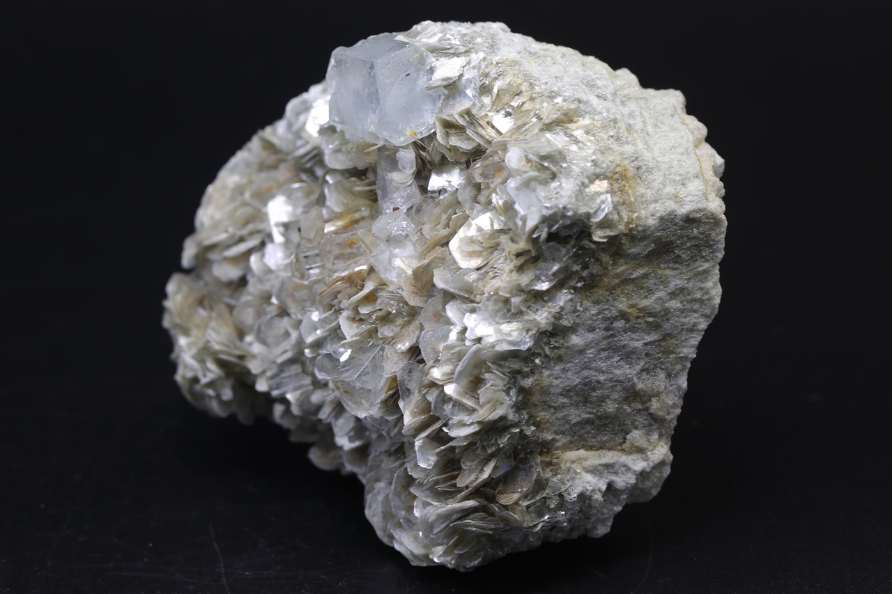 Ein hellblauer Aquamarin der Größe 20 x 16 x 10 mm dominiert diese Probe, auf der sich noch neun weitere, kleinere Aquamarine verschiedener Schattierungen befinden. Alle hexagonalen, kurz säulenförmigen Aquamarin-Kristalle sind in unmittelbarer Nachbarschaft zu blättrigen Muscovit-Kristallen.