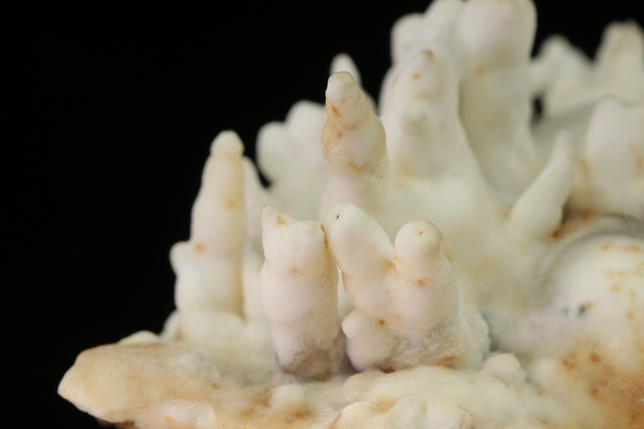 Weiße Tropfsteinaggregate aus Aragonit sind für diesen Standort charakteristisch.