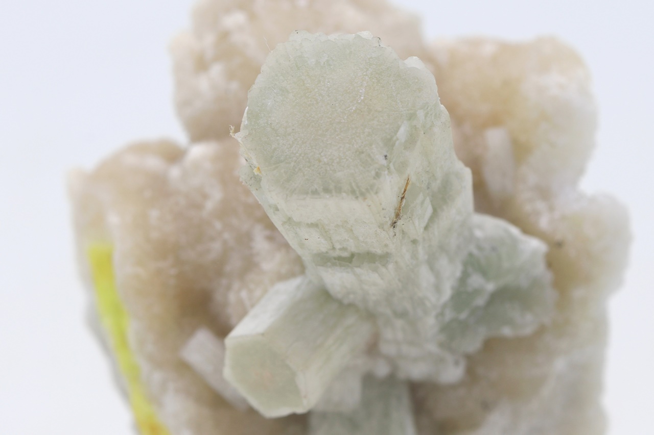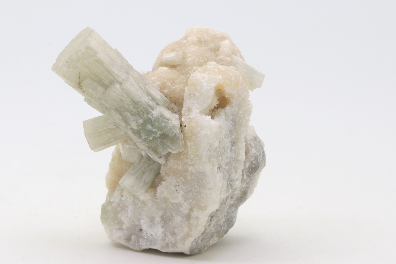Blaulich angelaufene, weiße pseudohexagonale Zwillingsbildung von Aragonit-Kristallen aus einem bekannten sizilianischen Fundort. Der größte Kristall ist 3,5 cm groß.